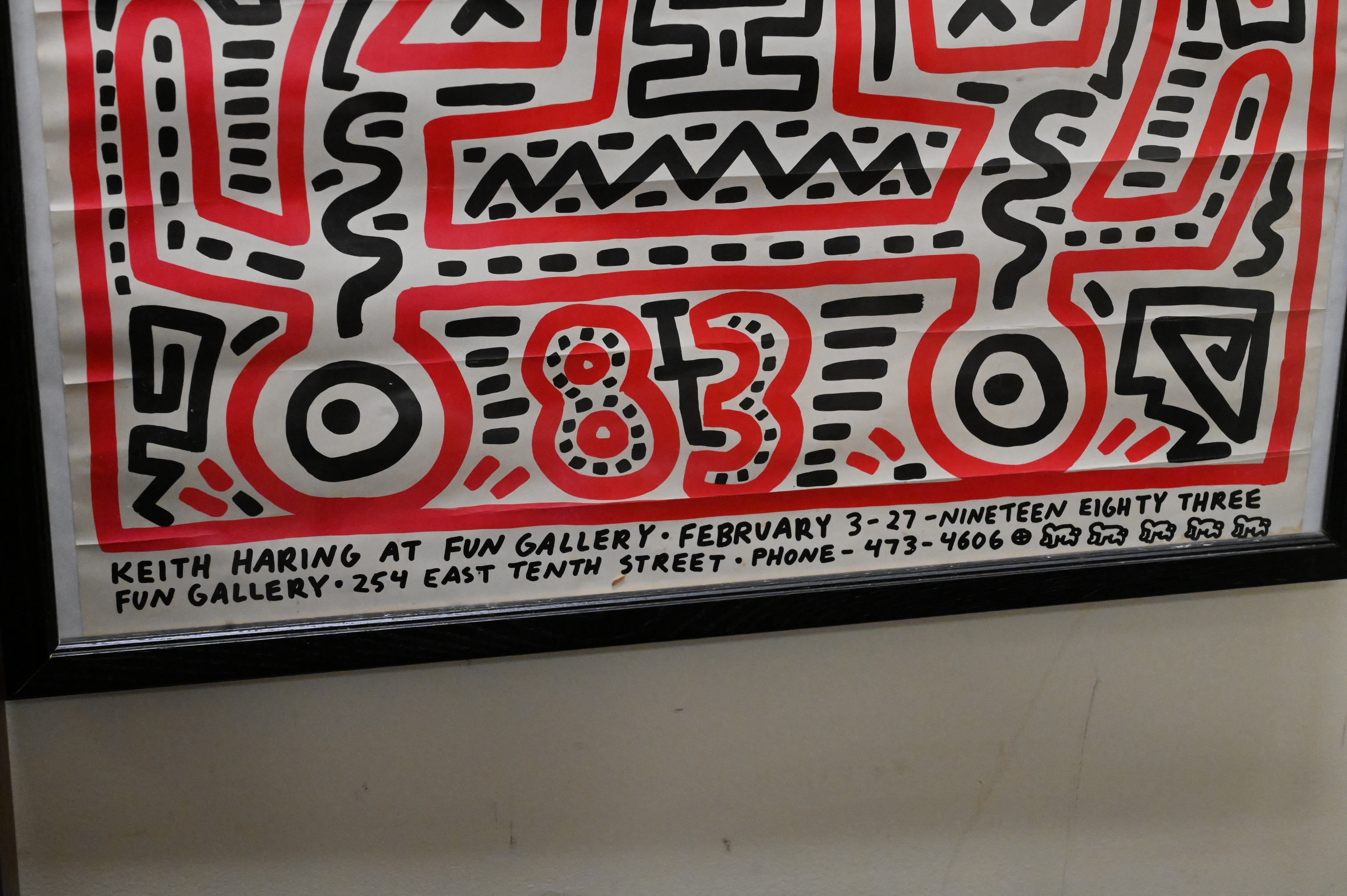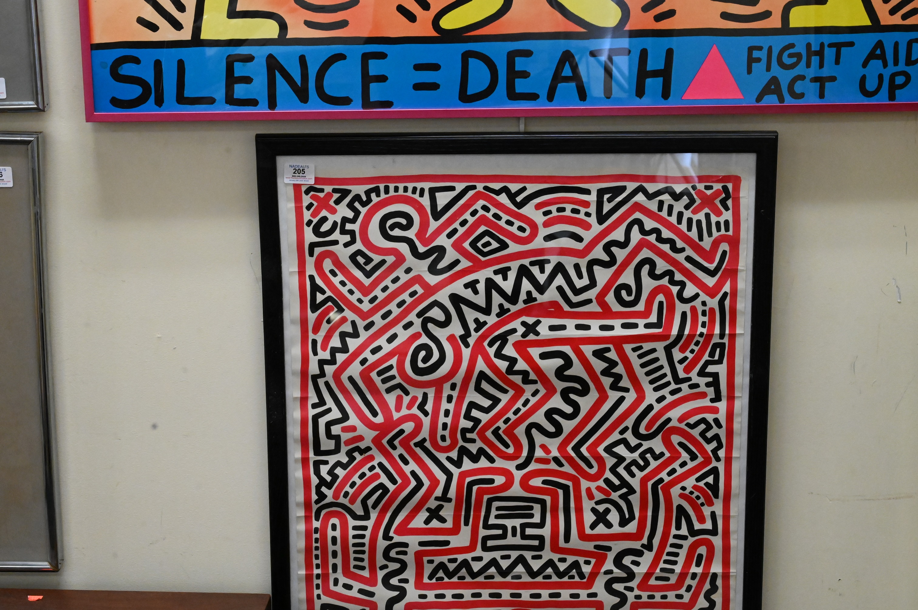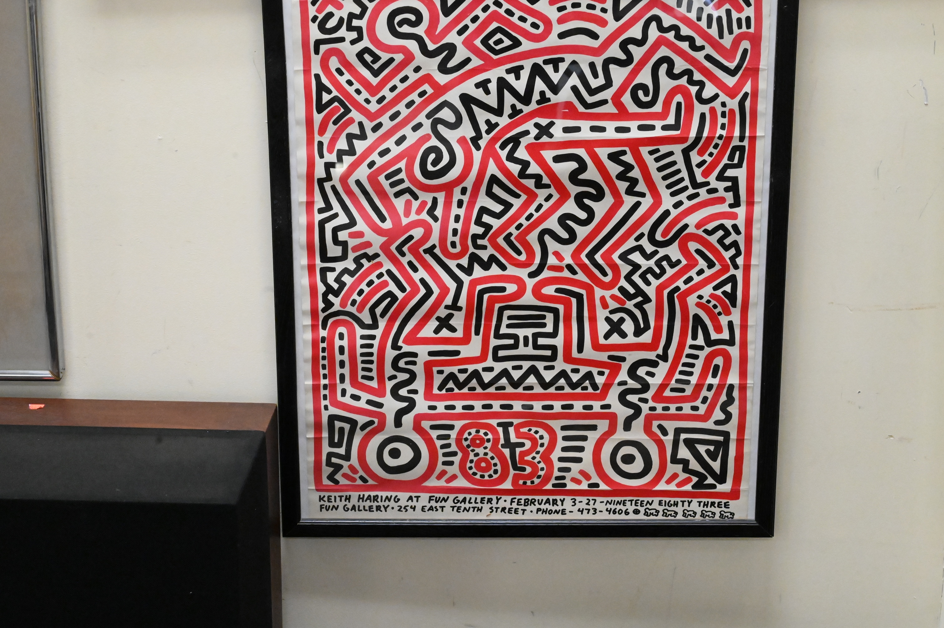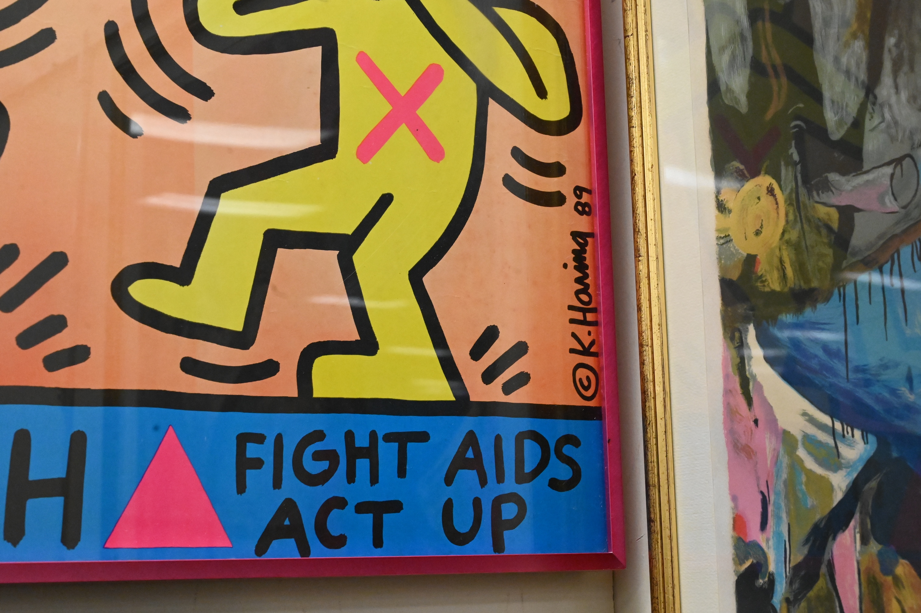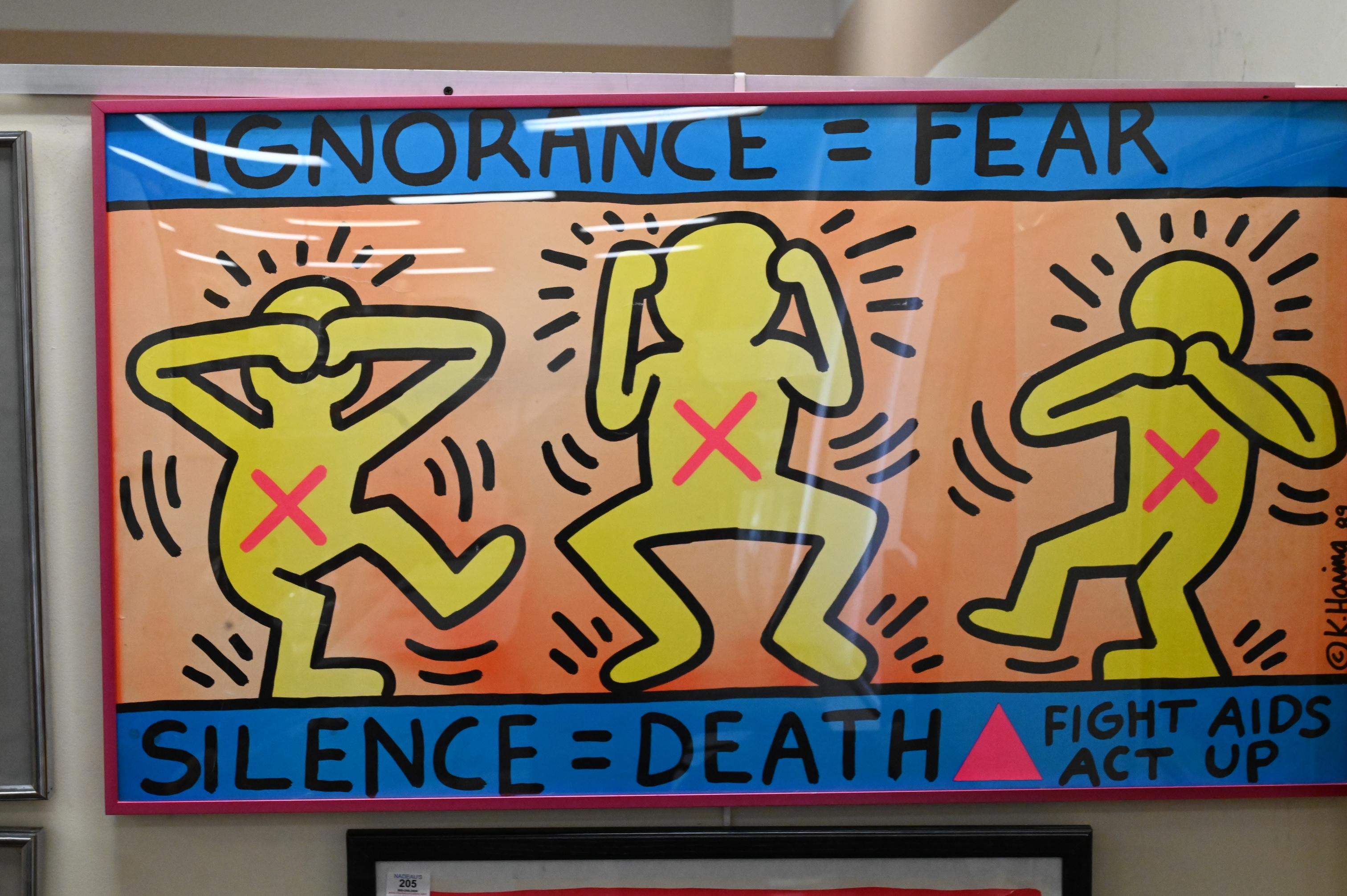 Two Keith Haring (1958 – 1990), “Keith Haring at the Fun Gallery”, 29″ x 23″; along with Ignorance = Fear, Silence = Death, 23 1/2″ x 42 1/2″.