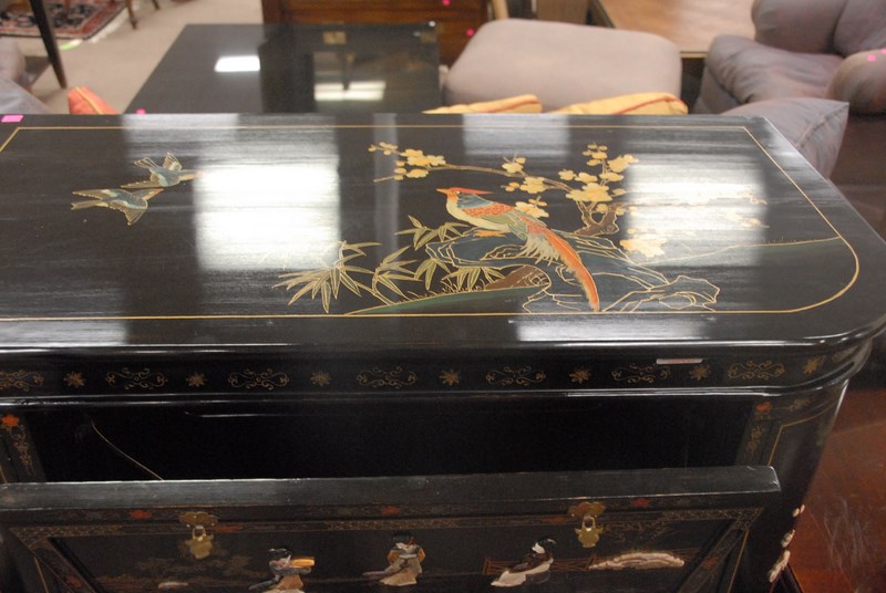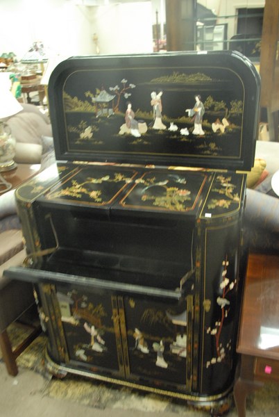 Lot 205: Two piece lot to include Oriental style bar/cabinet with three dimensional figures and small Oriental cabinet.