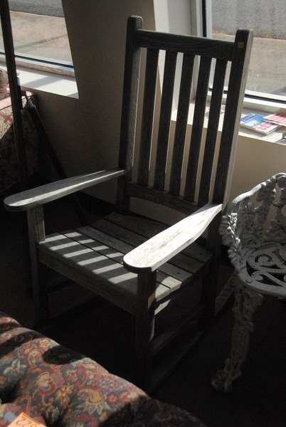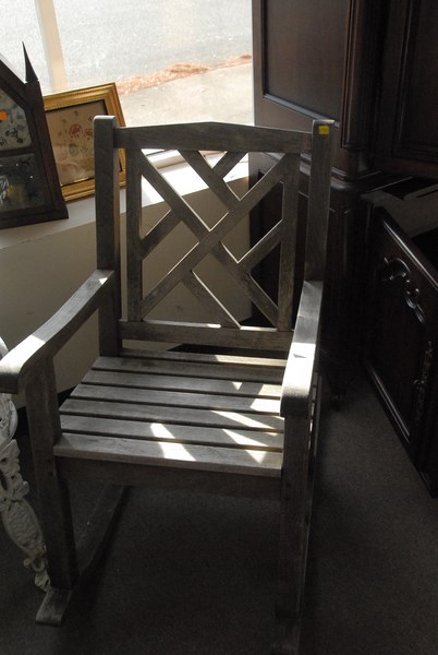 Two teak outdoor rocking chairs.
