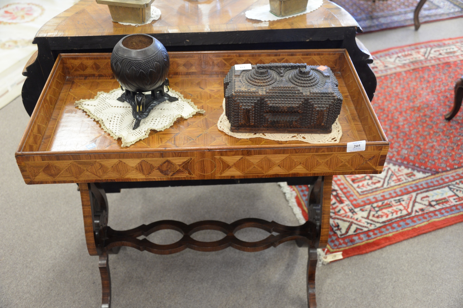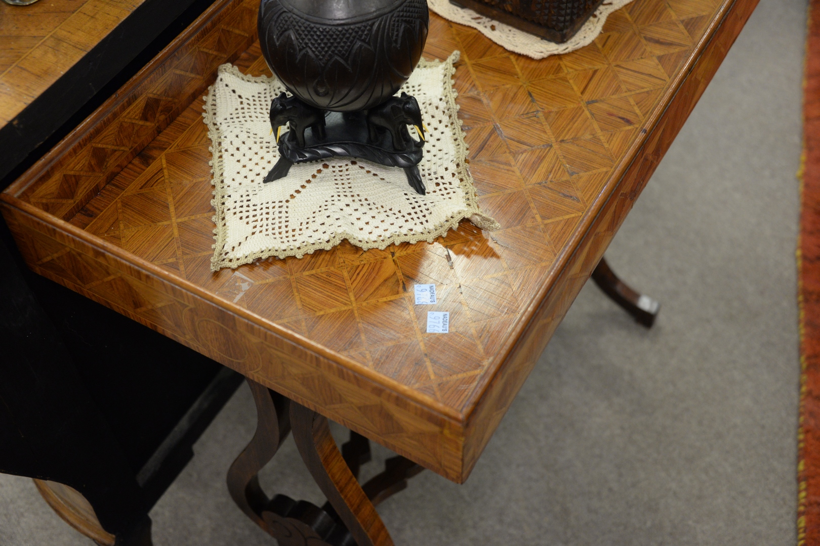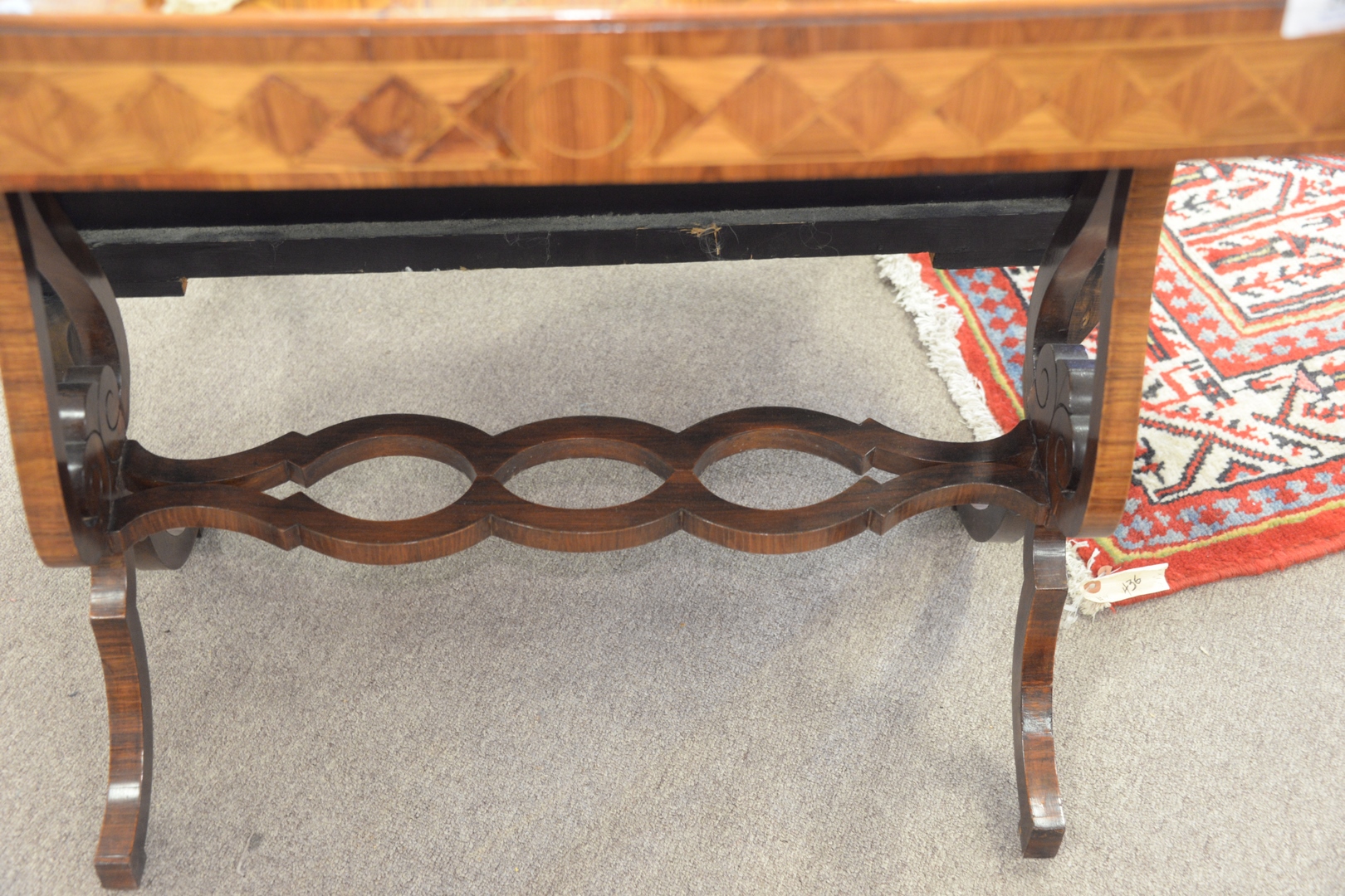 Lot 205: Victorian Style Bar Table, with parquetry inlaid top, having lyre supports, height 29 inches, top 15 1/2 x 30.
