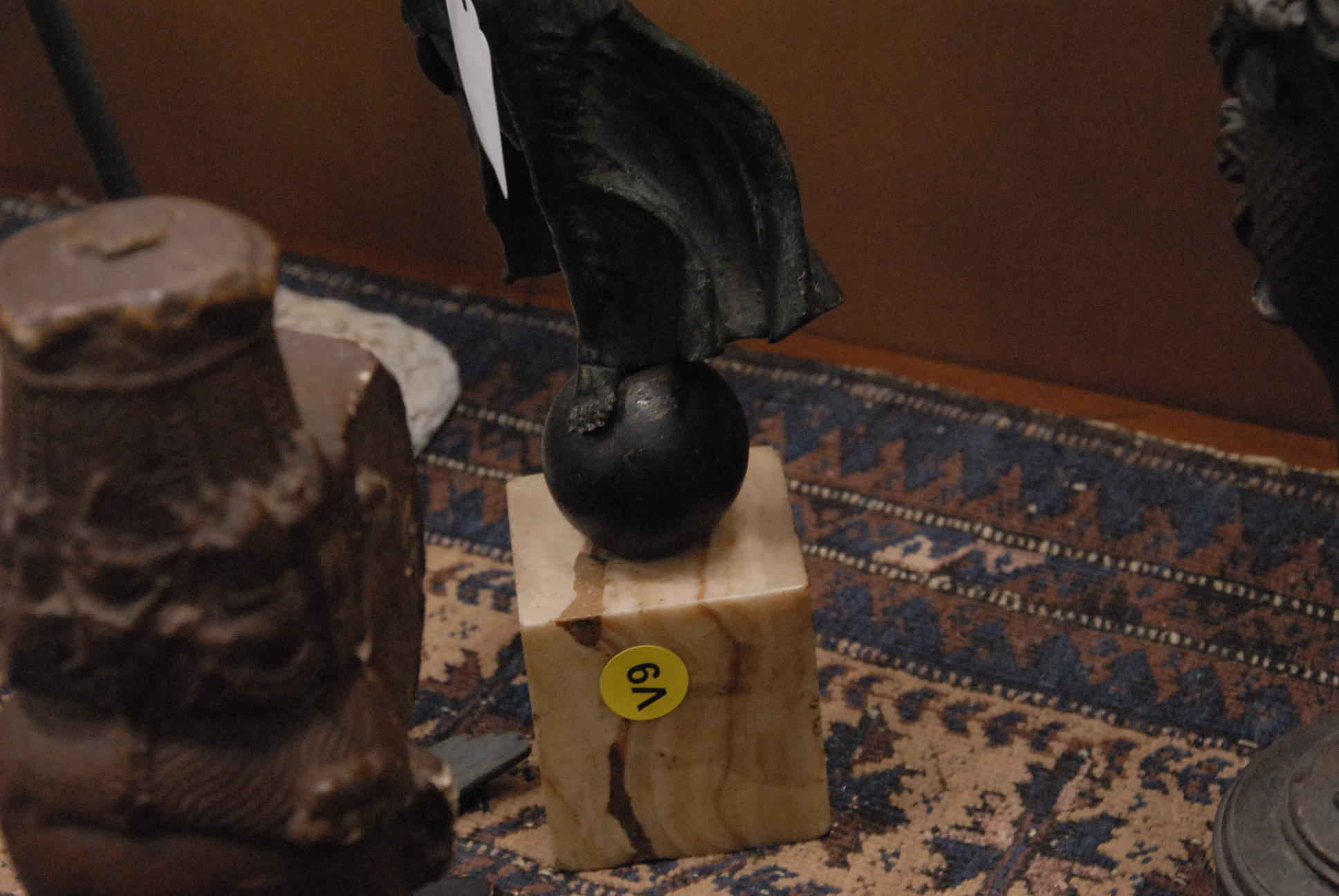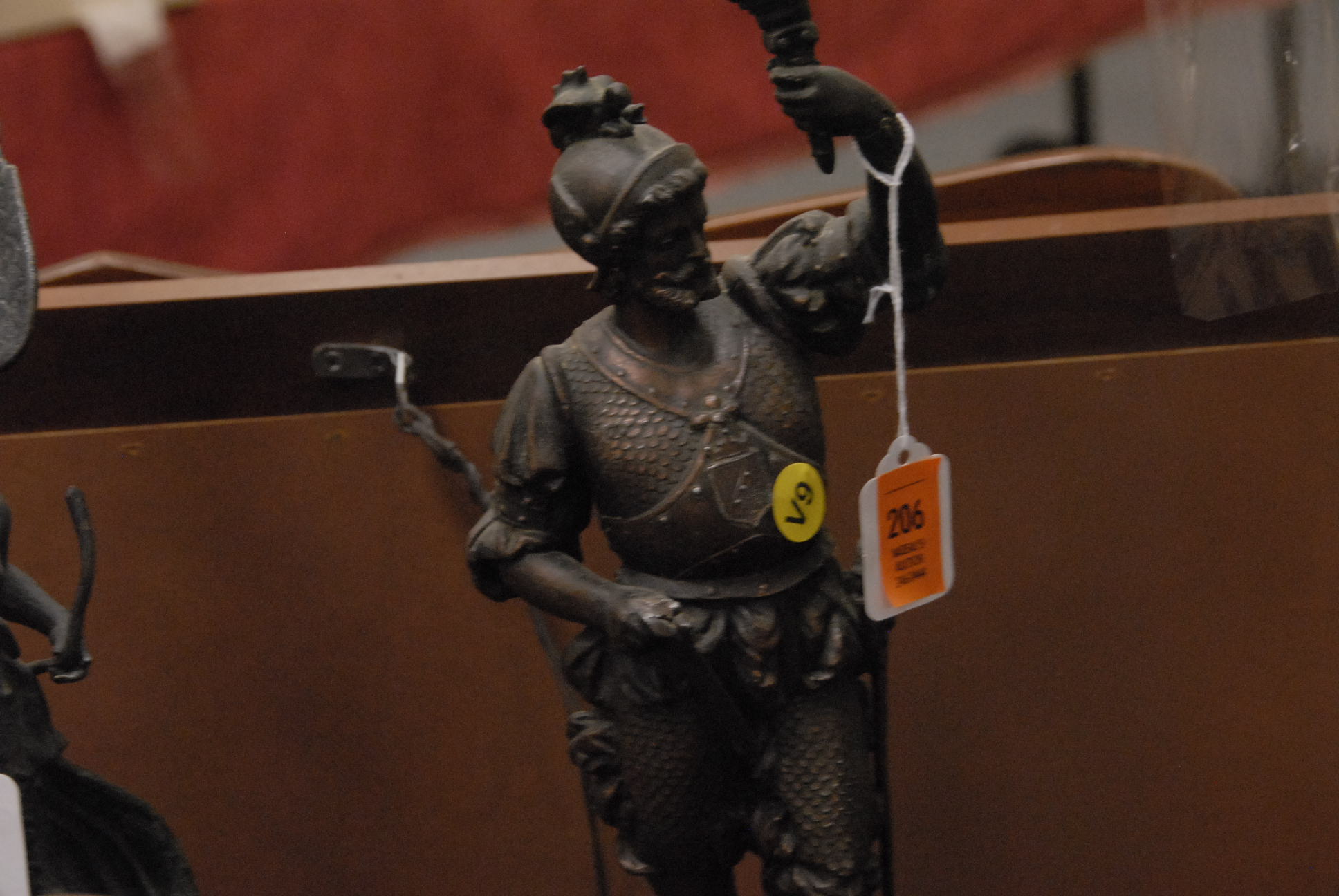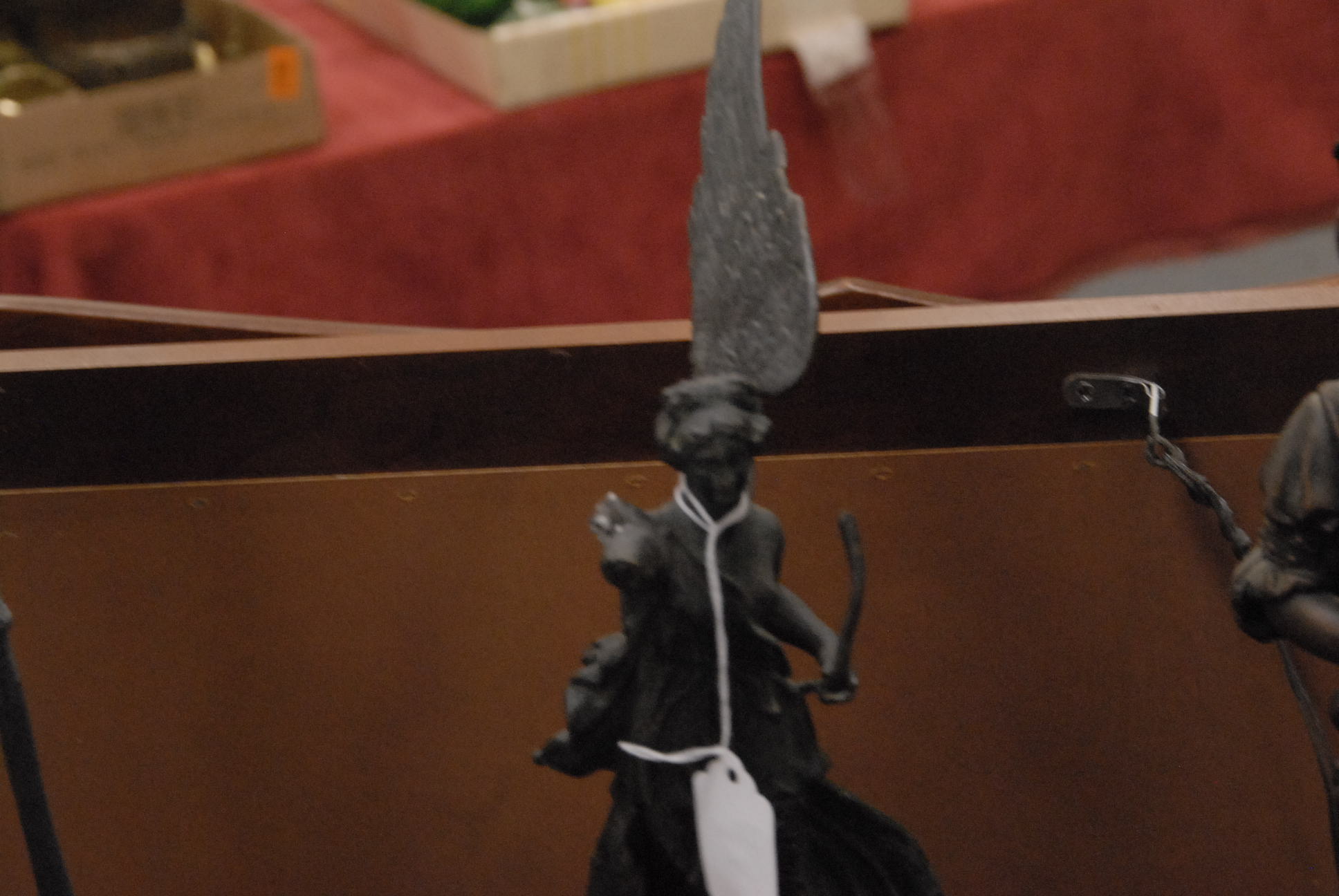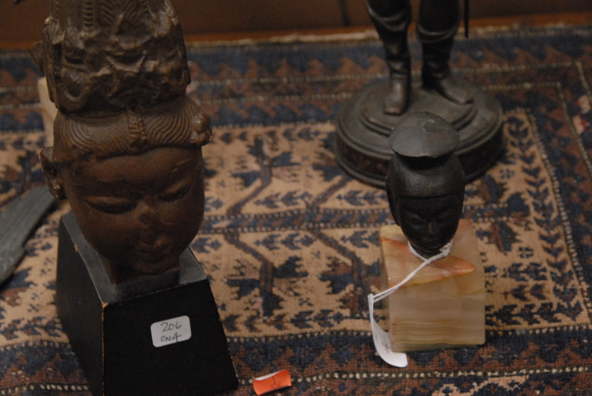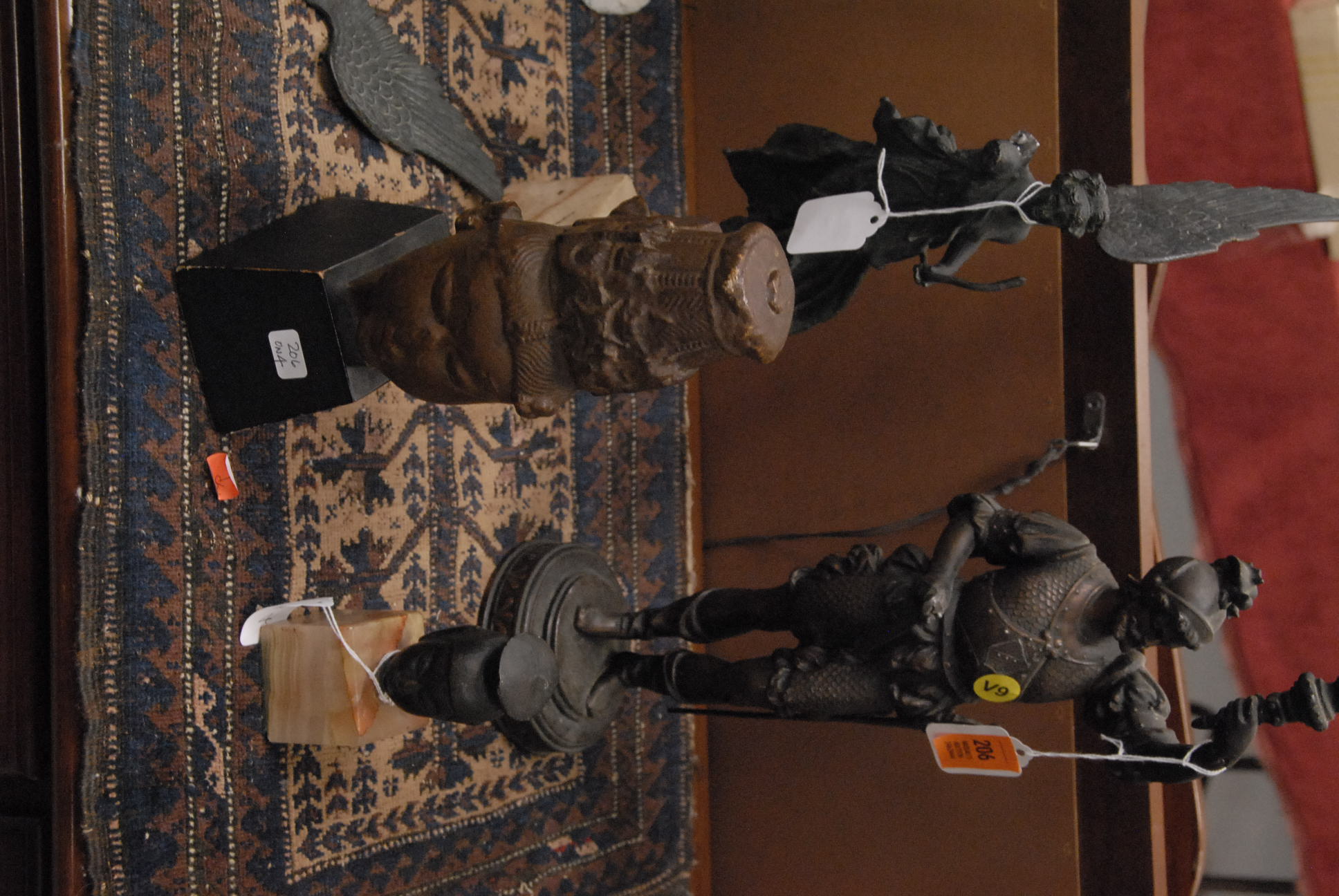 A group lot to include a small bronze head on a marble pedestal, a plaster head and two white metal figures, one winged and one in armour