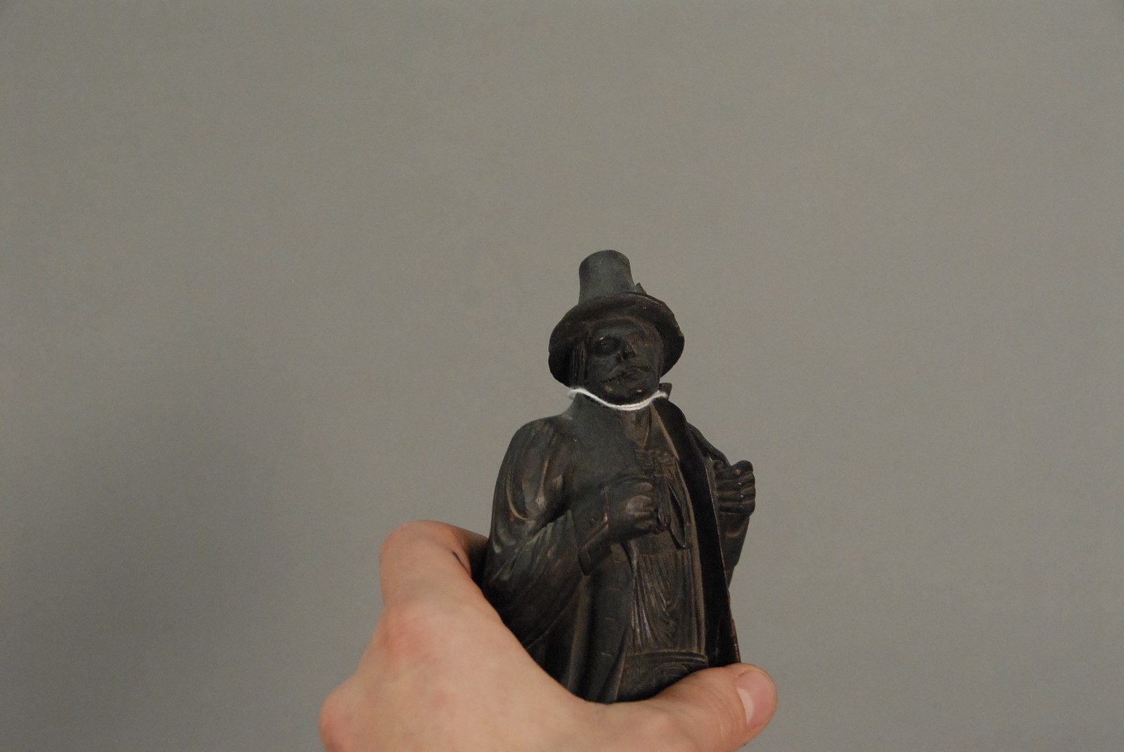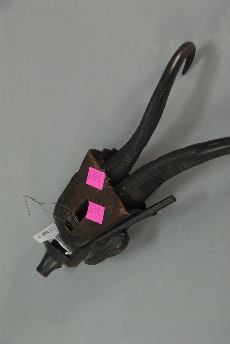 Lot 206: Black forest figural carved walnut and horn coat rack of a male figure with hat, mustache, and rifle. ht. 10 3/4 in.