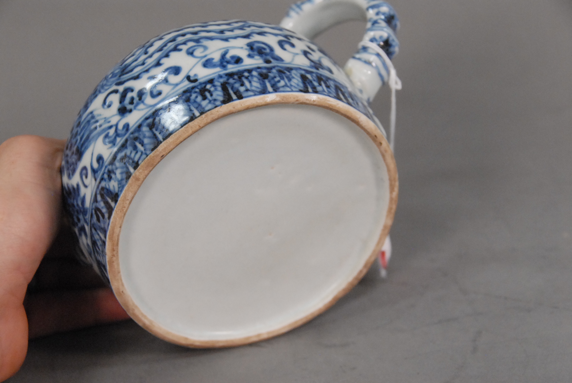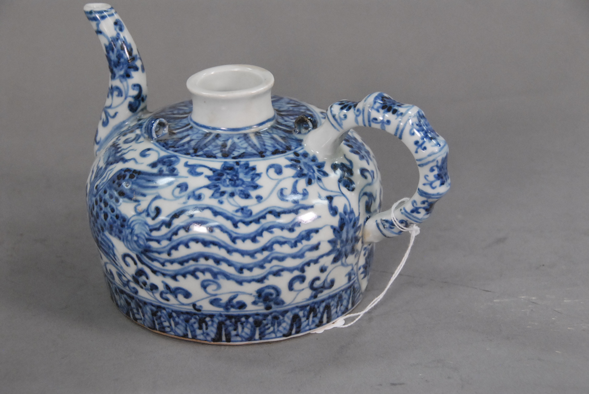 Blue and white phoenix bird teapot having flying phoenix bird and scrolling lotus painted exterior missing cover.