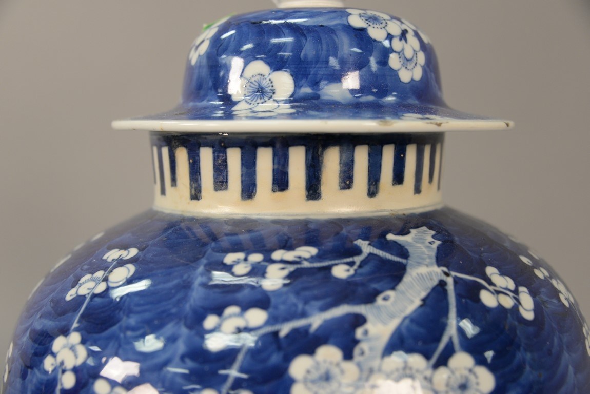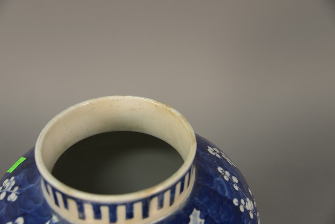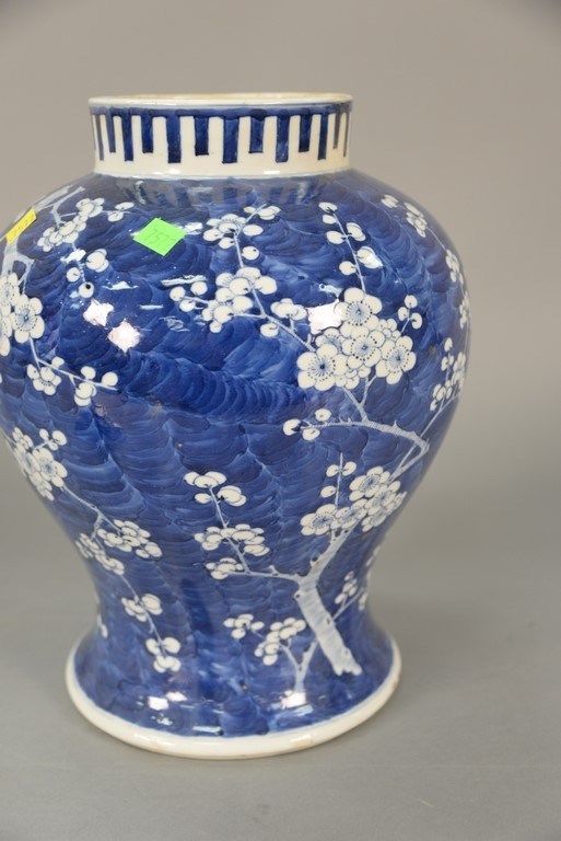 Lot 206: Chinese blue and white apple blossom ginger jar with cover as is – top rim broken and repaired and small chips on cover. ht. 17 in.