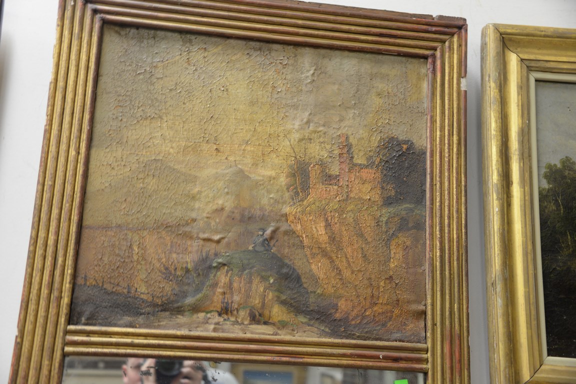 Lot 206: Continental mirror with oil on canvas top panel of castle, probably 18th century paint loss, ht. 52 in.