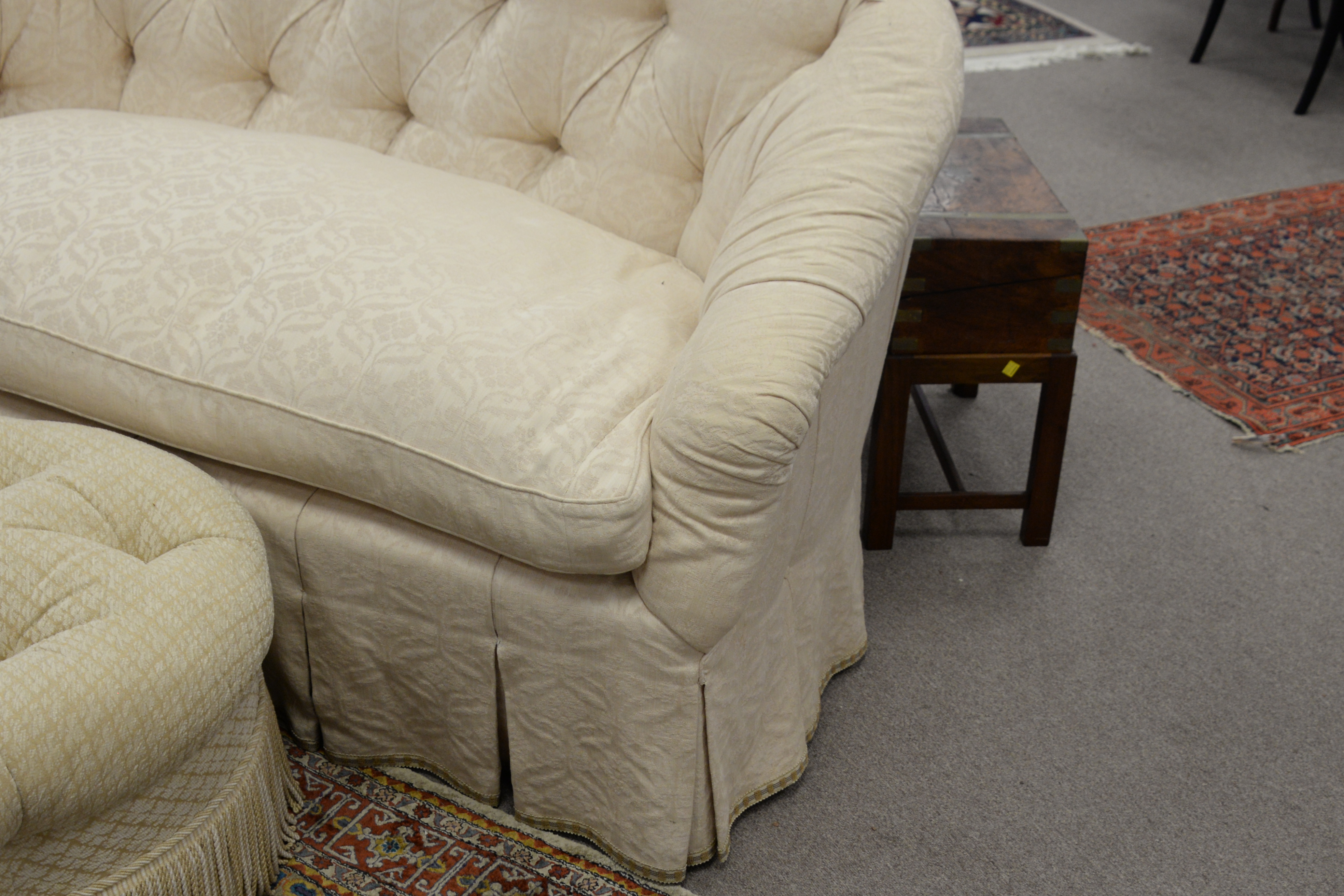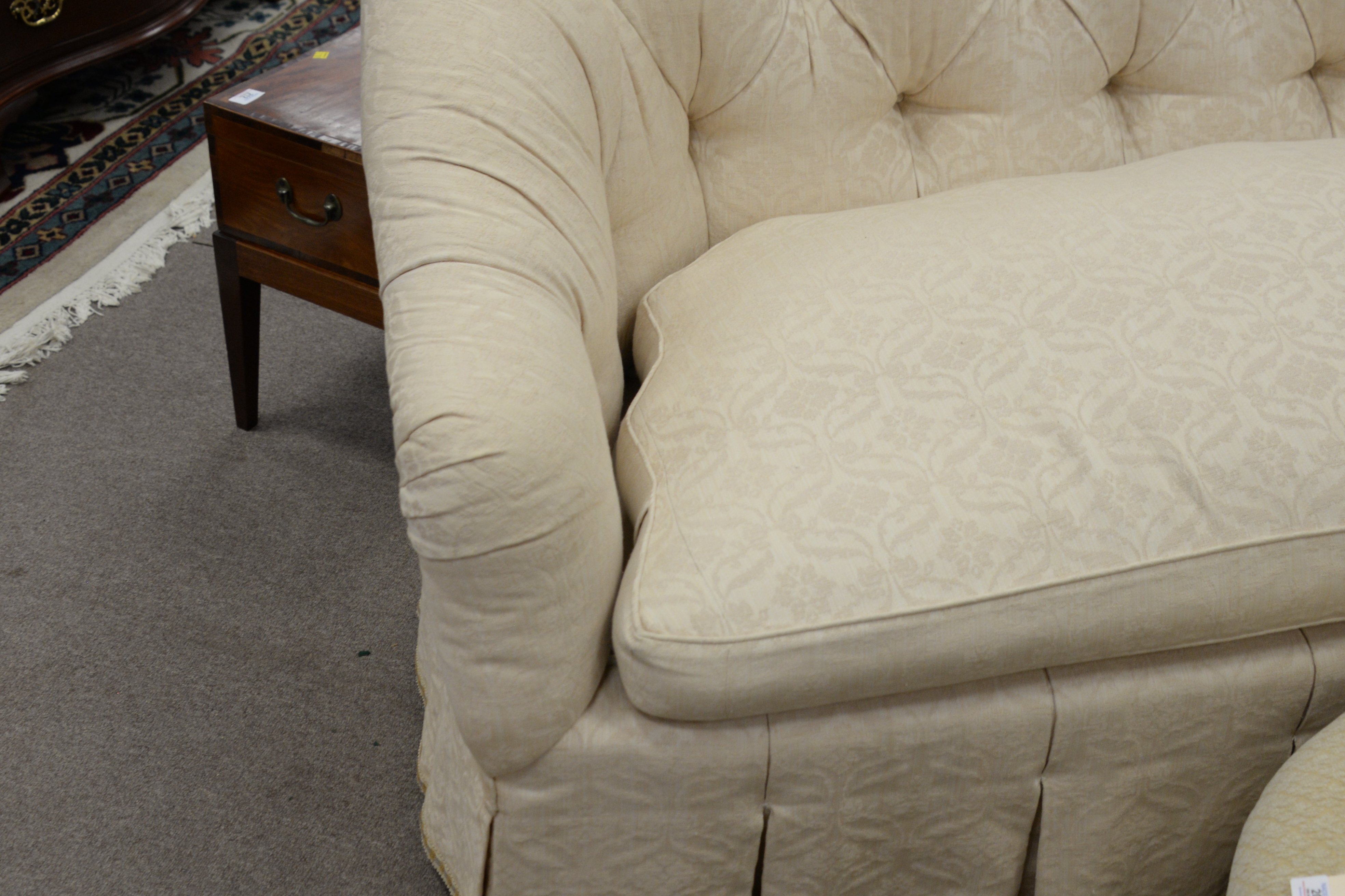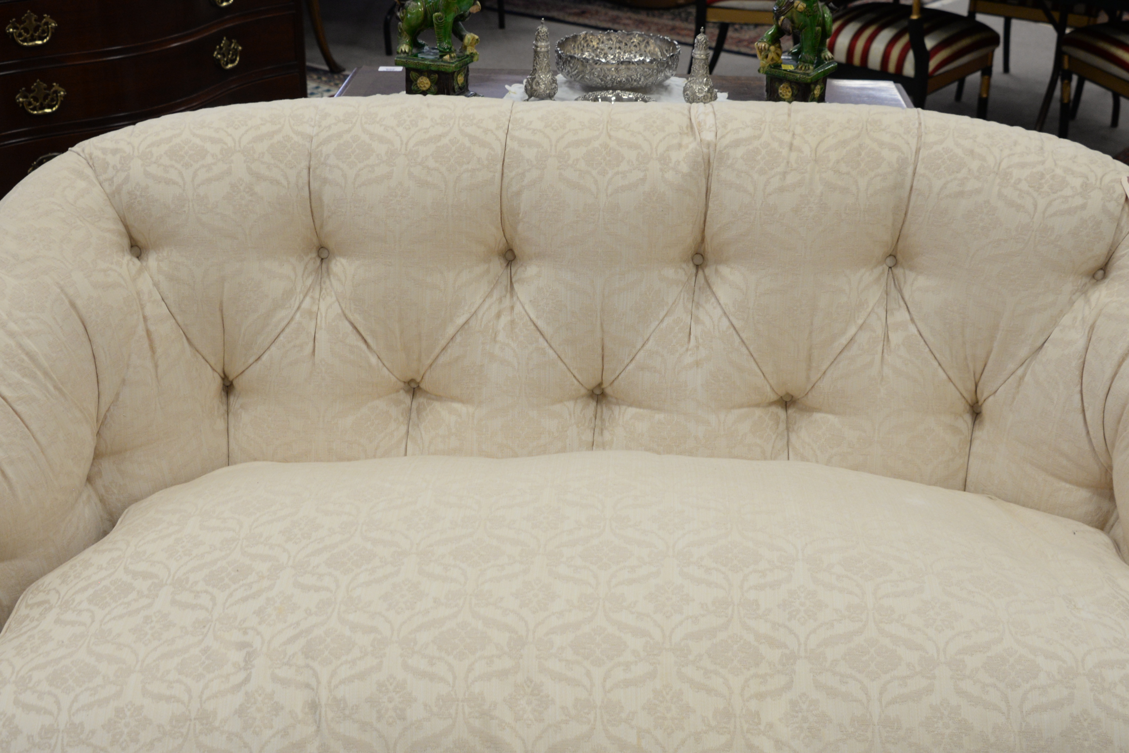 De Angelis Custom Upholstered Loveseat, having curved tufted button back with down filled cushion #129 Marshall Field, purchased from De Angelis, $5,193.60, length 68 inches, diameter 38 inches, height 36 inches