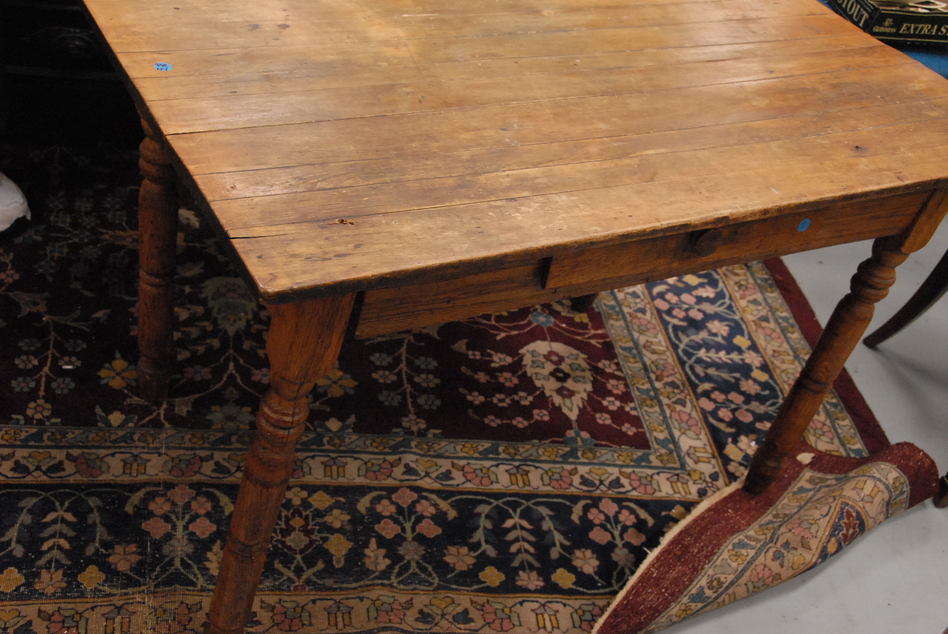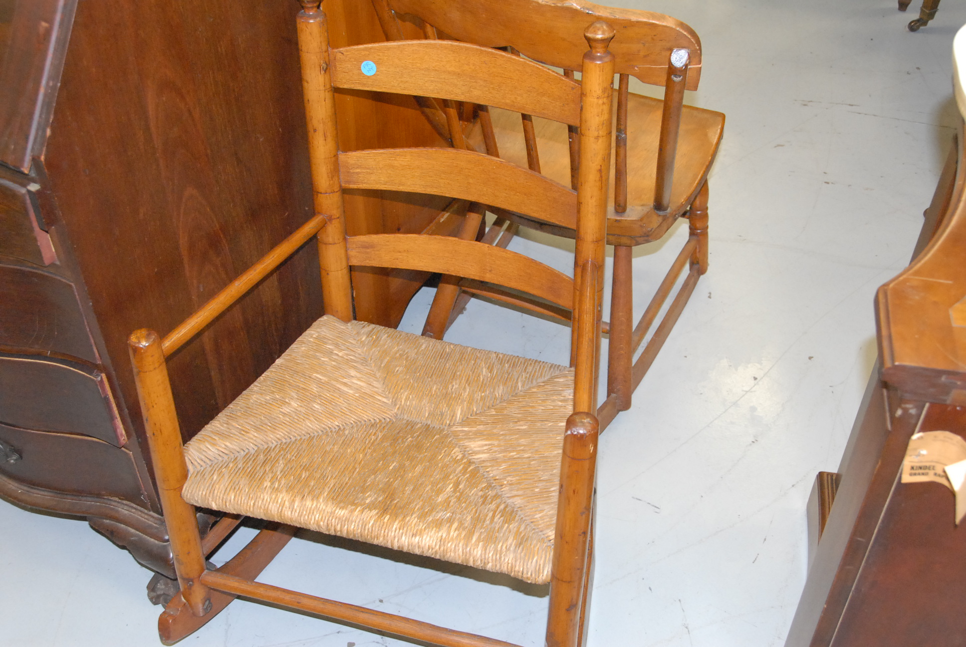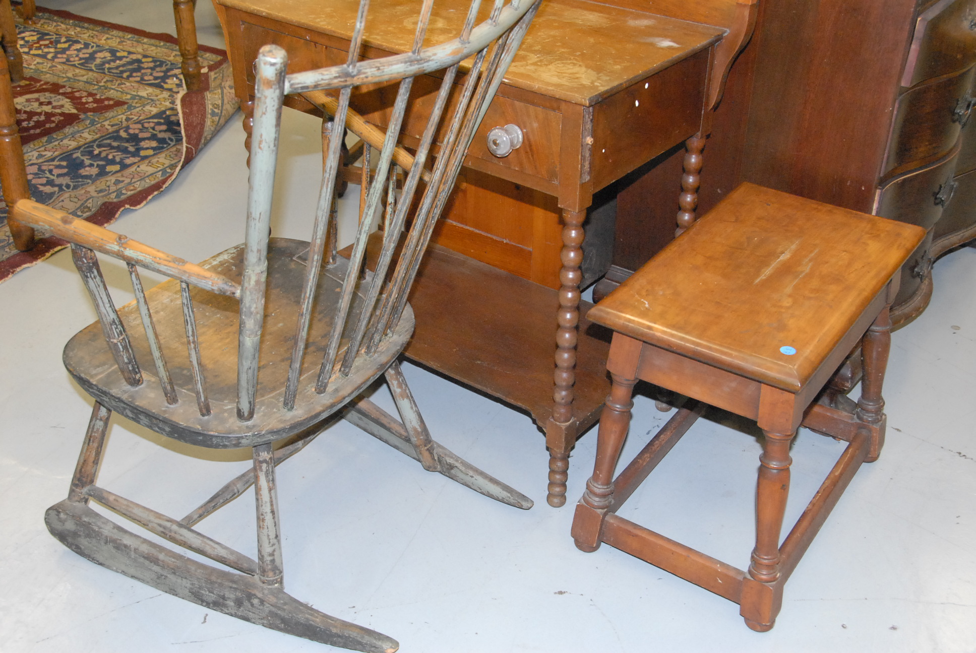 Eight piece lot of three primitive chairs, four drawer pine chest, wash stand, primitive table with a drawer, candlestand, and a small table.