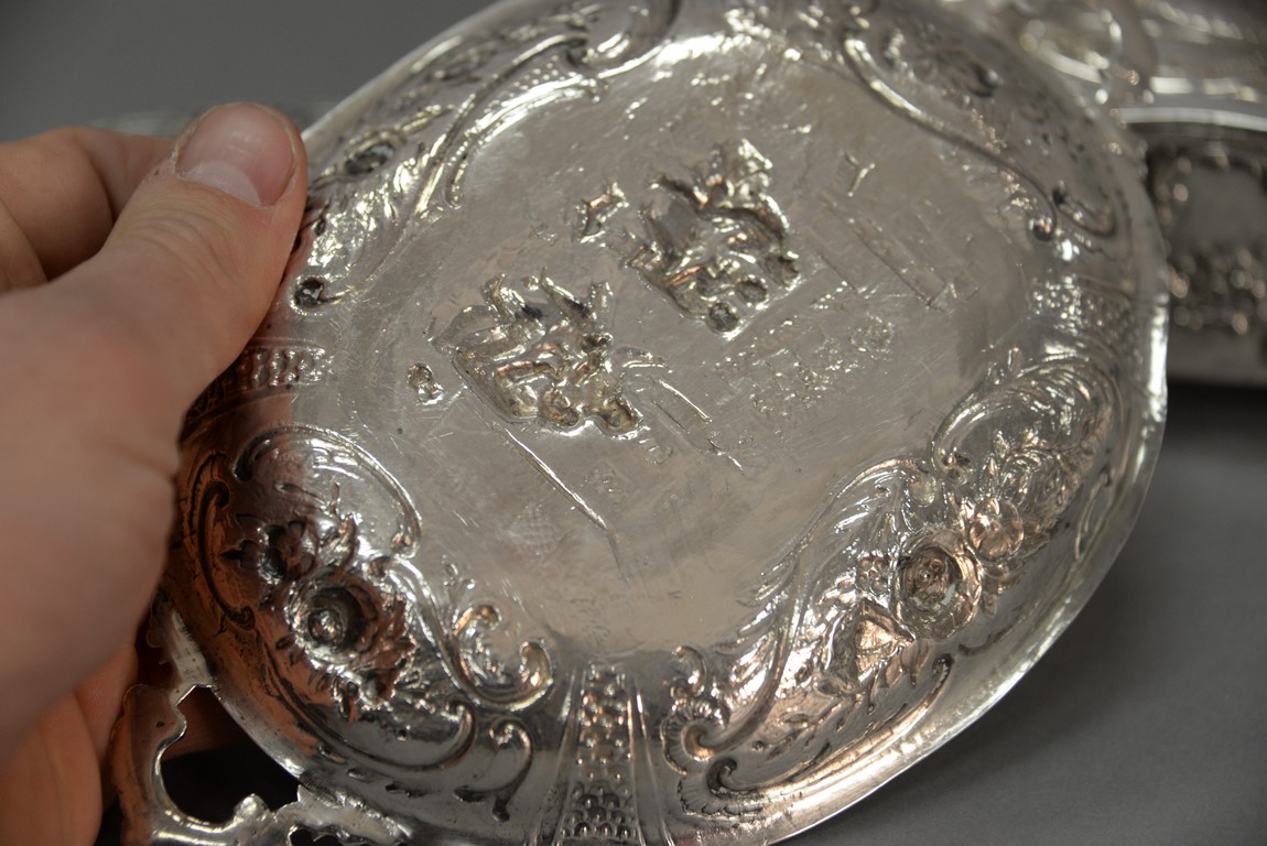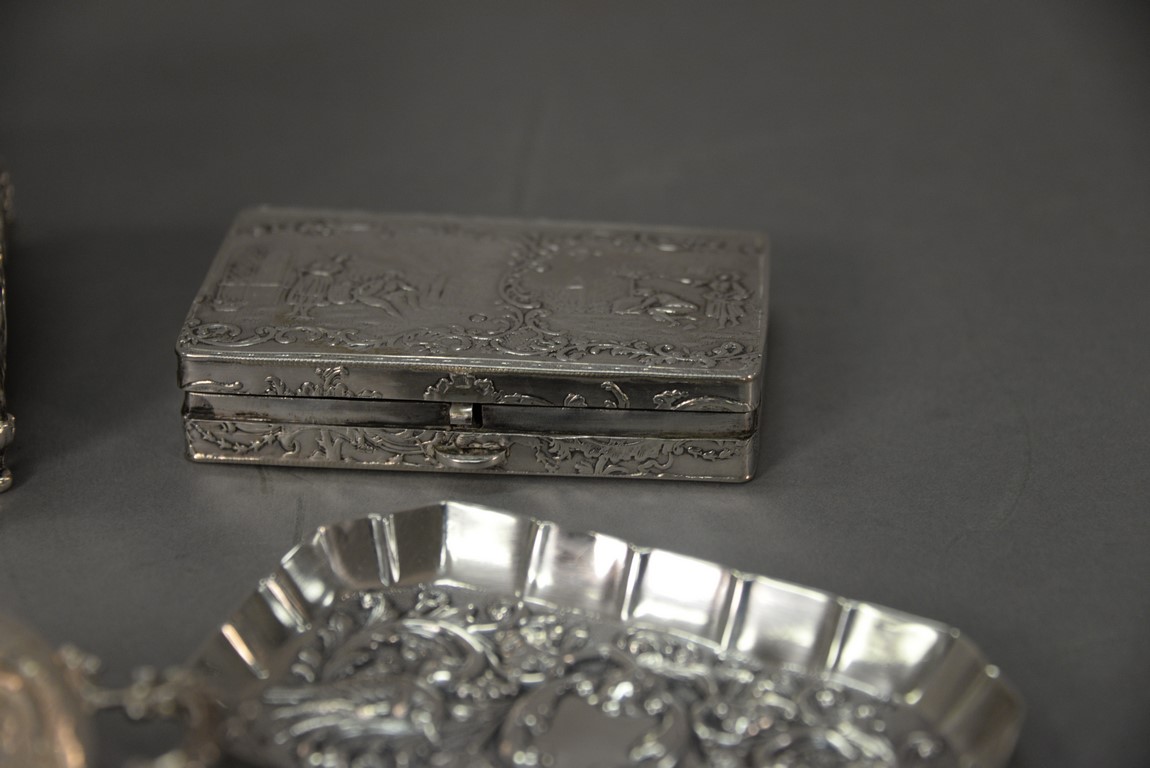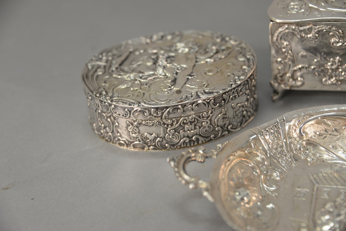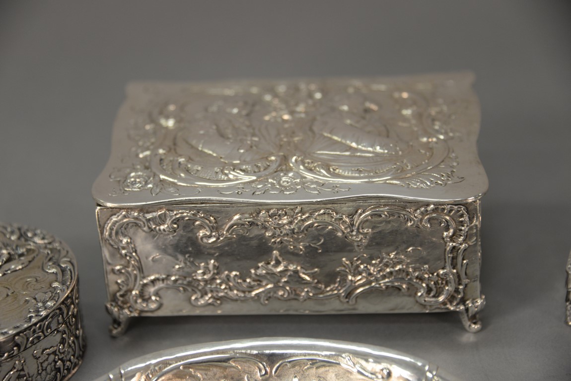 Lot 206: Five piece Continental silver lot including three boxes with figures and two trays, all with repousse. largest box: ht. 2 in. wd. 5 in. 23.3 t oz.