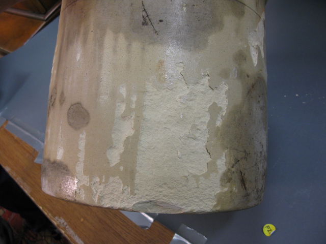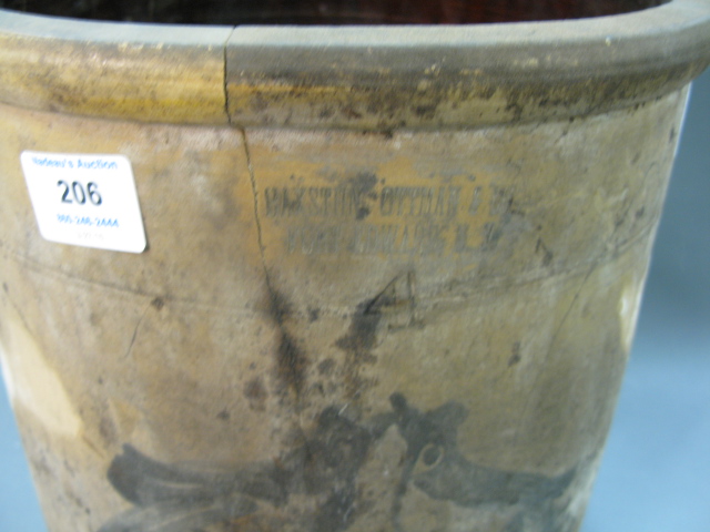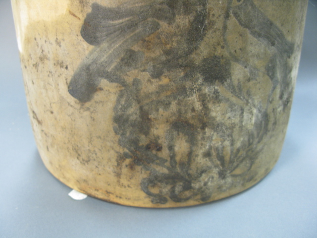 Four gallon stoneware crock with double birds in cobalt blue, marked Haxston Ottman, Fort Edward, NY as is cracked and chips.