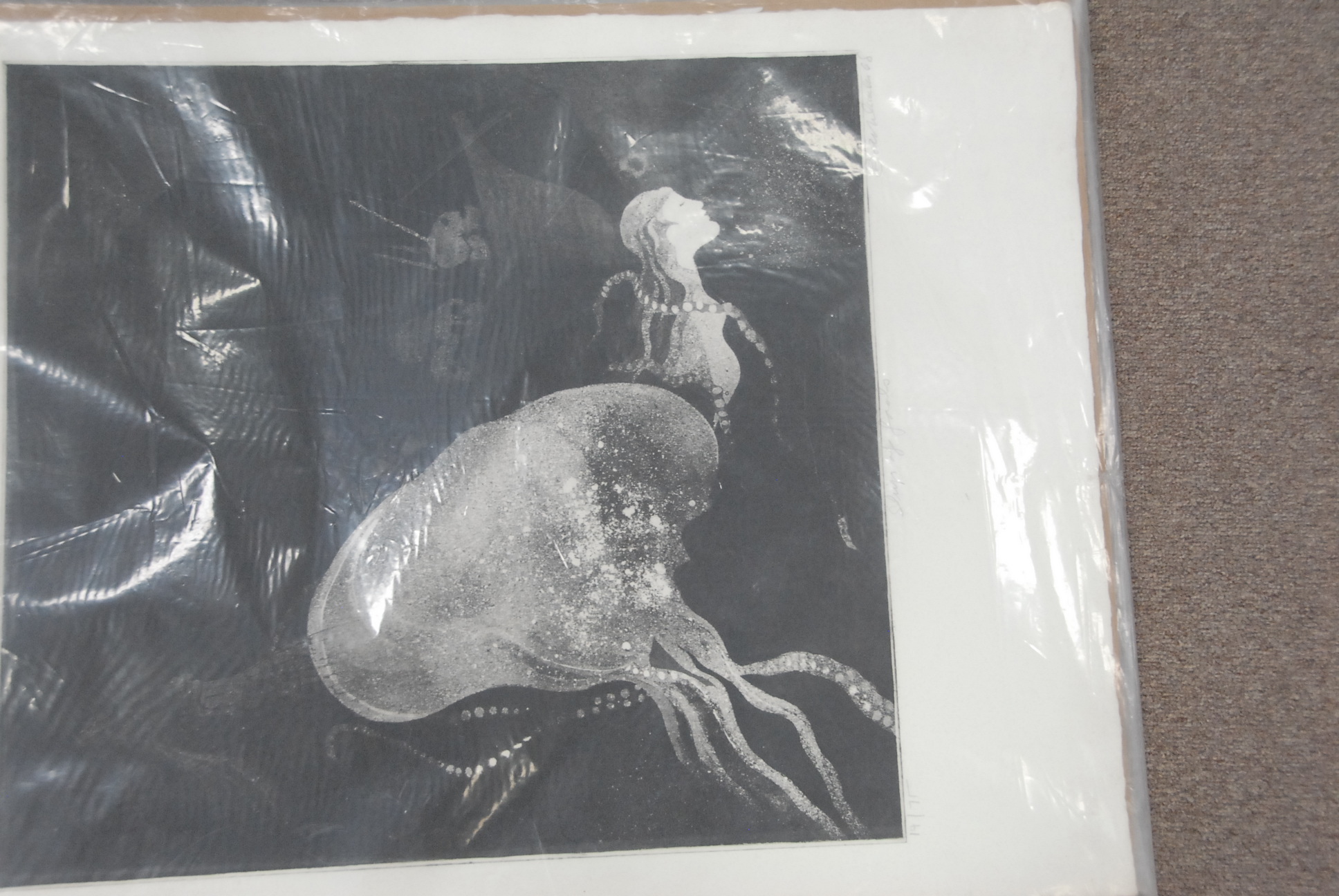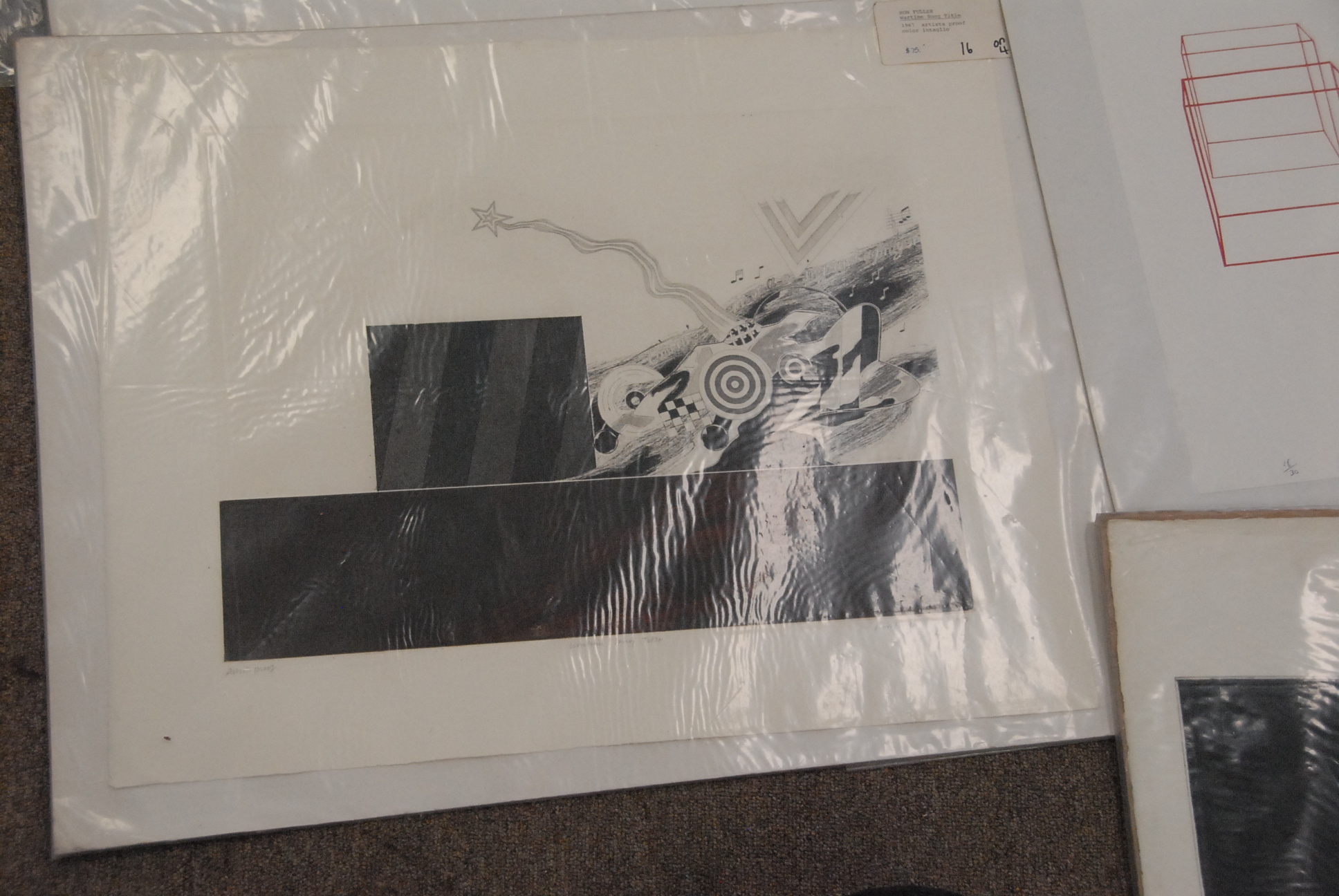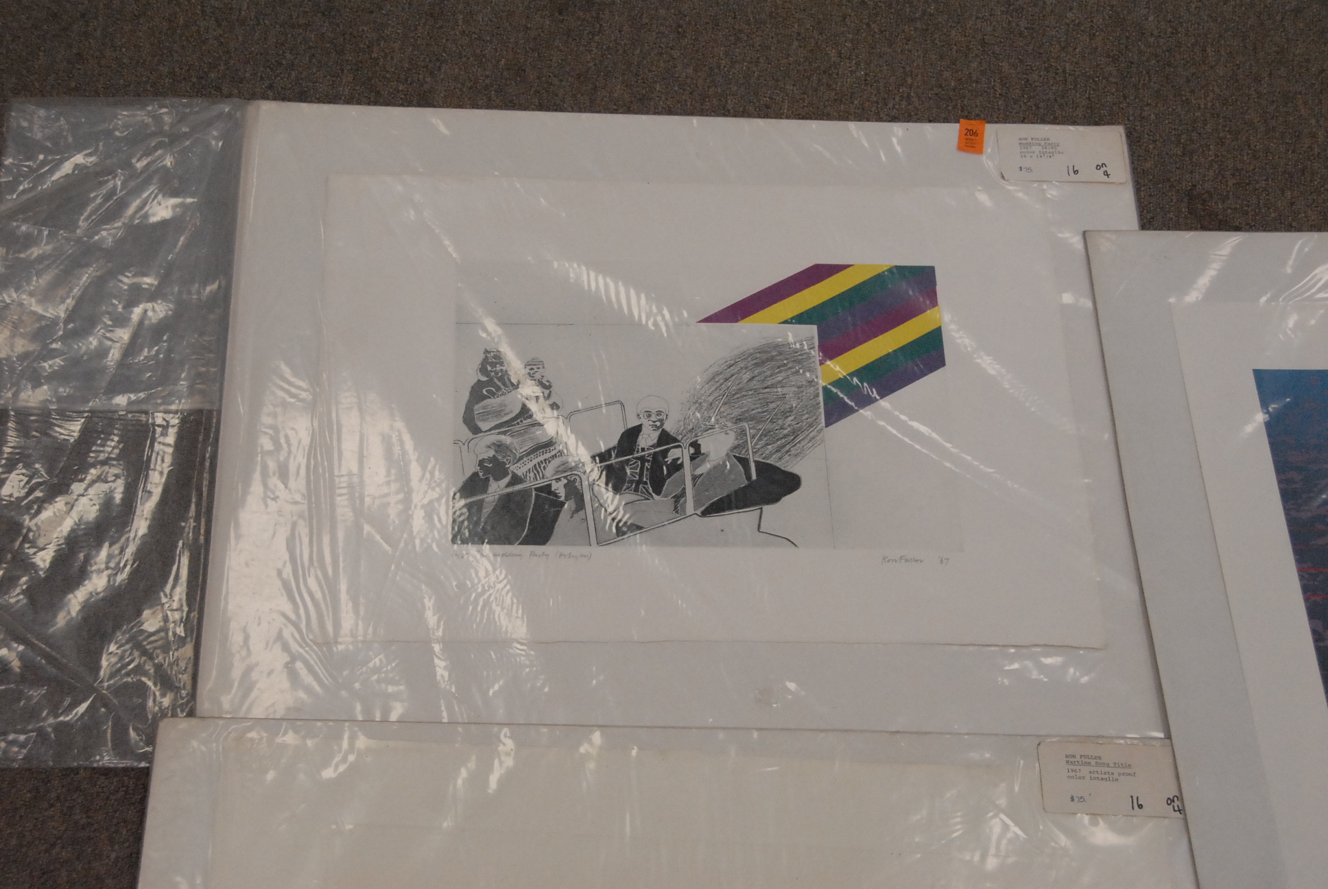 Four piece lot to include Michael Peel Beach Situation 1970 18/30 silkscreen, Ron Fuller Wedding Party 1967 16/65 etching, Bartolomeu Dos Santos Ship Of Fools 1968 14/75 aquatint, and Ron Fuller Wartime Song Title 1967 AP intaglio.