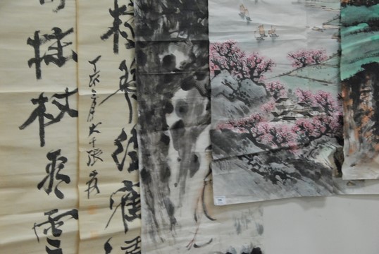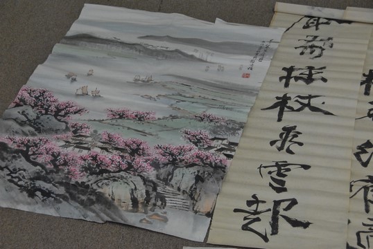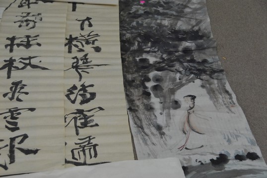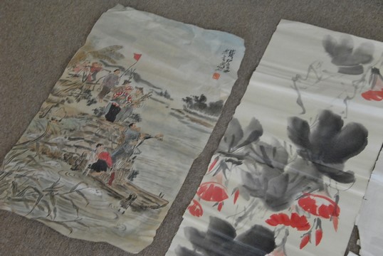 Group of nine four tissue paper watercolor to include two with Guanyin dancing 28 x 14 and 27 x 18, one with flowers 34 x 14, landscape 26 x 16, landscape with path 42 x 28, landscape with lake 42 x 28, Guanyin figure 56 x 18, and two with characters 51 x 13.
