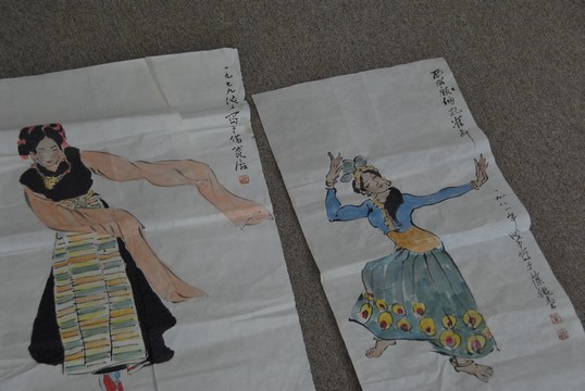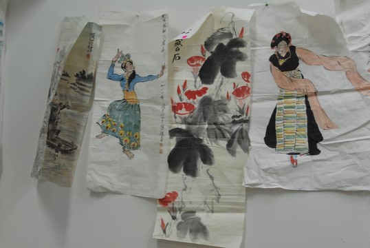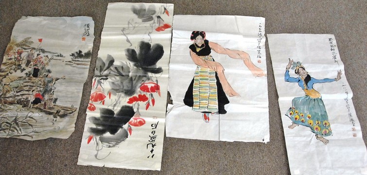 Lot 206: Group of nine four tissue paper watercolor to include two with Guanyin dancing 28 x 14 and 27 x 18, one with flowers 34 x 14,…