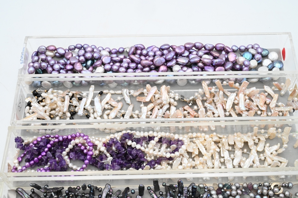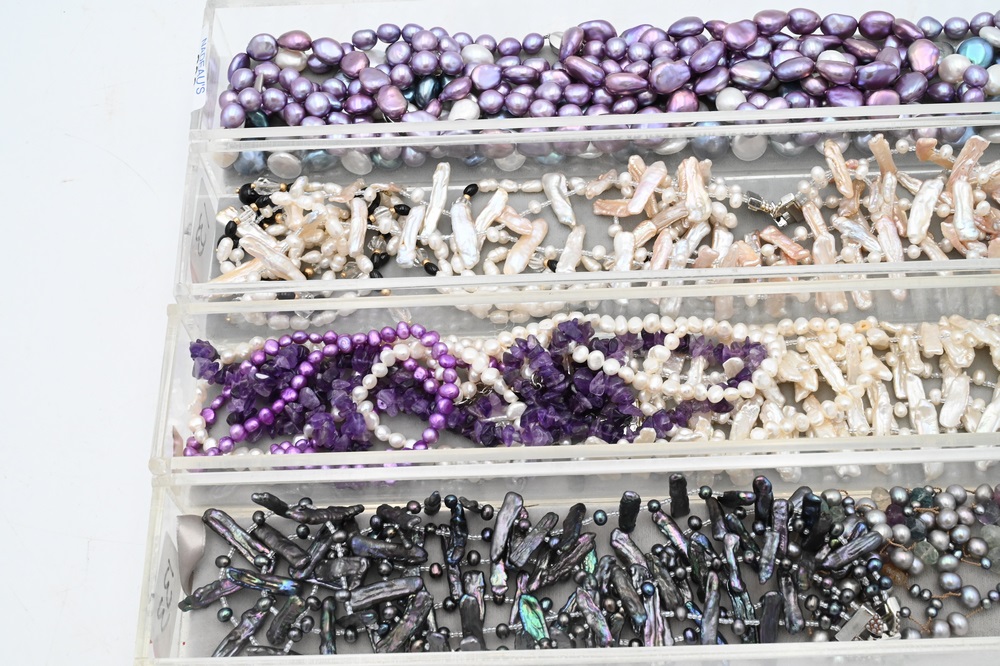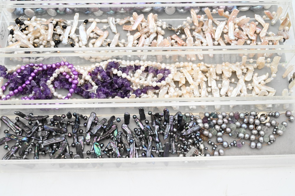 Lot 206: Group of Nine Necklaces, to include three cultured pearl necklaces, one all purple, one purple and white, along with one blue and white, all having sterling clasps marked H925, longest in length 60 inches; six necklaces, to include pearl single strand having black and gold beads, three branch form pearl necklaces, a pearl and purple glass four strand necklace, along with a multiple strand necklace having pearl and purple quartz.