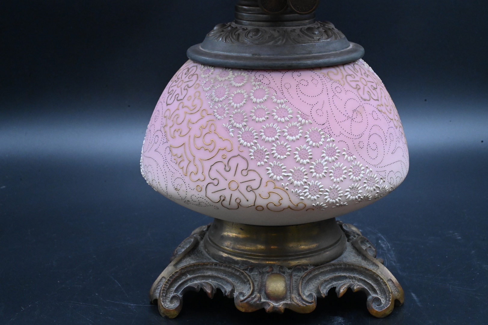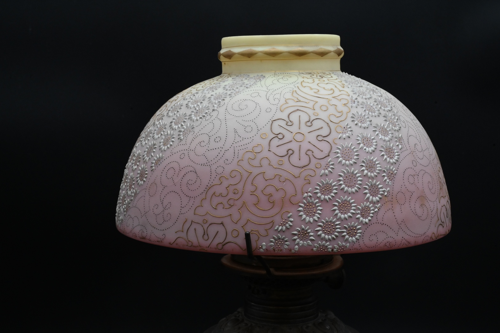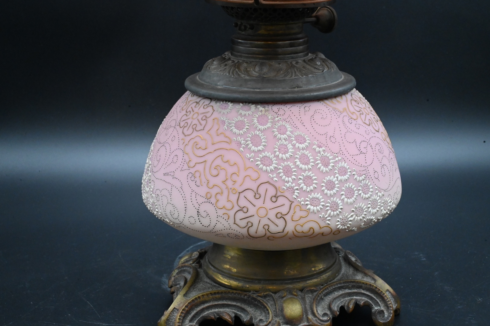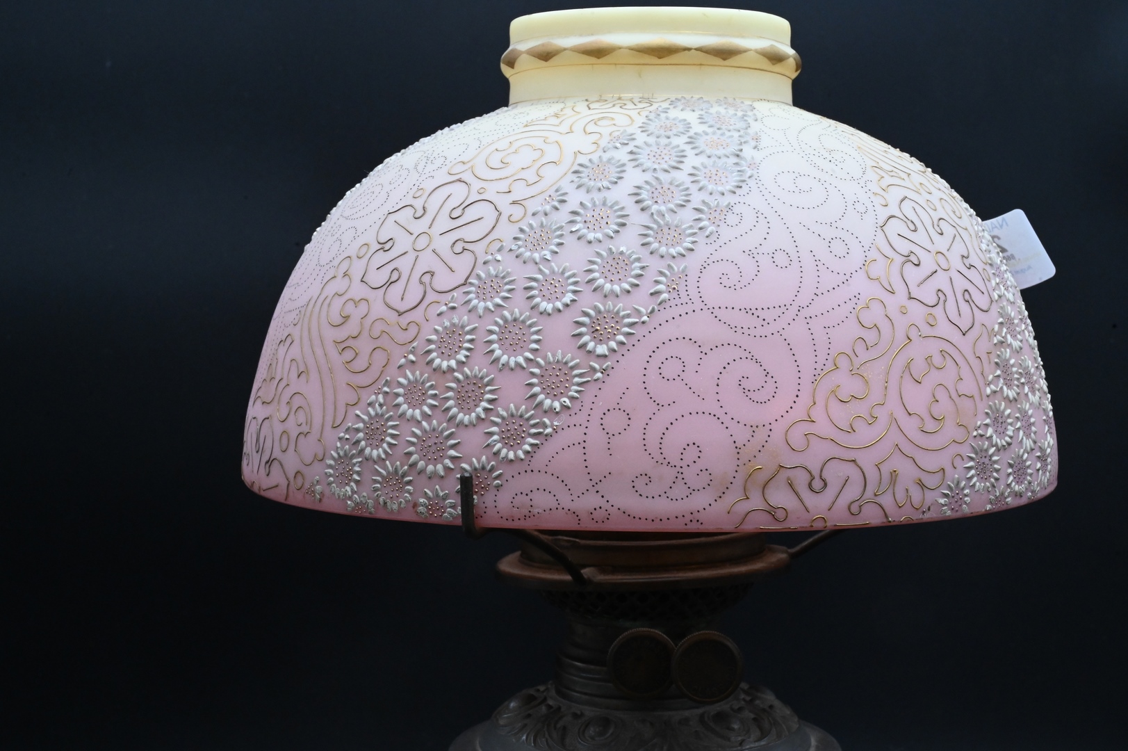 Mt. Washington Burmese Glass Queens Lace Oil Lamp, secure spider crack in shade, height 17 inches. Provenance: From the Estate of Elwyn W. Lemon, Enfield, Connecticut.