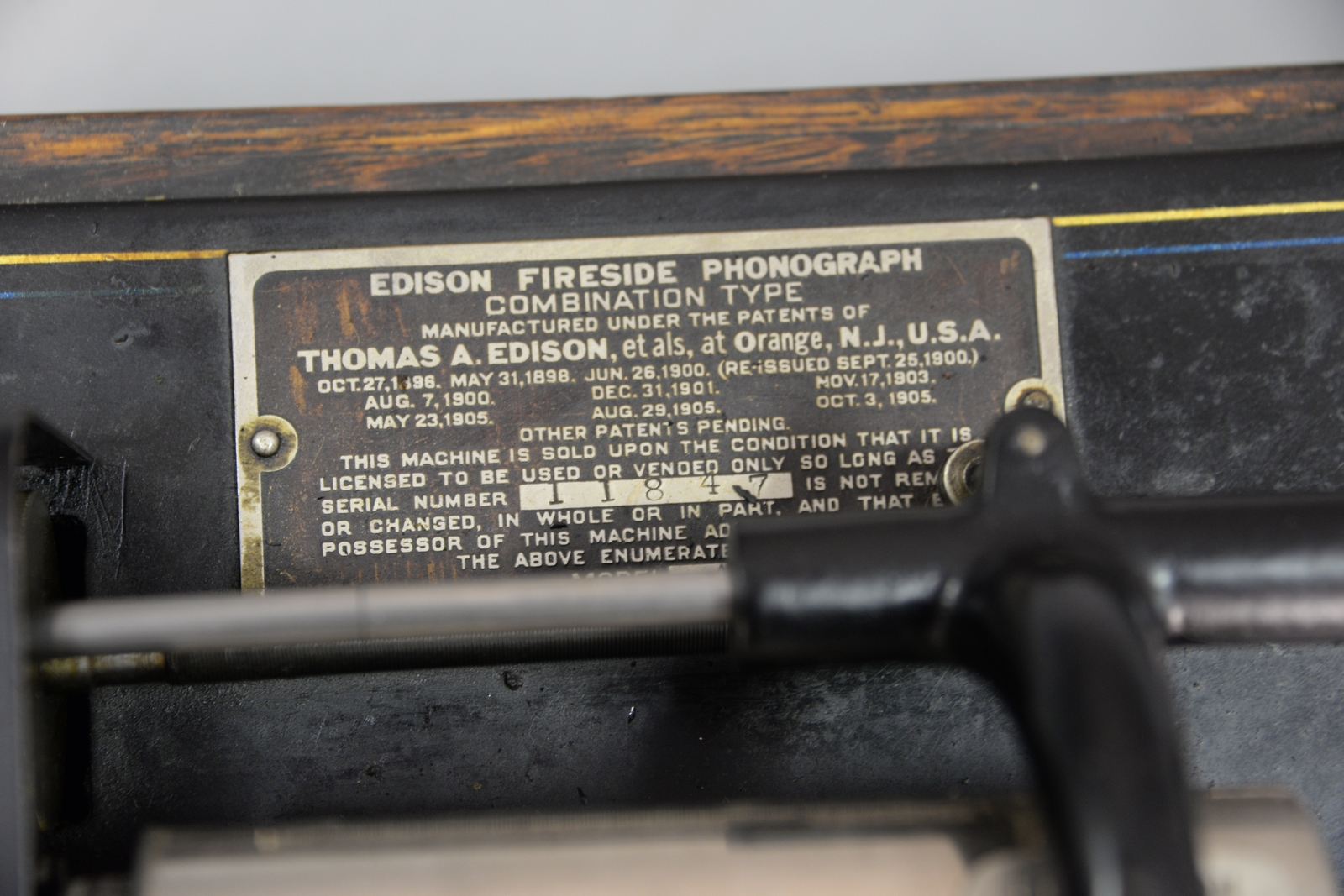 Thomas Edison Fireside cylinder phonograph with 3 1/2 inch horn. ht. 10 1/4in., wd. 11 1/2in., dp. 9in.