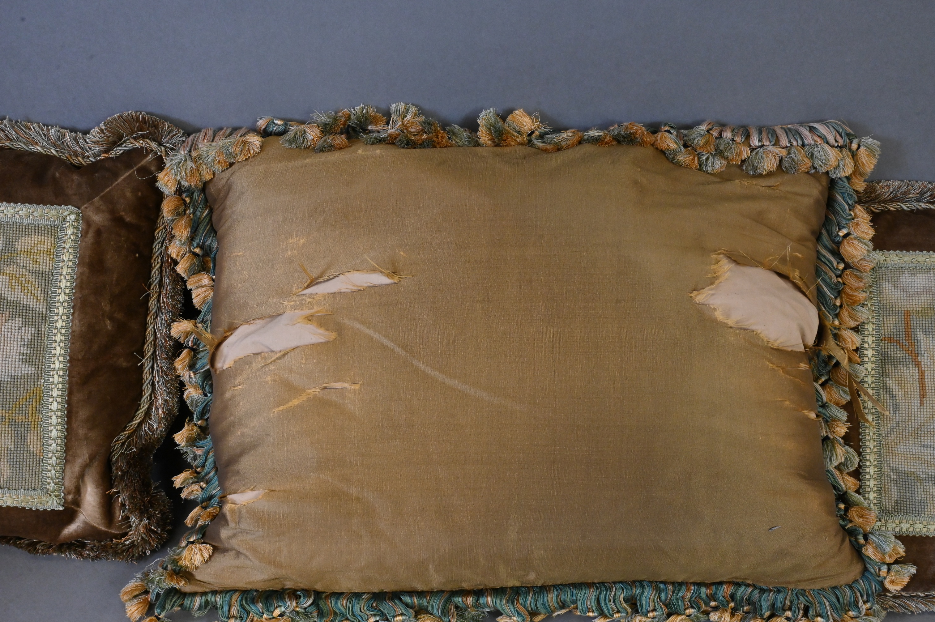 one French Aubusson style featuring a squirrel and bird in a tree with silk back (18″ x 24″), the other two having floral design, all with fringe