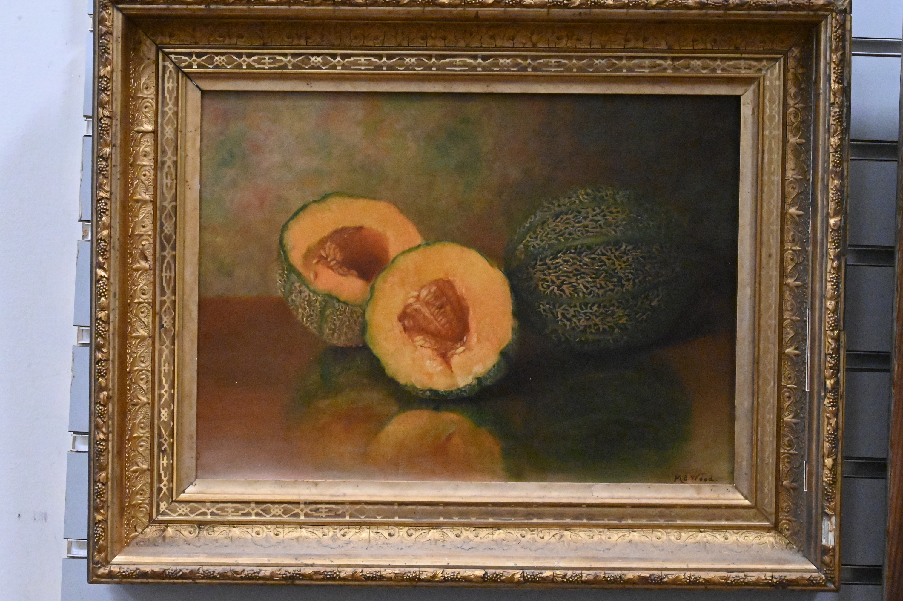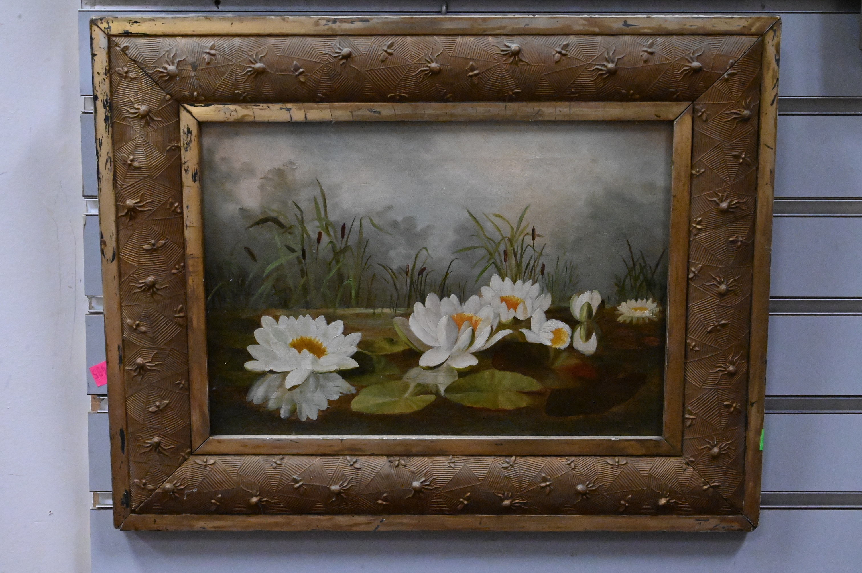 along with oil on canvas study of waterlilies in a pond with cattails in ornate spider web frame