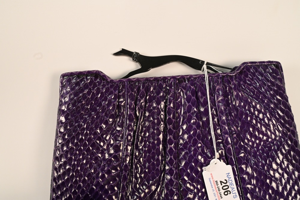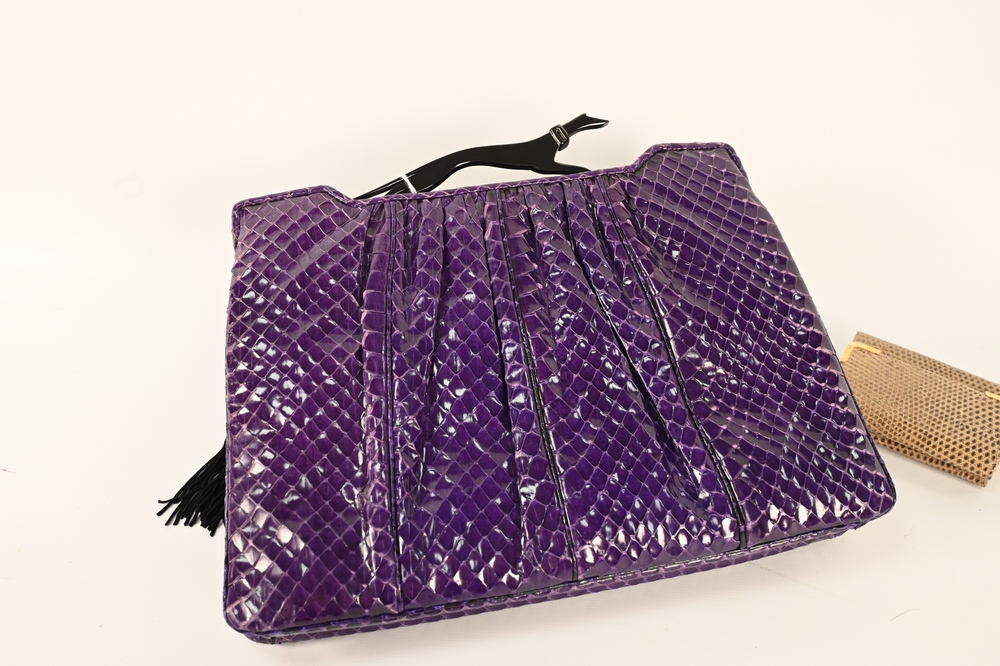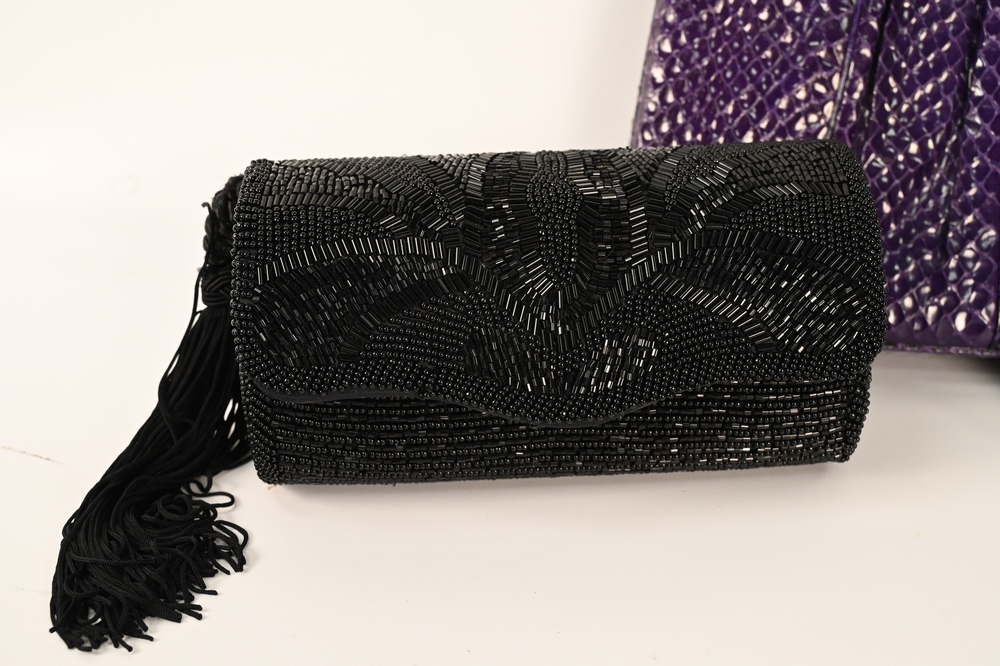 Lot 206: Three Judith Leiber Pieces, to include black beaded clutch evening purse, purple lizard skin with greyhound top, along with a small …
