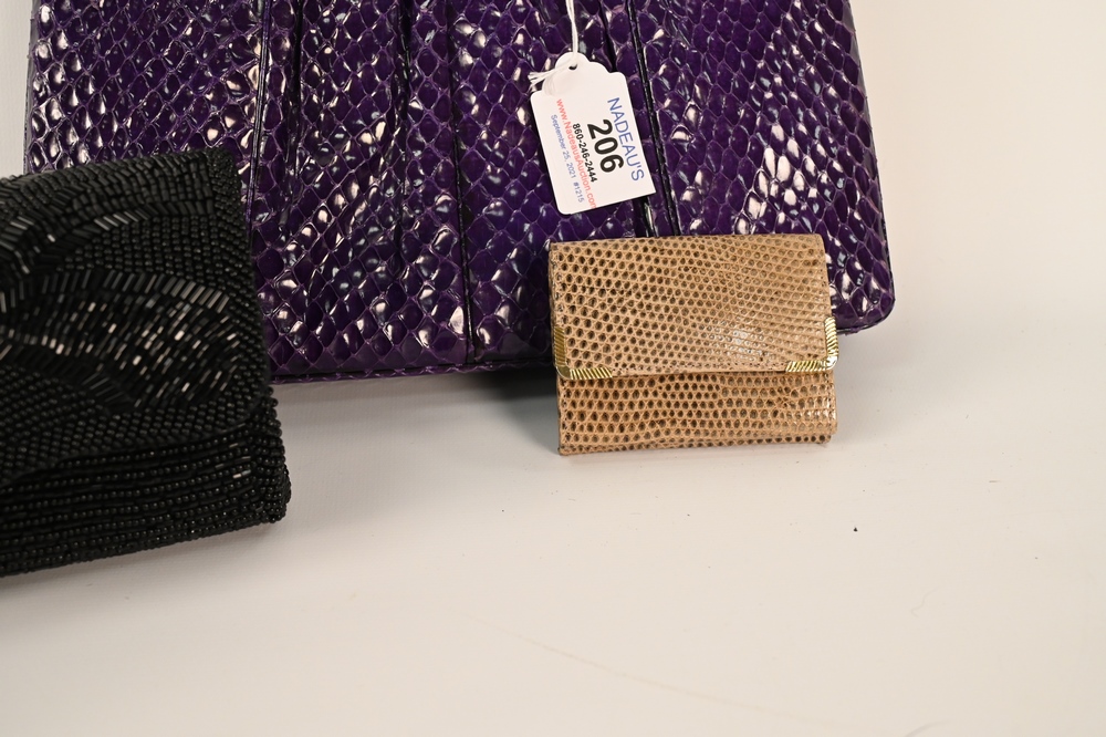 Three Judith Leiber Pieces, to include black beaded clutch evening purse, purple lizard skin with greyhound top, along with a small tan lizard skin coin purse.