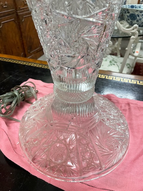 Large Cut Glass Table Lamp, having mushroom form shade, set on vasiform base, height 26 inches, diameter 11 inches.