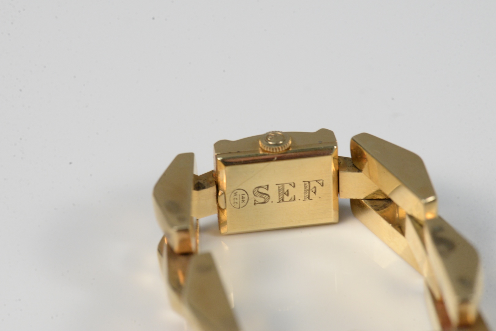 Lot 207: 14K Yellow Gold Ladies Wristwatch by Hepa square gold case, with gold bracelet 23.5 dwt.