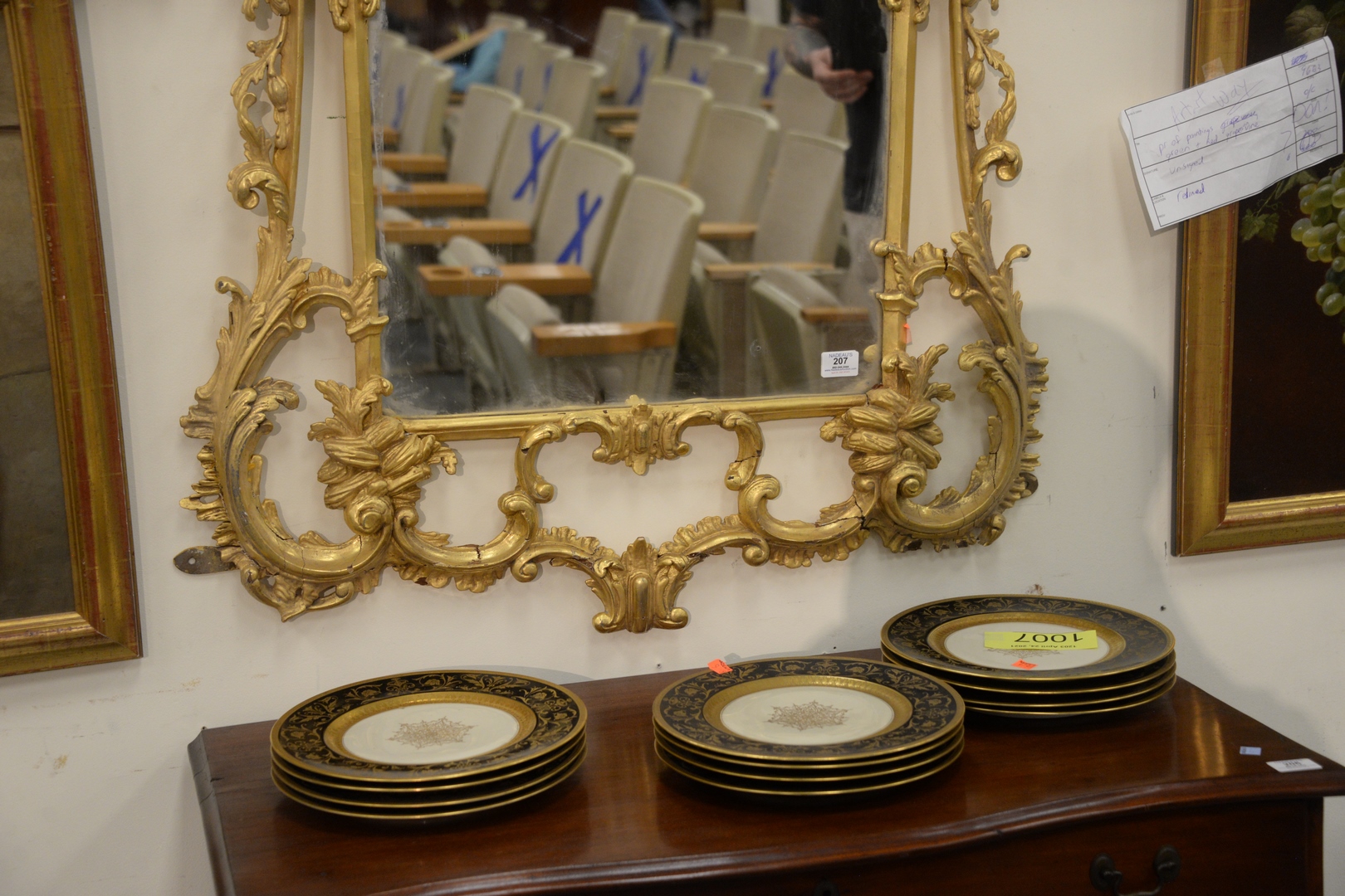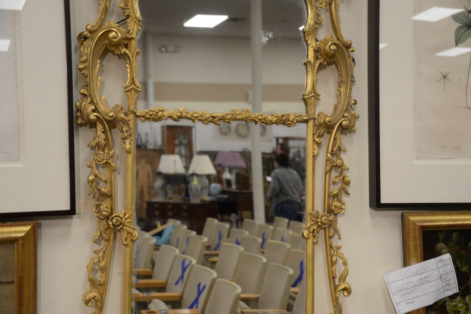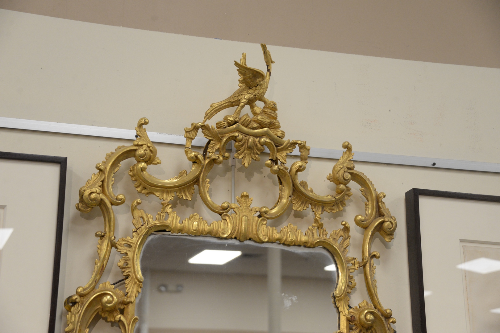 Lot 207: Carved and Gilt Chippendale Two Part Mirror, with phoenix bird top and overall open work some repairs, height 72 inches, width 35 inches.