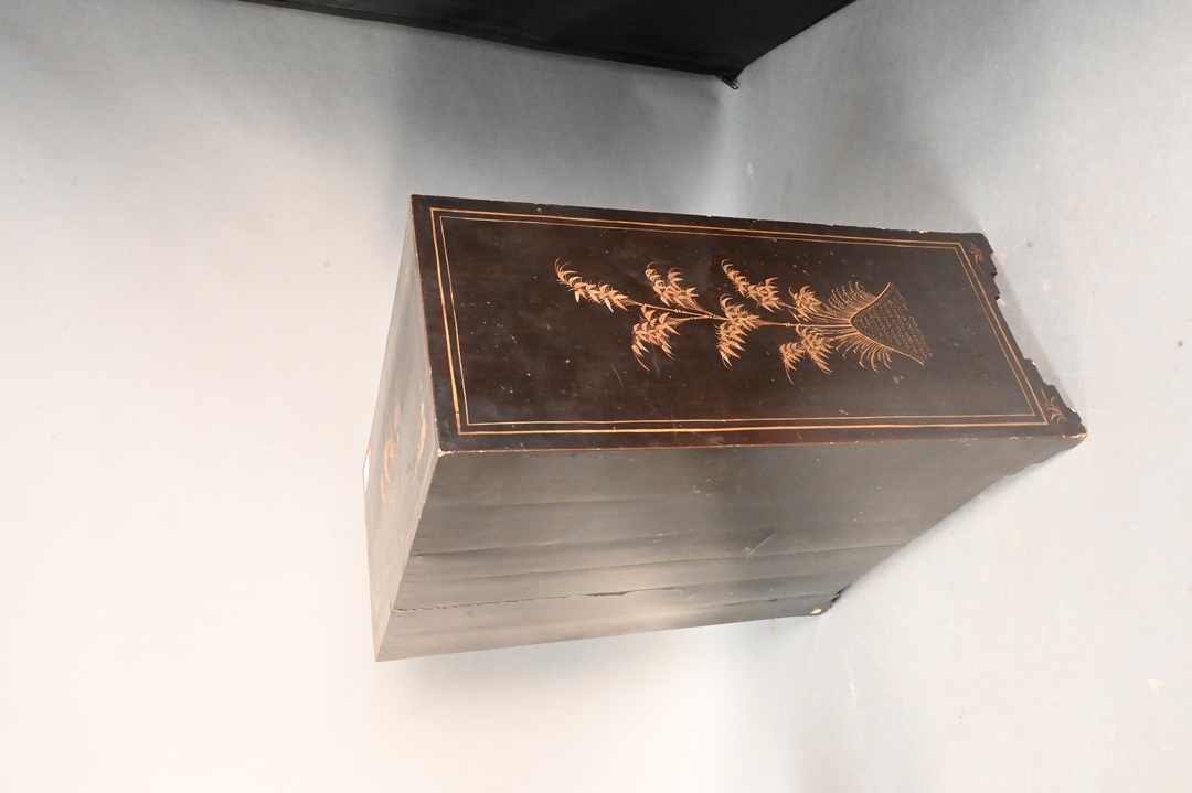 Chinese Export Black and Gilt Lacquer Collector’s Cabinet, mid 19th century, doors centered by oval panels enclosing an extensive scene with pagodas and figures, the interior with five long drawers with foliate decoration, height 21 inches, width 17 inches.