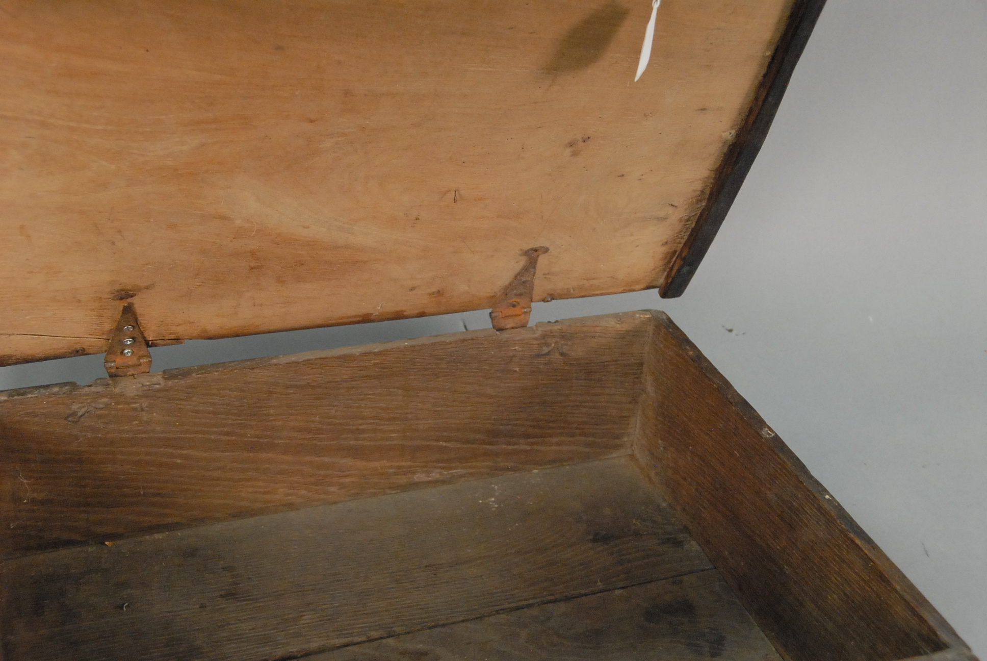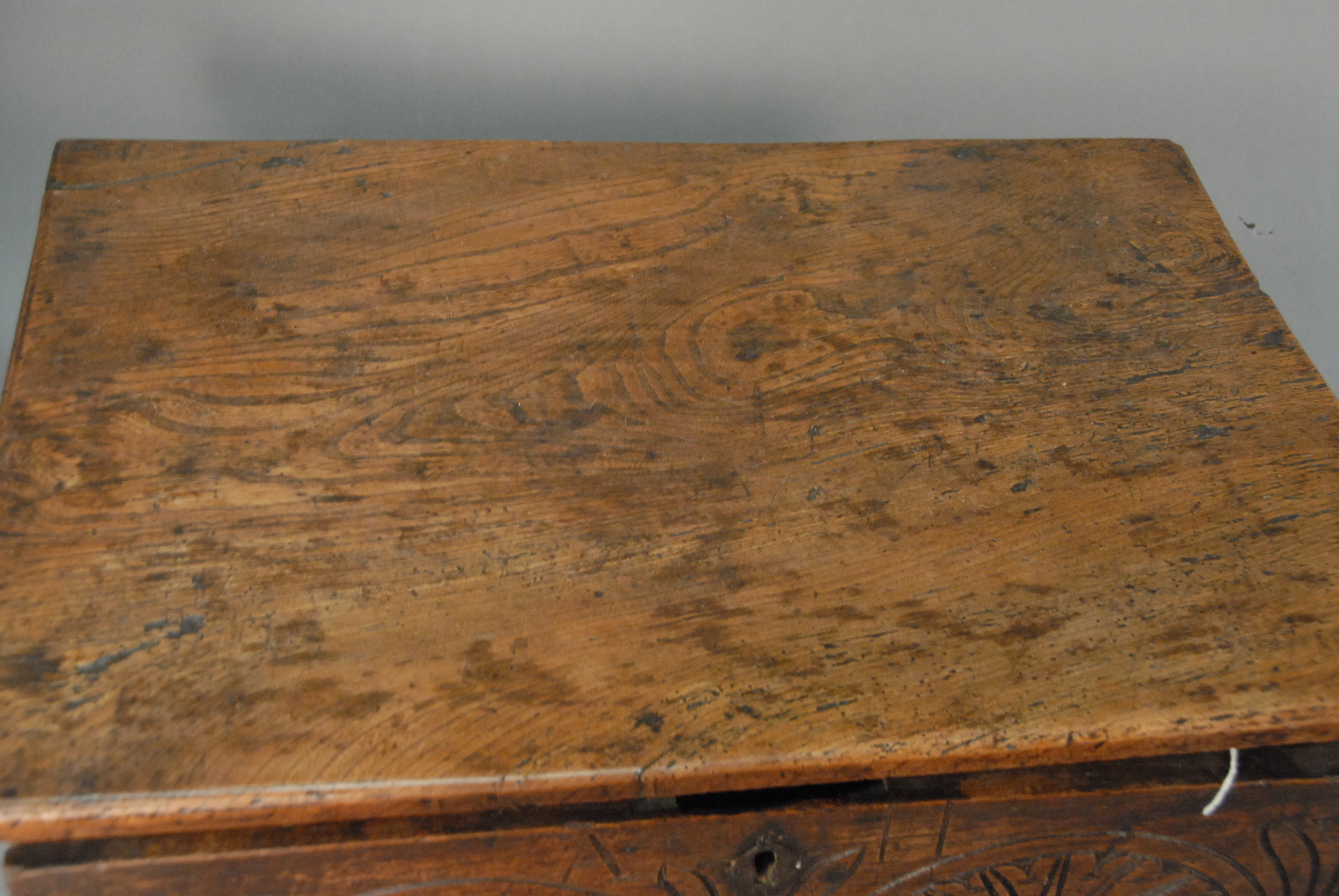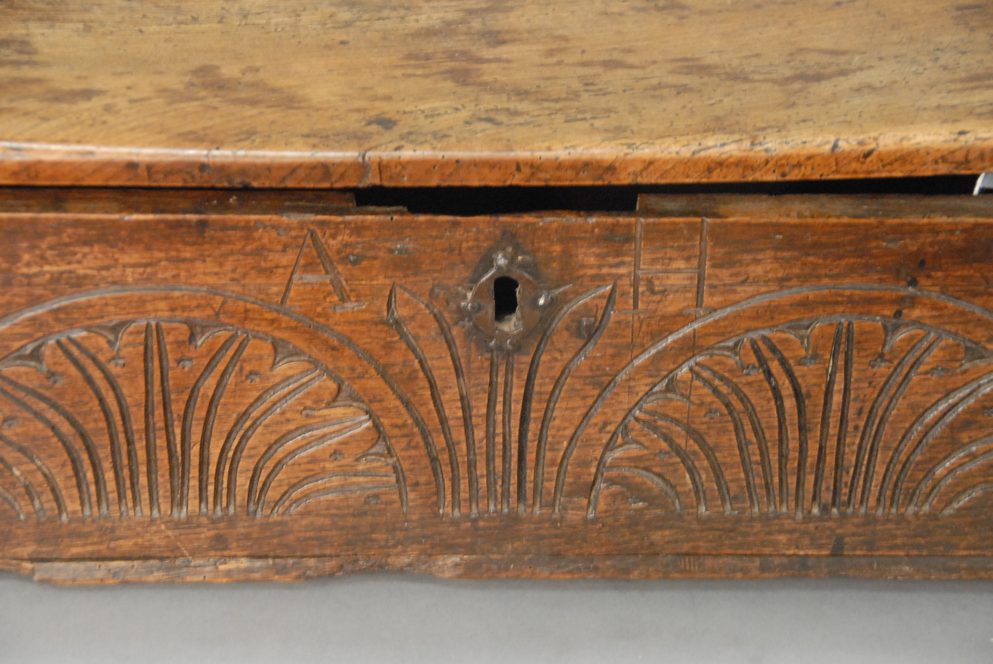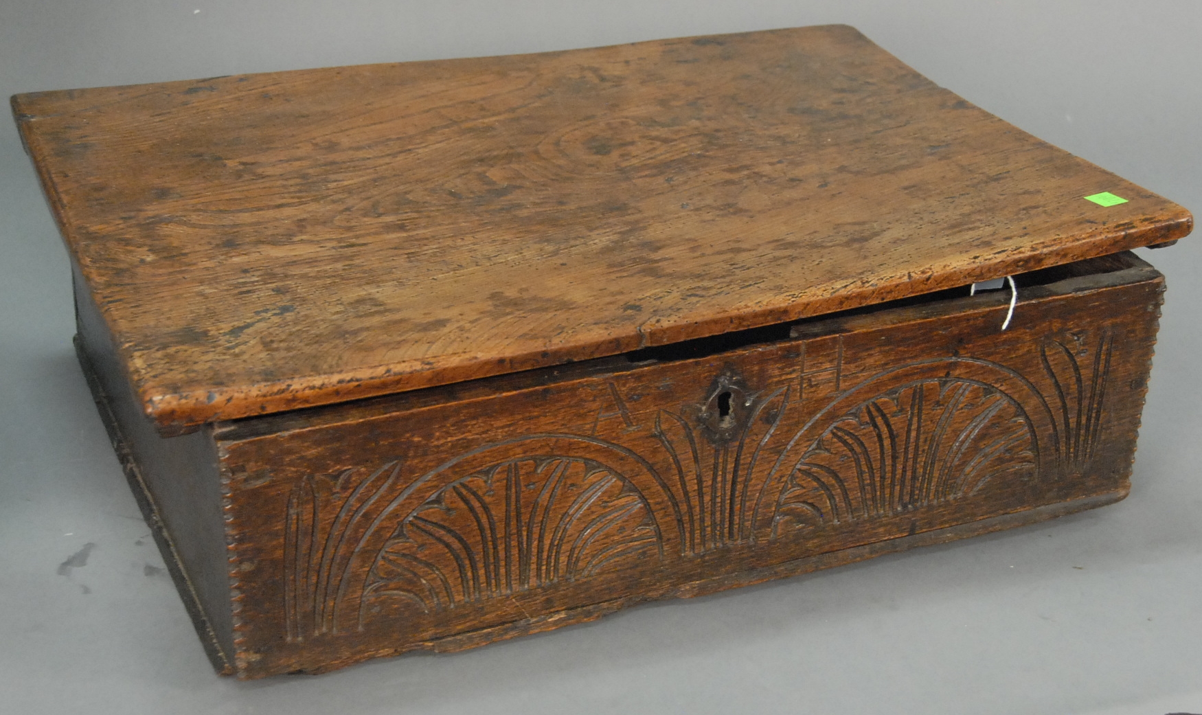 Early English oak bible box with carved front, initialed AH. ht. 7in. wd. 22in. dp. 17in.
