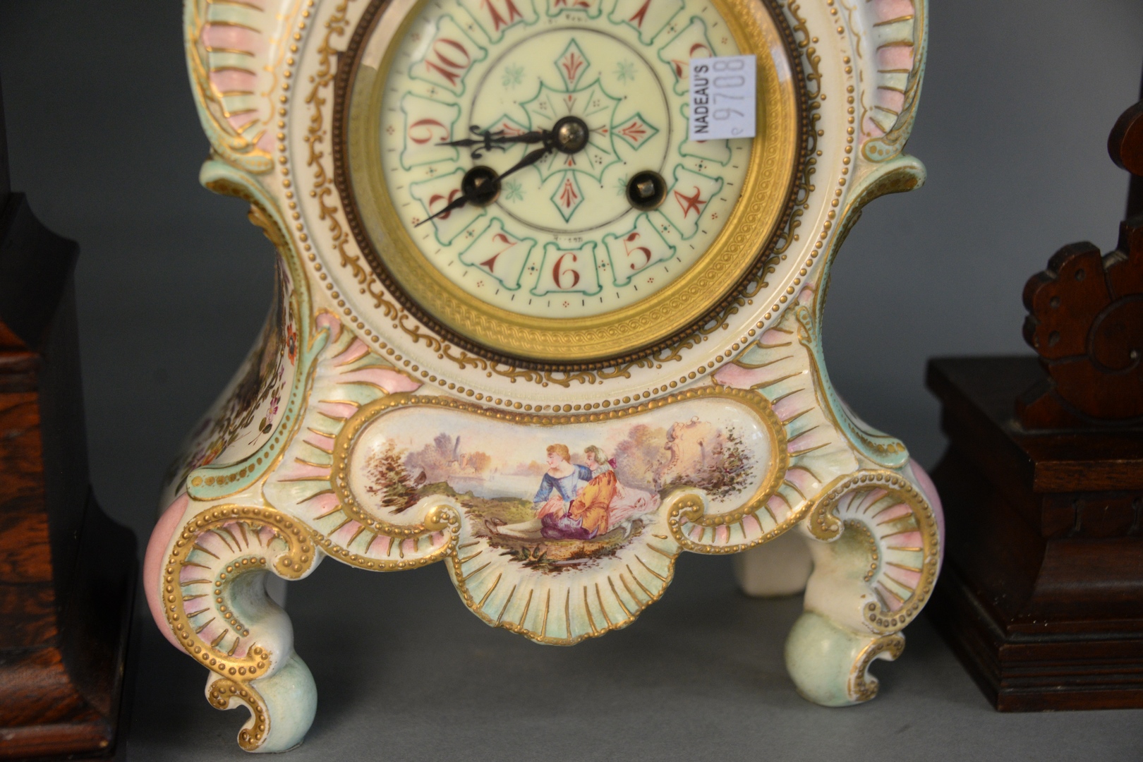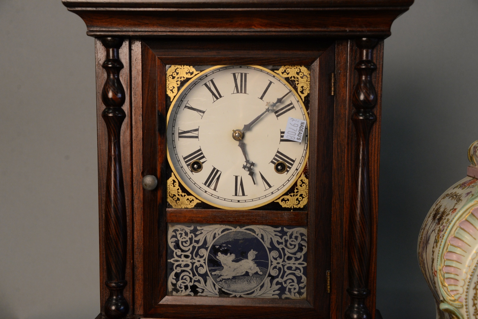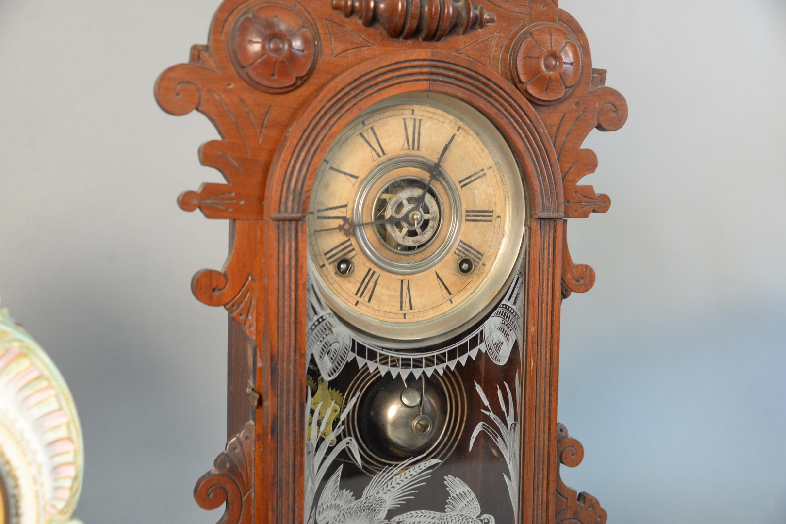 to include ceramic clock with enameled face rosewood Regulator clock along with a William L. Gilbert Victorian mantle clock