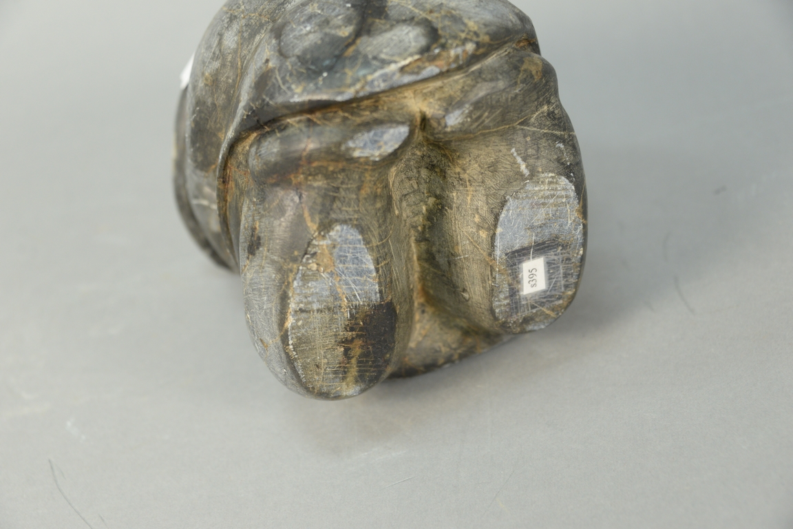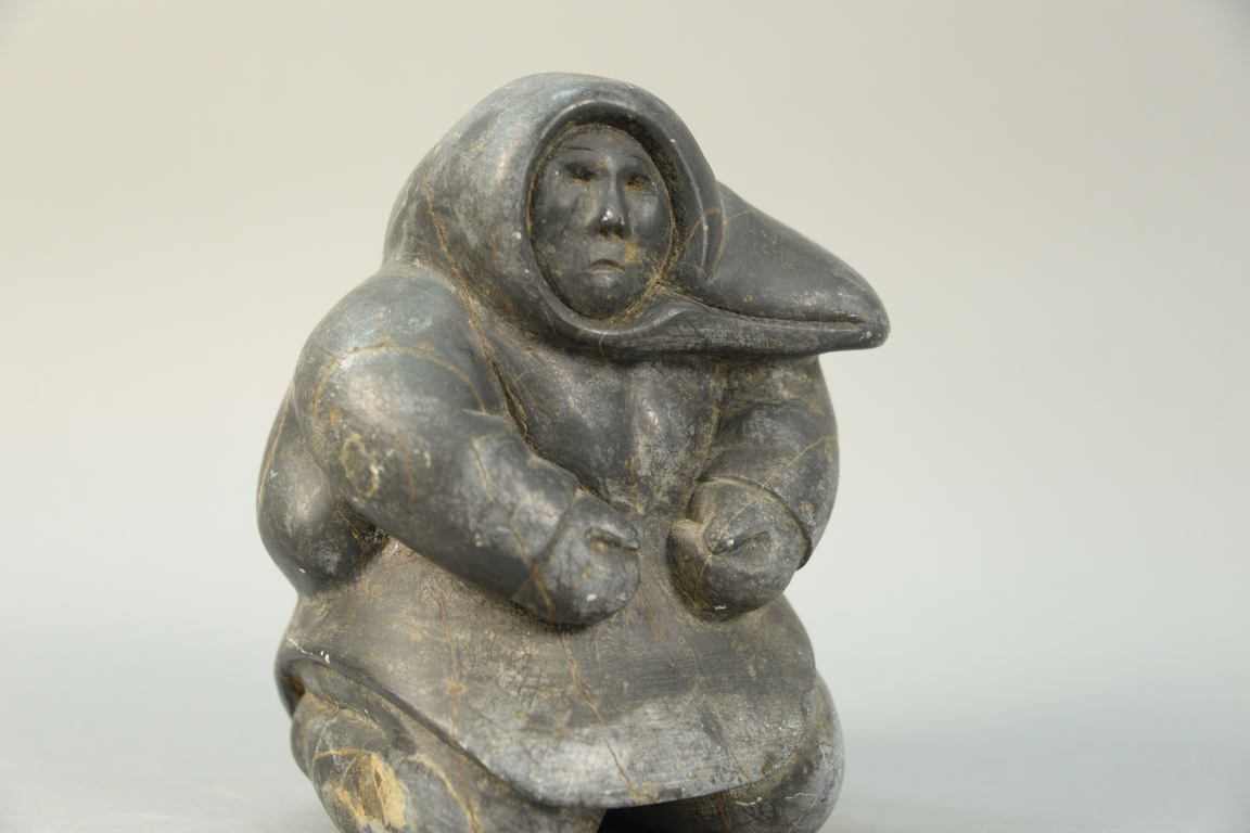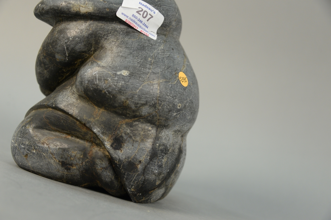 Lot 207: Inuit Eskimo carving possibly Kiakshuk or Lukta, Cape Dorset dark grey basalt Carving of an Eskimo Sitting Inuit Woman 7 1/2in., …