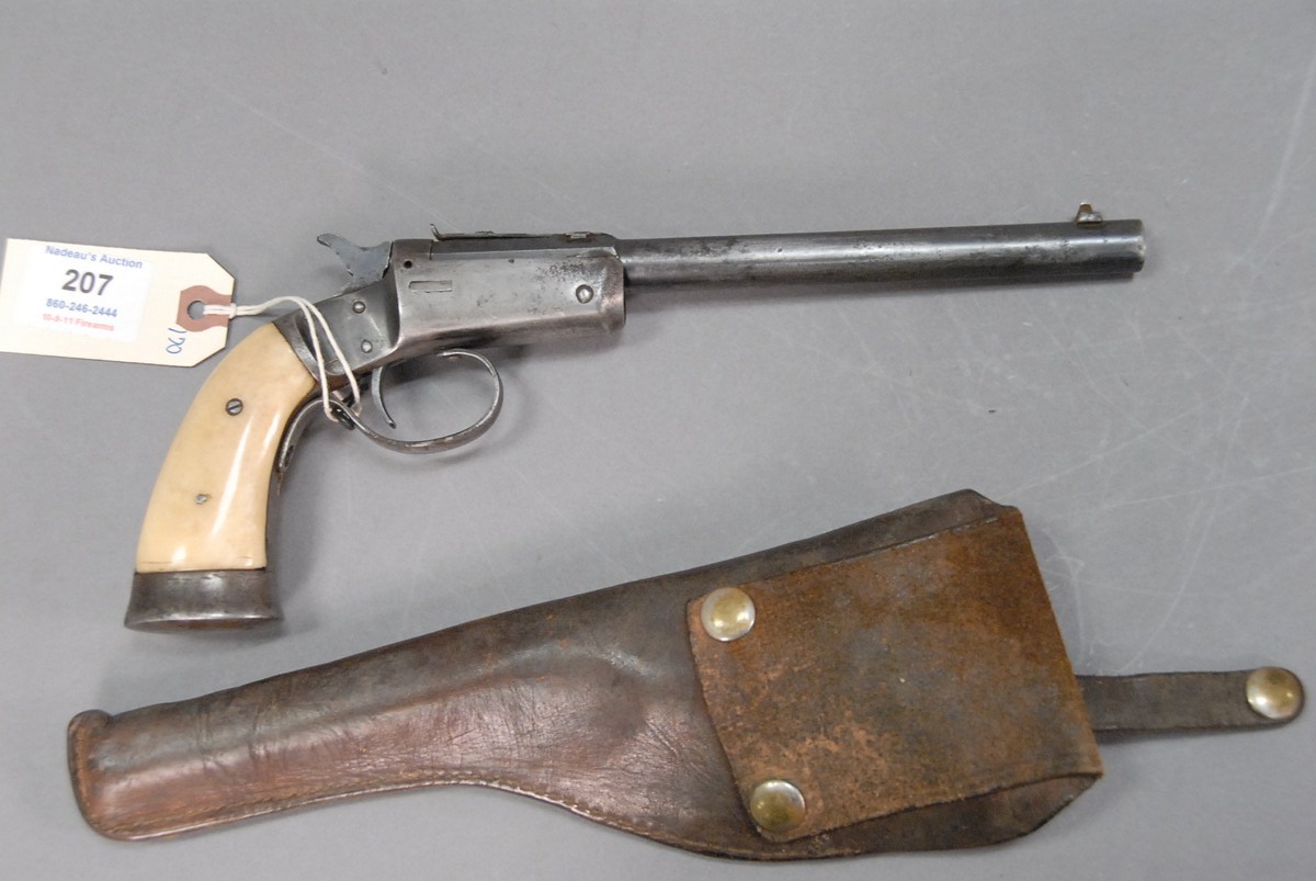 J. Stevens Arm Company single shot pistol, .22 caliber, 8 barrel, round / octagon with bone grips and leather holster. 170 SN-1986A