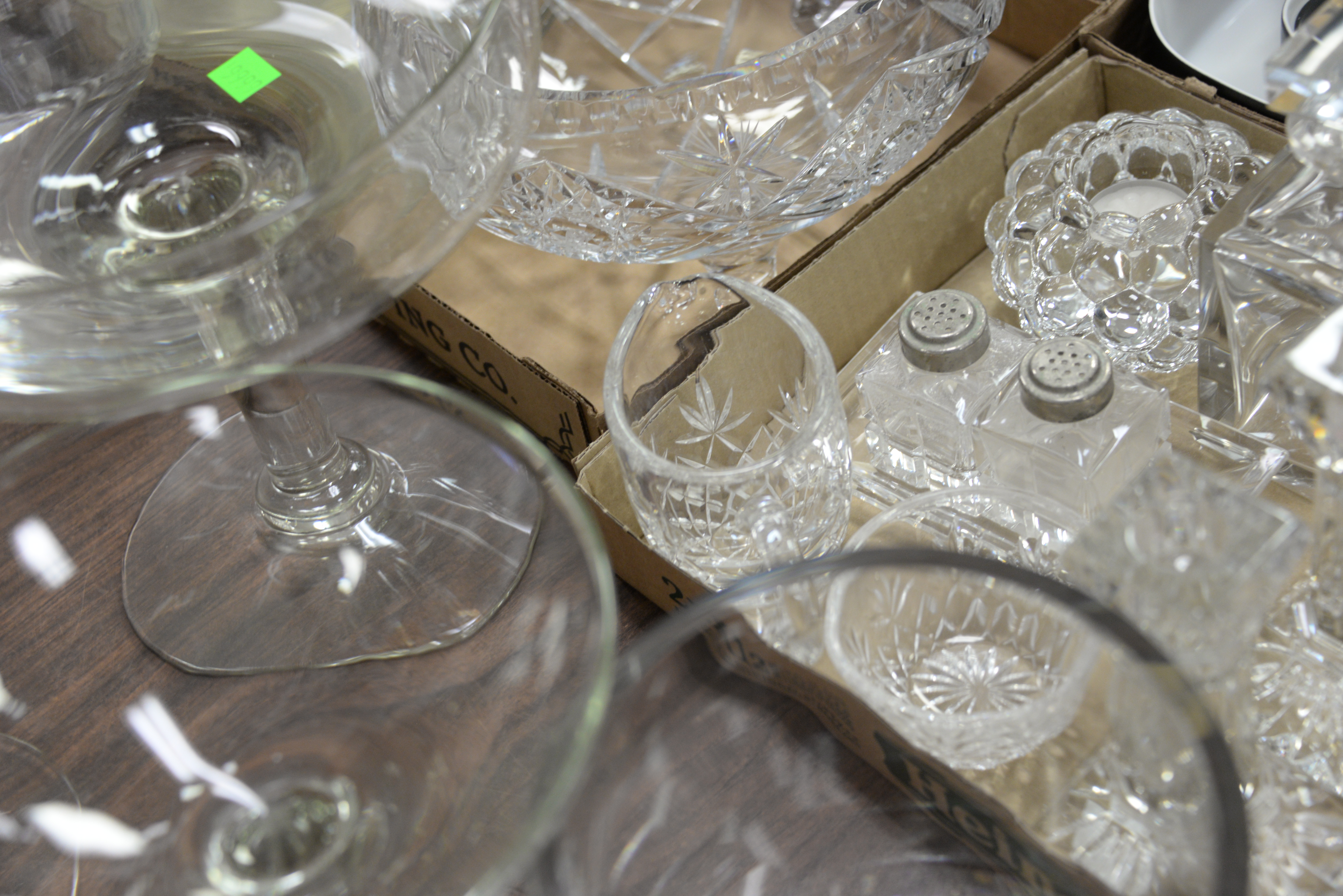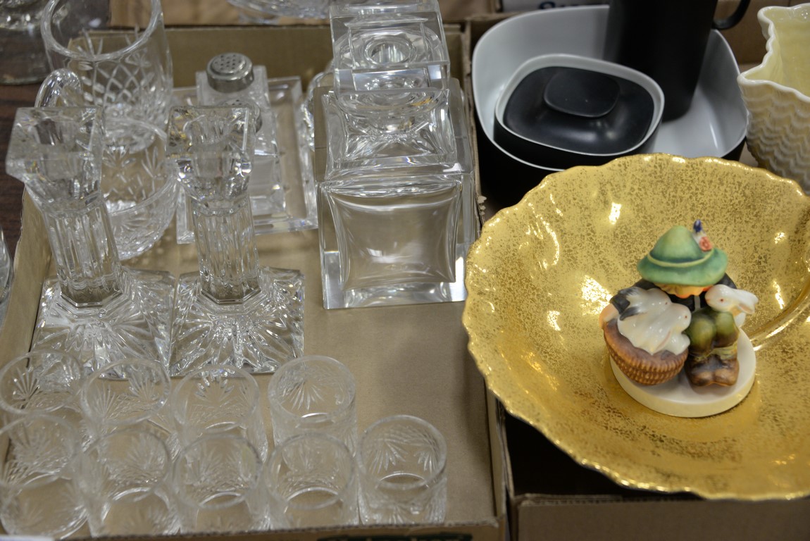 Large group of crystal to include Wedgwood crystal napkin rings, sugar and creamer, salt and pepper, Orrefors candle holder, pair of candlesticks, two decanters, three large stem compotes, four large vases, set of plates, large footed bowl, Belleek vase, Hummel, etc.