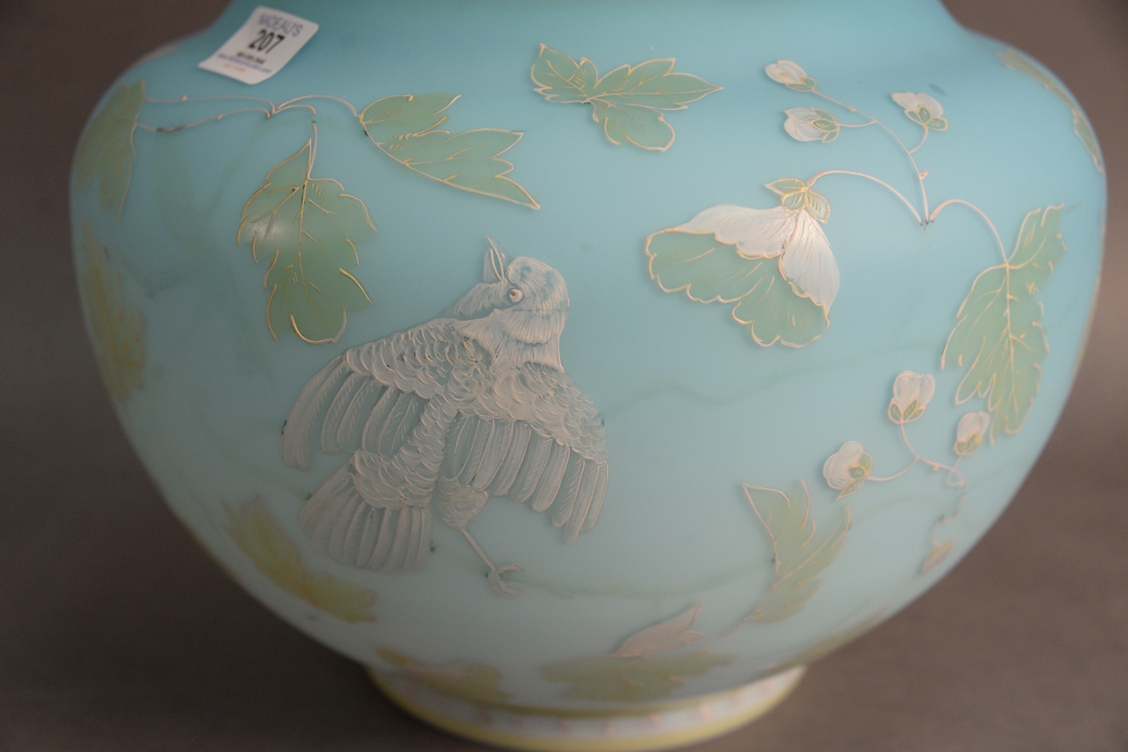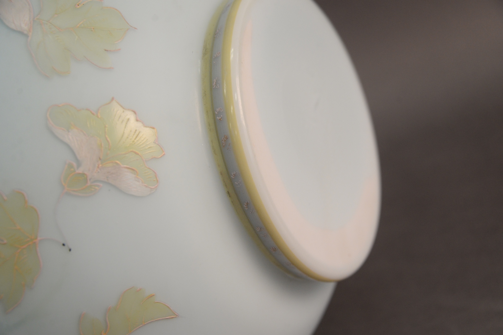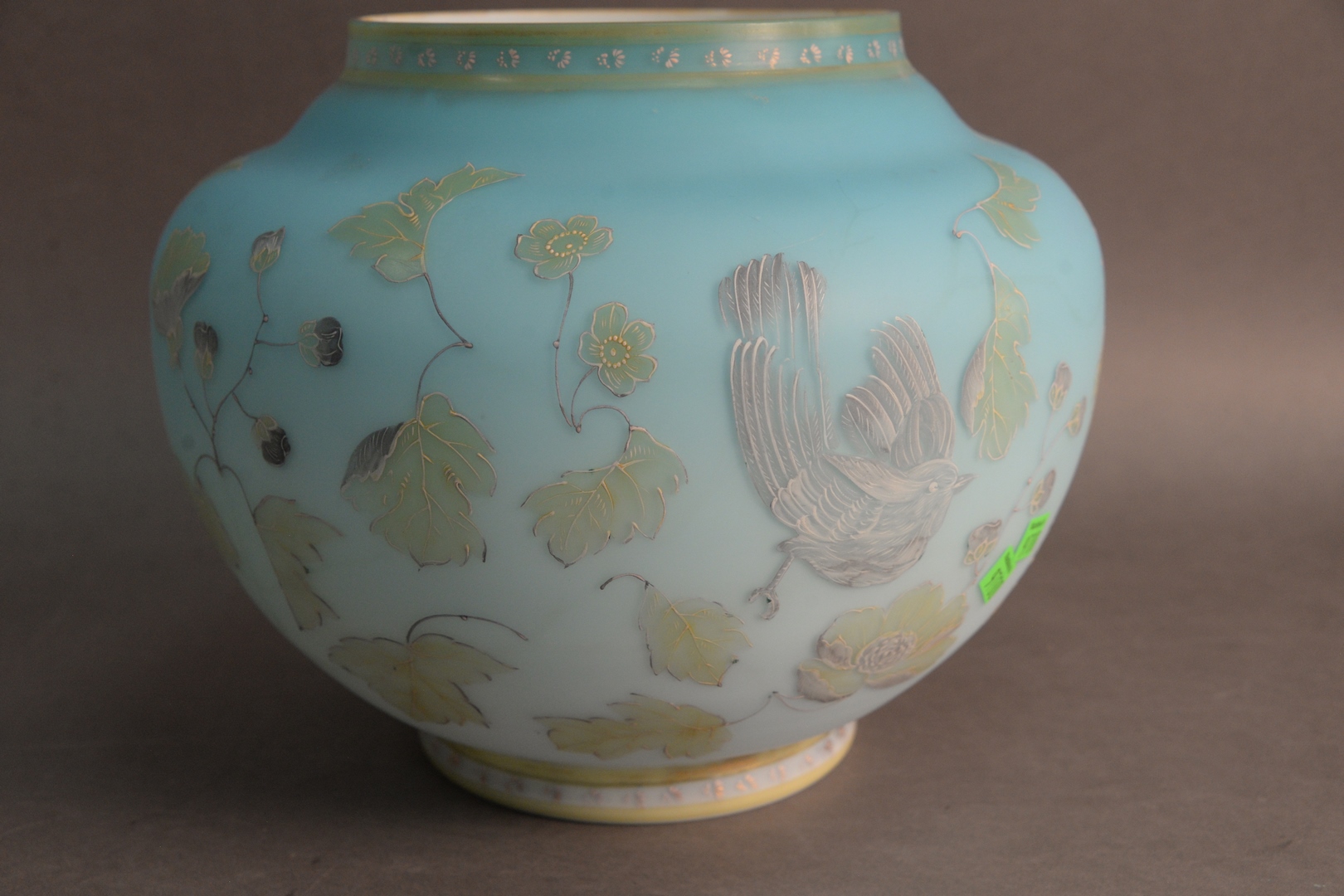 Lot 207: Large Turquoise Satin Glass Planter, having white and green floral enameling to the exterior, height 11 inches, width 13 inches. Provenance: Estate of James Wadhams.