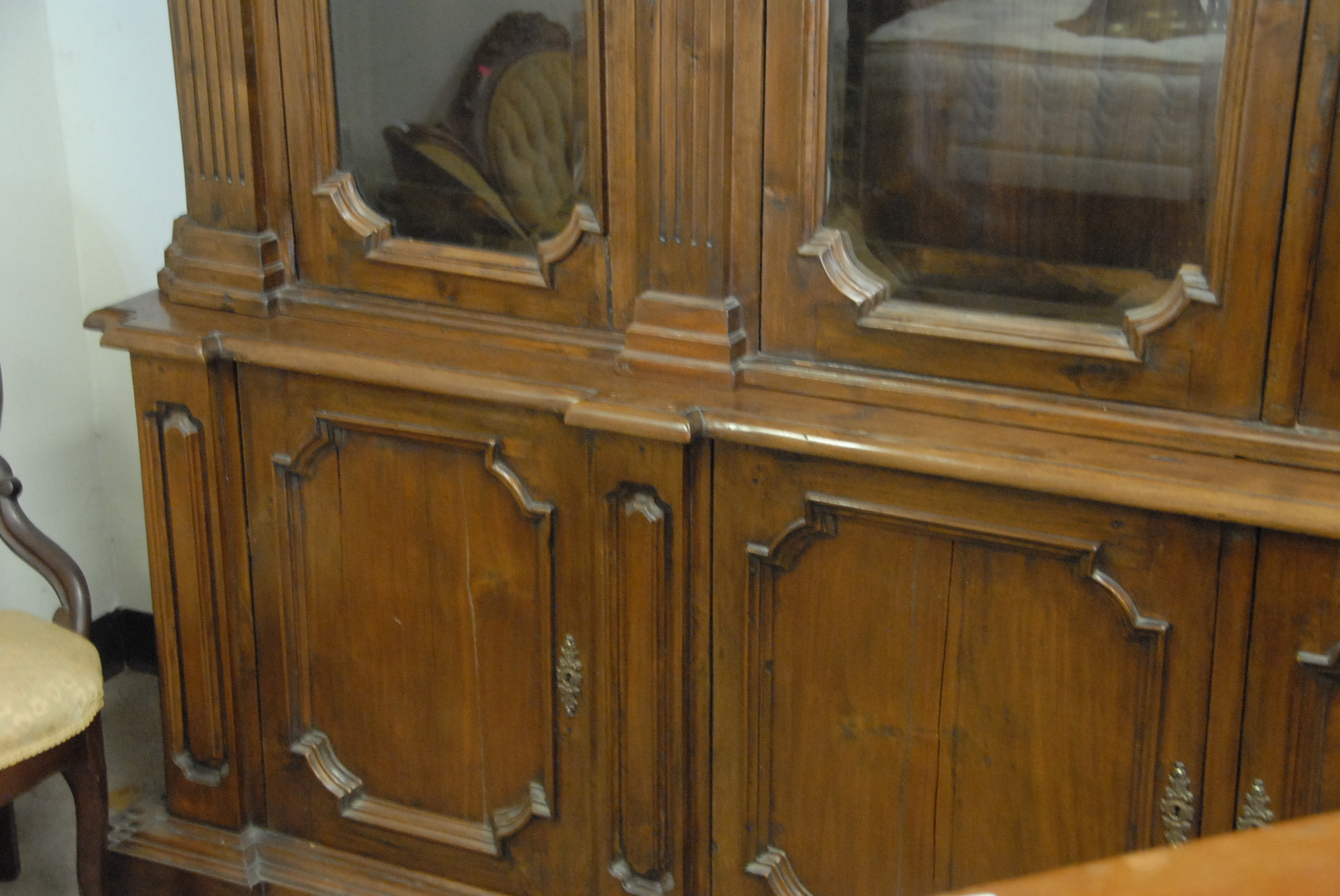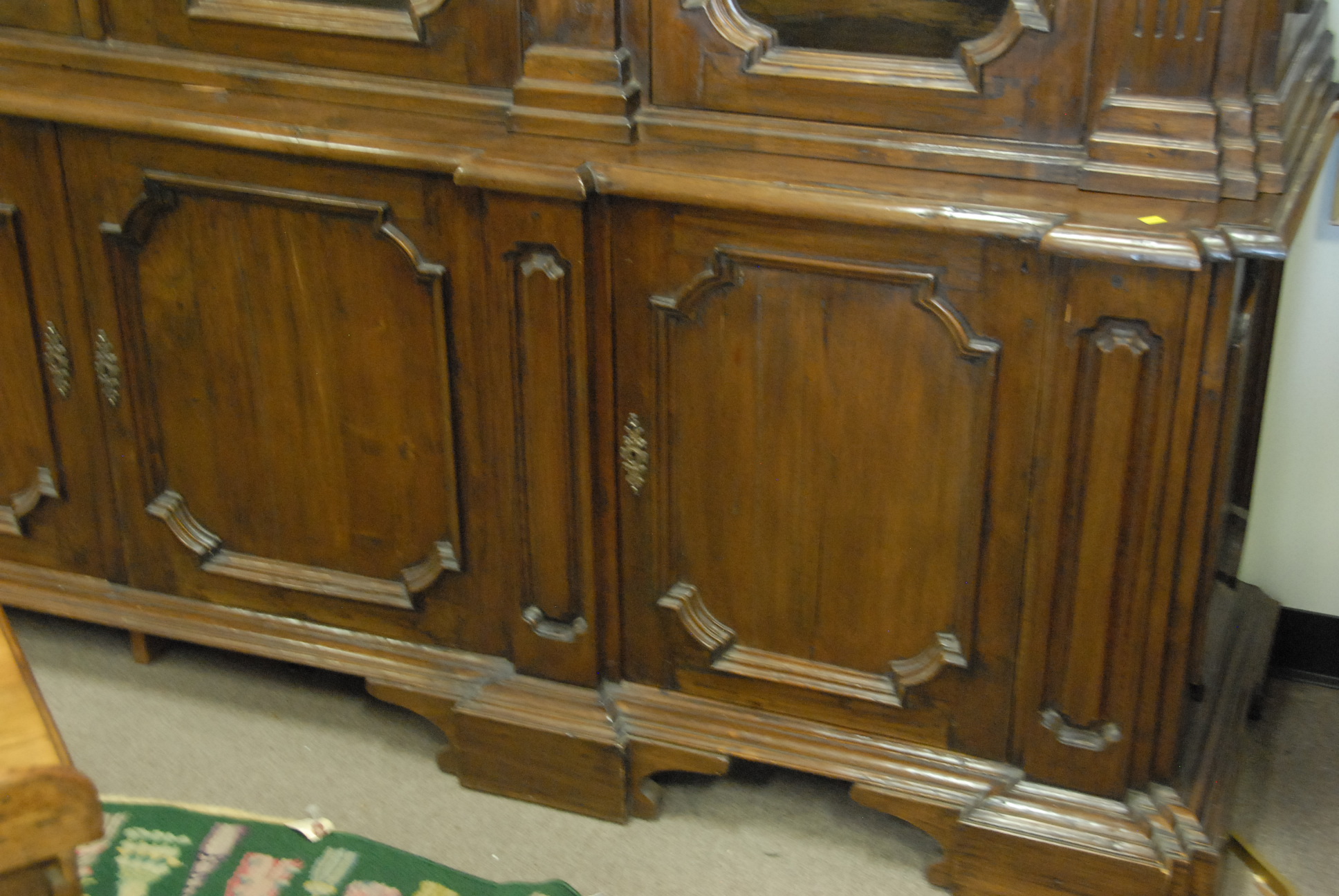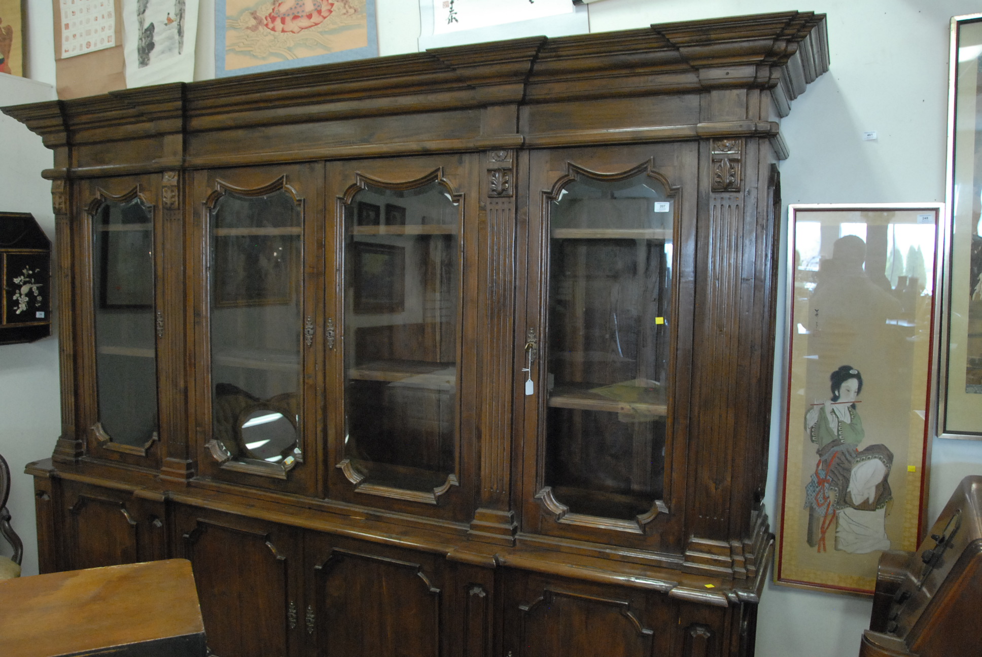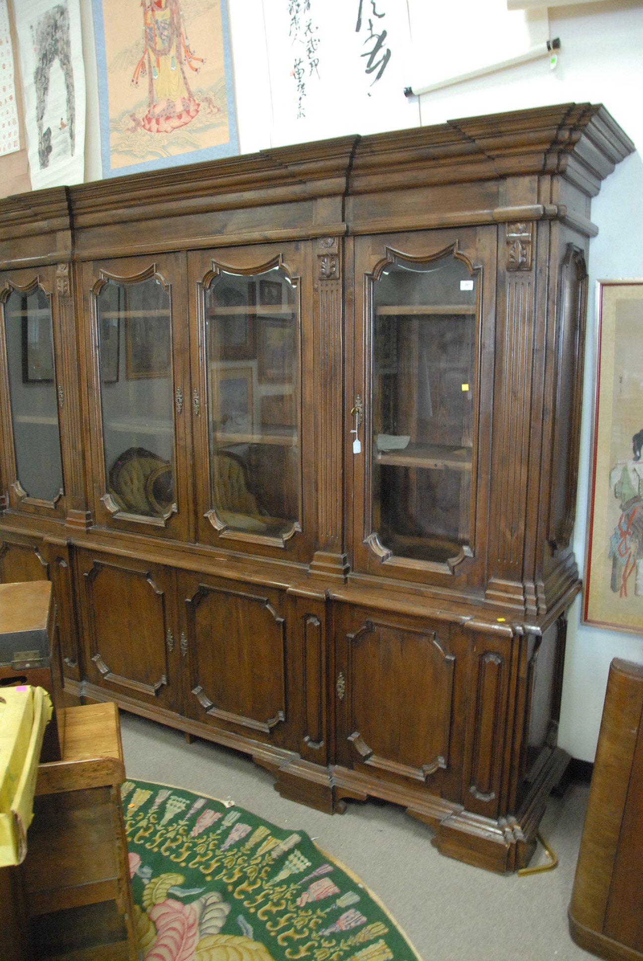 Large walnut two part breakfront having four beveled glass doors over four doors. ht. 87in., dp. 22in., lg. 117in.