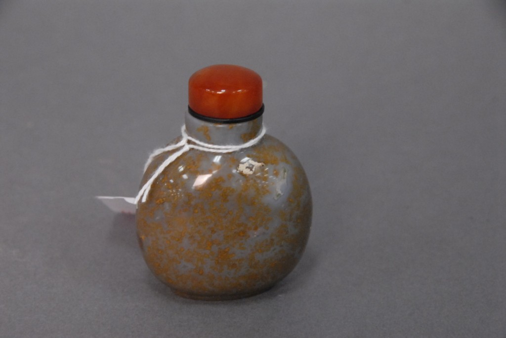 Moss agate snuff bottle, with agate top, 19th century, ht 2 3/4.