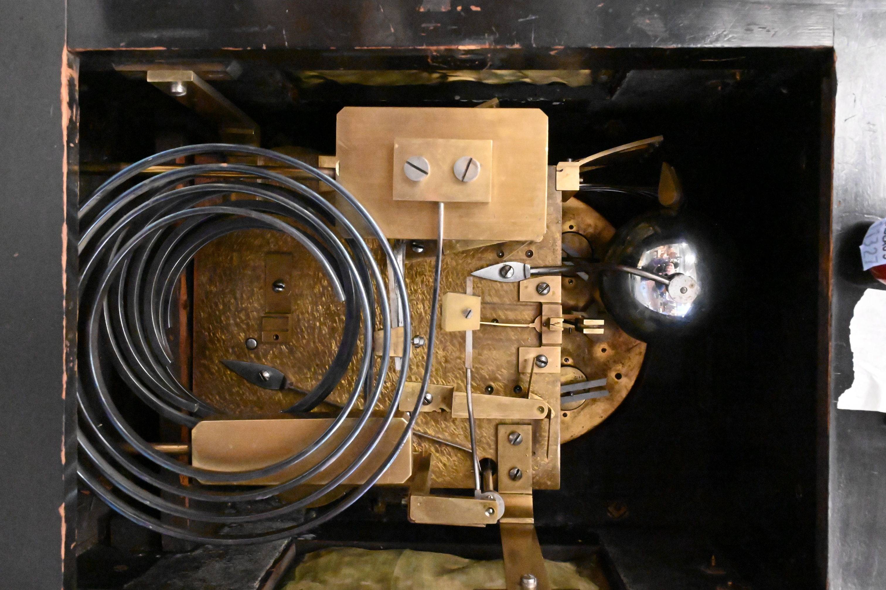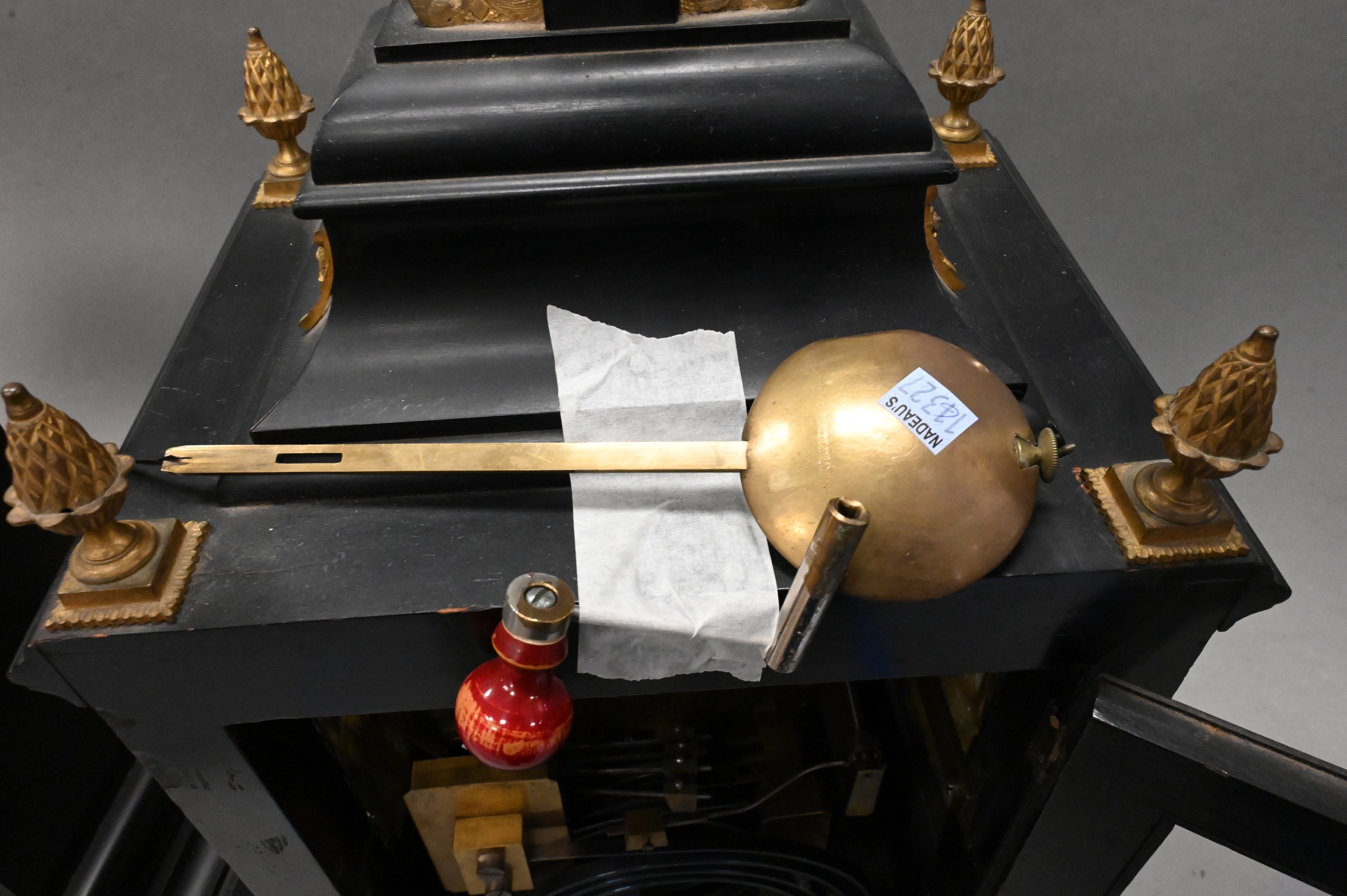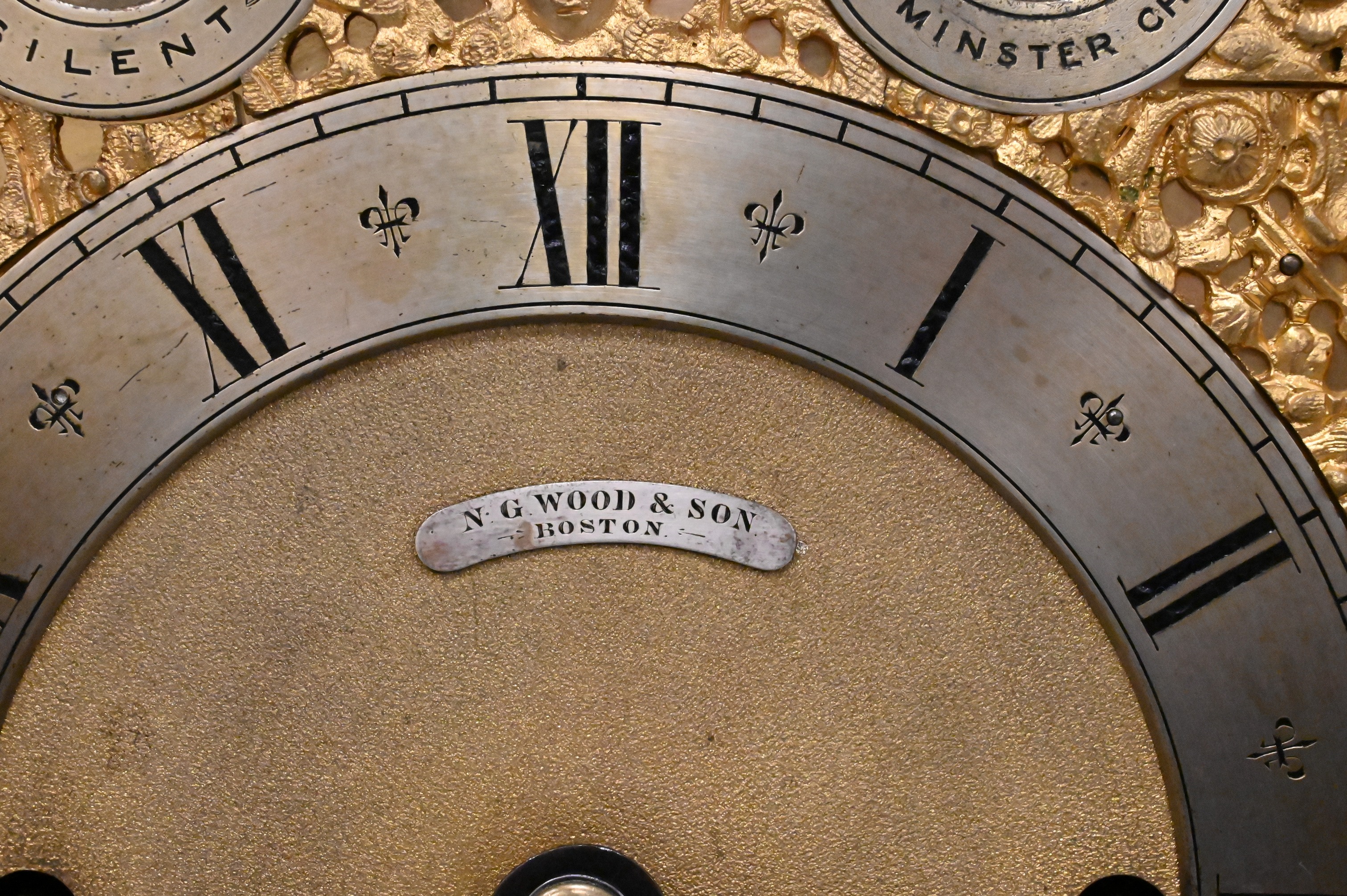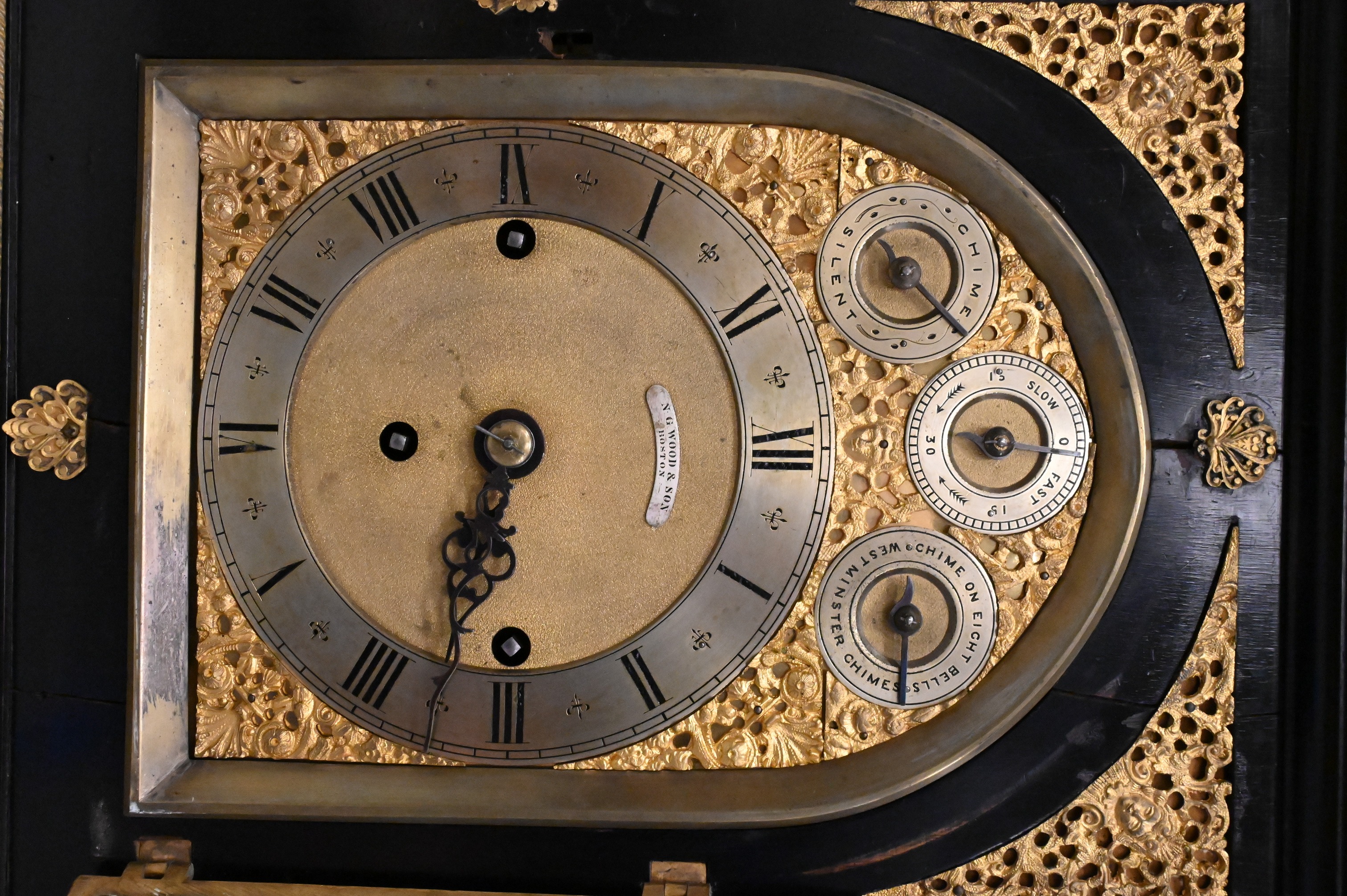 American ebonized bracket clock with gilt bronze mounts, the case decorated with applied gilt bronze garlands, pierced gilt bronze side panels, gilt bronze side handles, and gilt bronze scrolled feet, surmounted by finials. arched gilt dial signed “N. G. Wood & Son, Boston,” with Roman numeral chapter ring and three subsidiary dials for chime/silent, regulator, and Westminster chime selection, the brass works movement striking on a coiled gong.