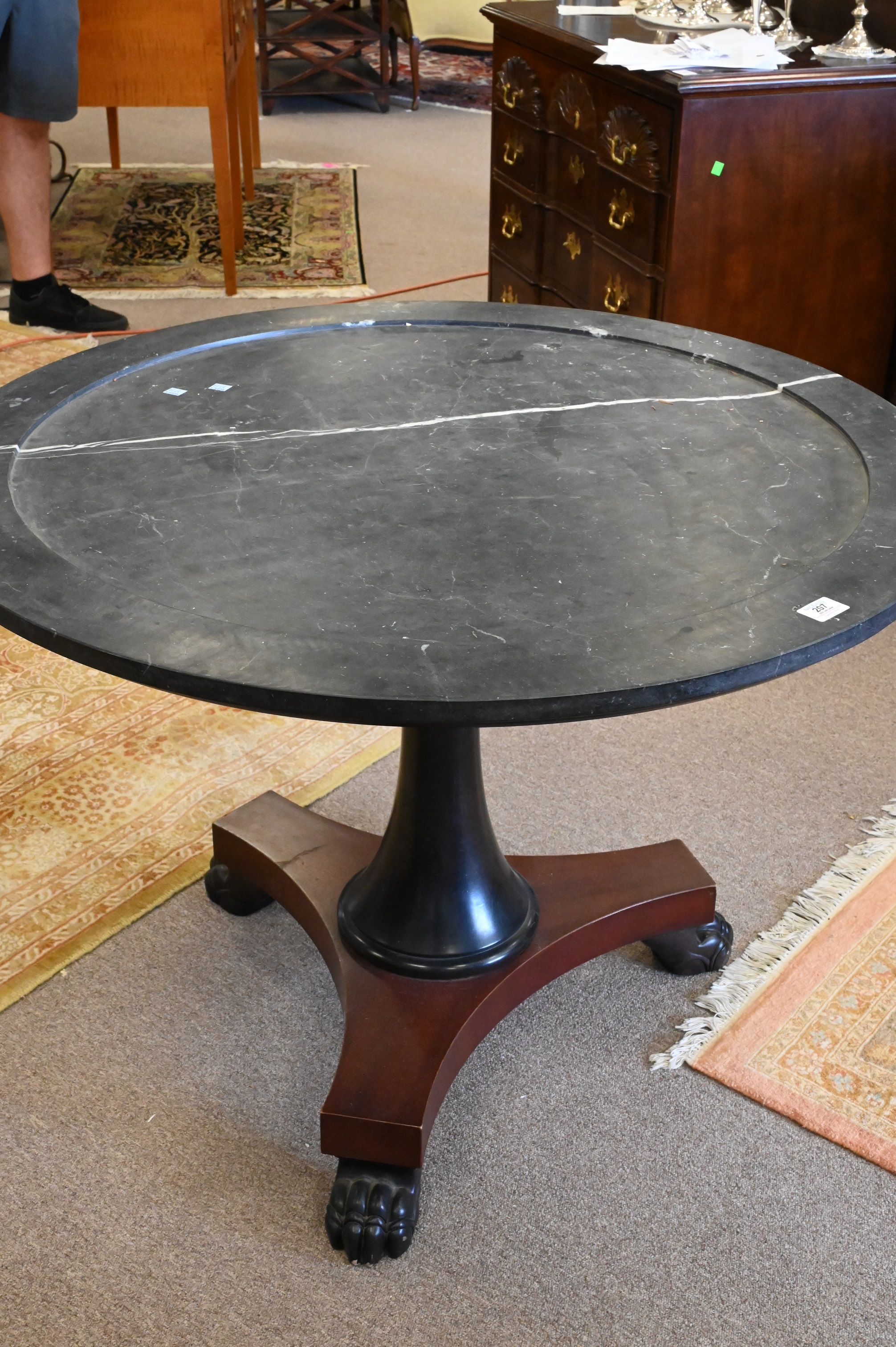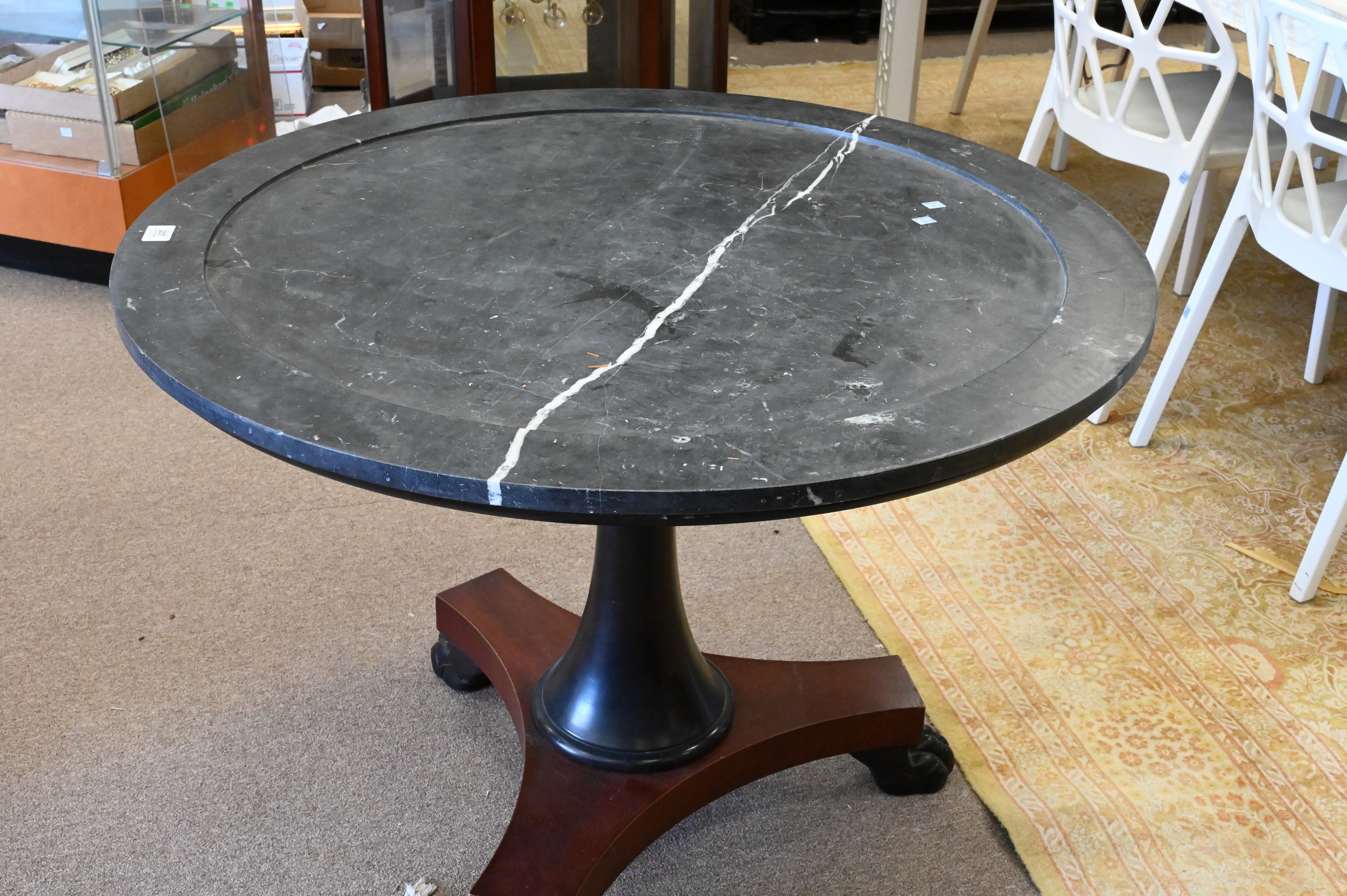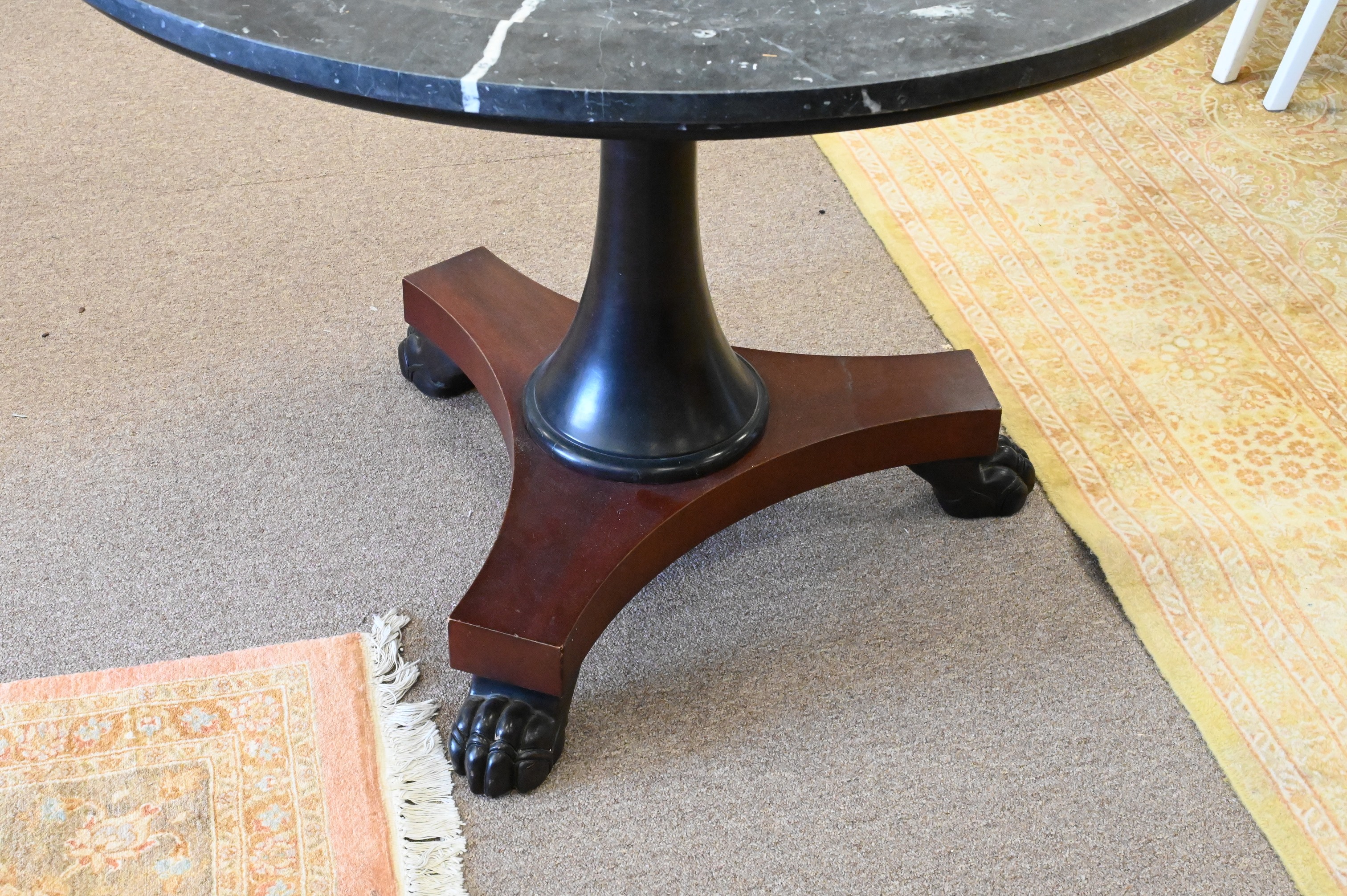 Ralph Lauren Marble Top Round Center Table, set on mahogany pedestal base, ending in carved paw feet, slight crack to top, height 28 inches, diameter 38 1/2 inches.