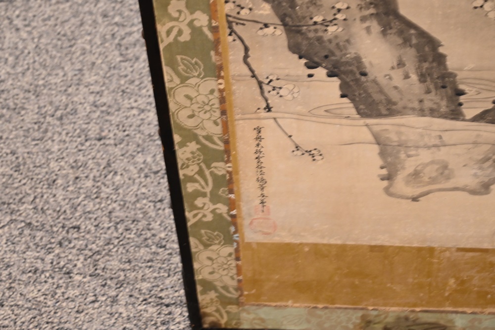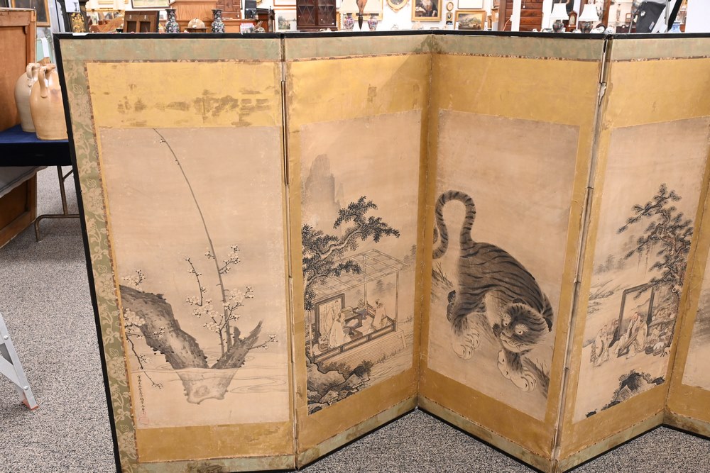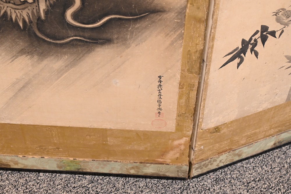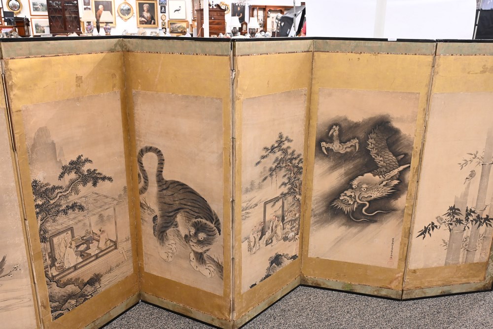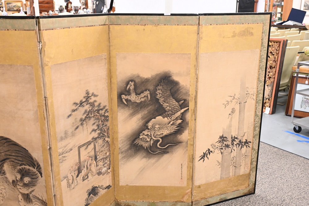 Lot 207: Six Fold Japanese Dressing Screen depicting village and three claw dragon height 54 inches, length 132 inches