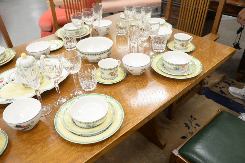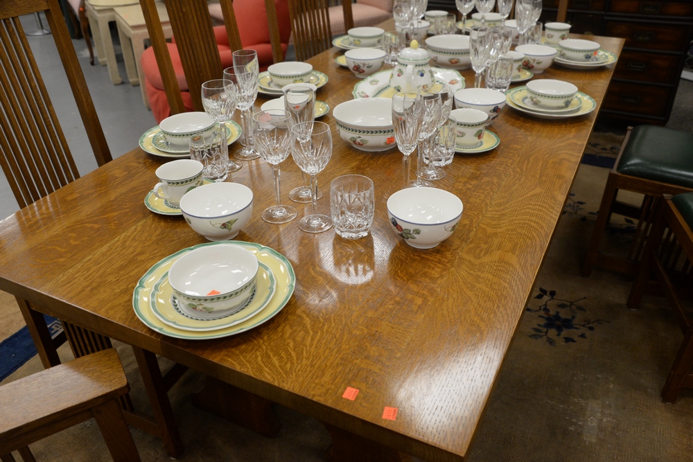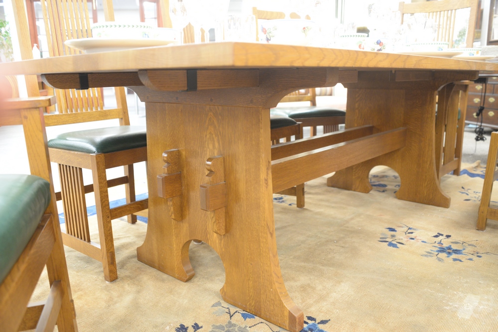 Lot 207: Stickley Oak Trestle Base Dining Table, marked throughout the underside, height 30 inches, top 42″ x 90″.