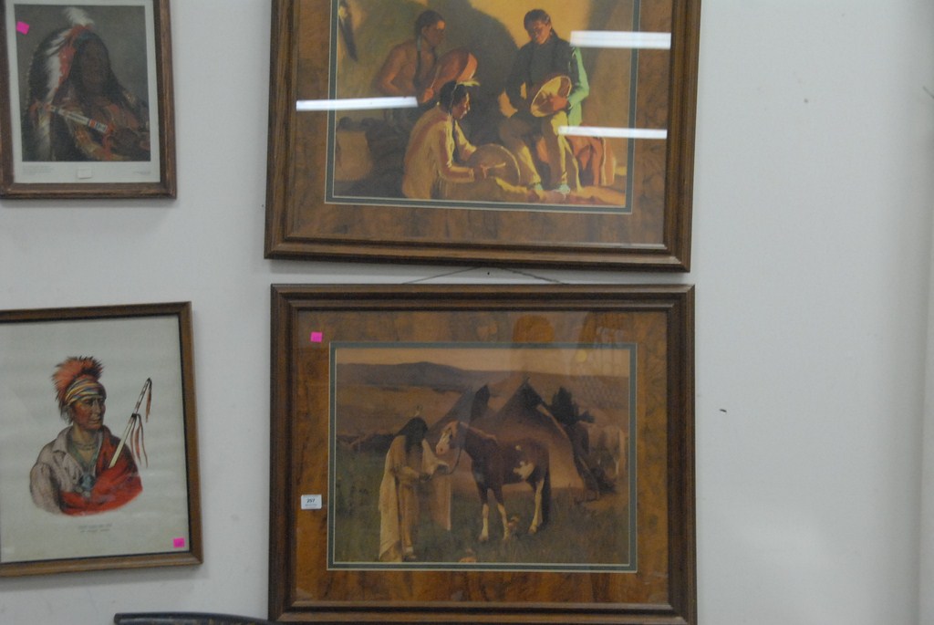 Lot 207: Ten piece framed lot including oil on board of navy ship USS Nevada, four Indian prints, possible reproduction Pennsylvania Dutch fr…