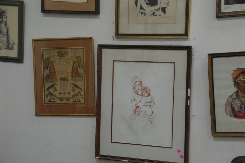 Ten piece framed lot including oil on board of navy ship USS Nevada, four Indian prints, possible reproduction Pennsylvania Dutch fraktur.