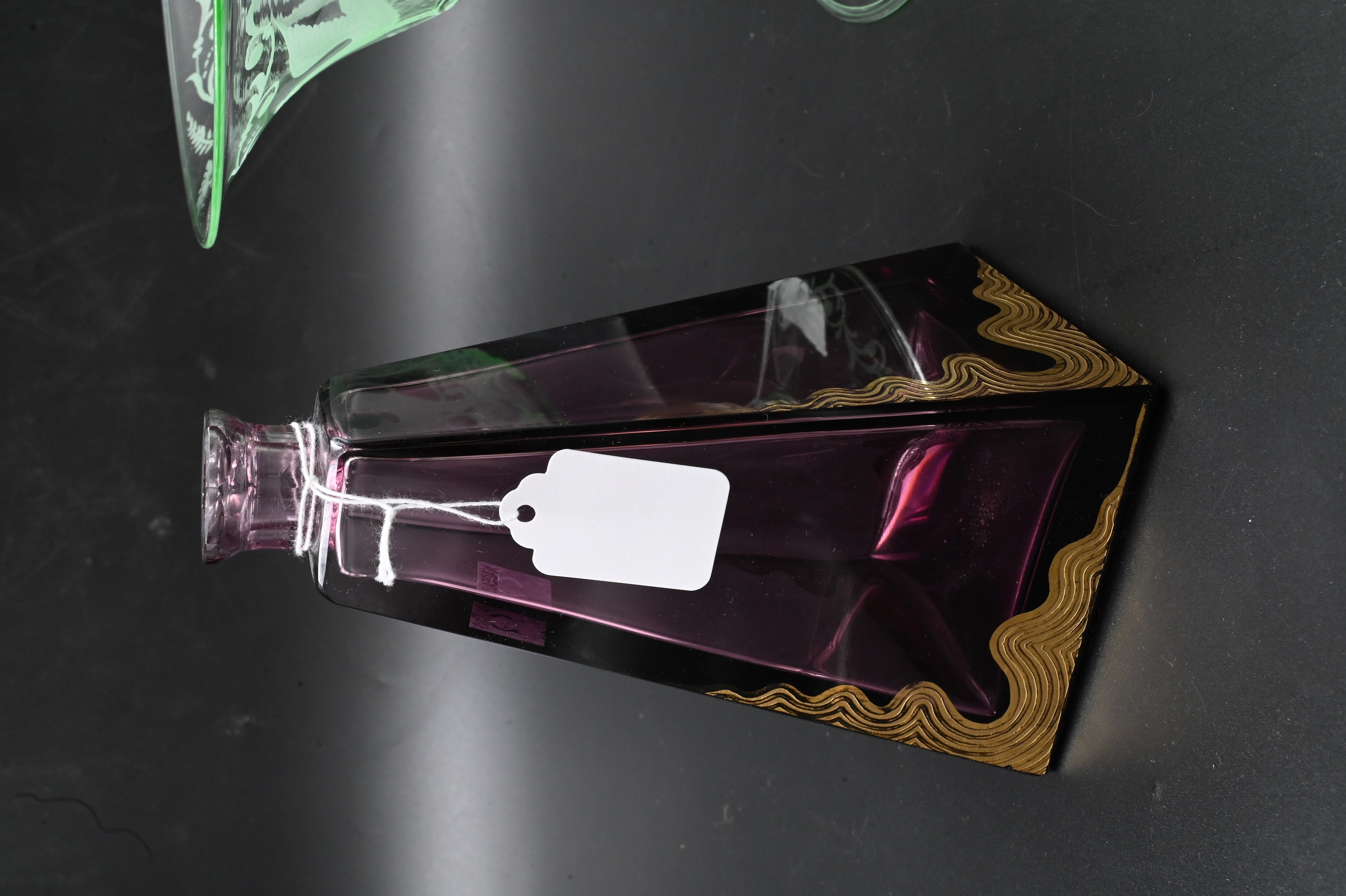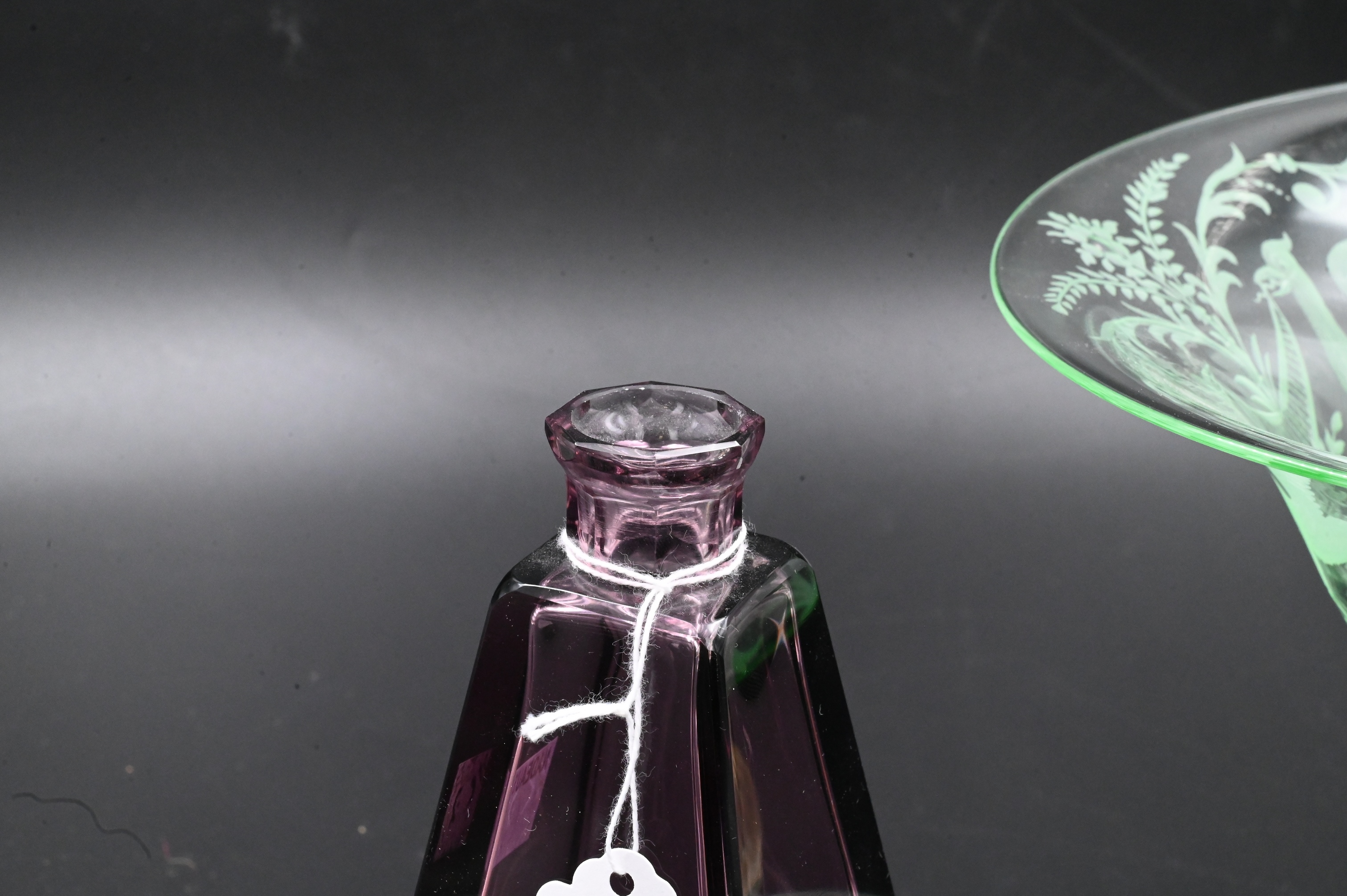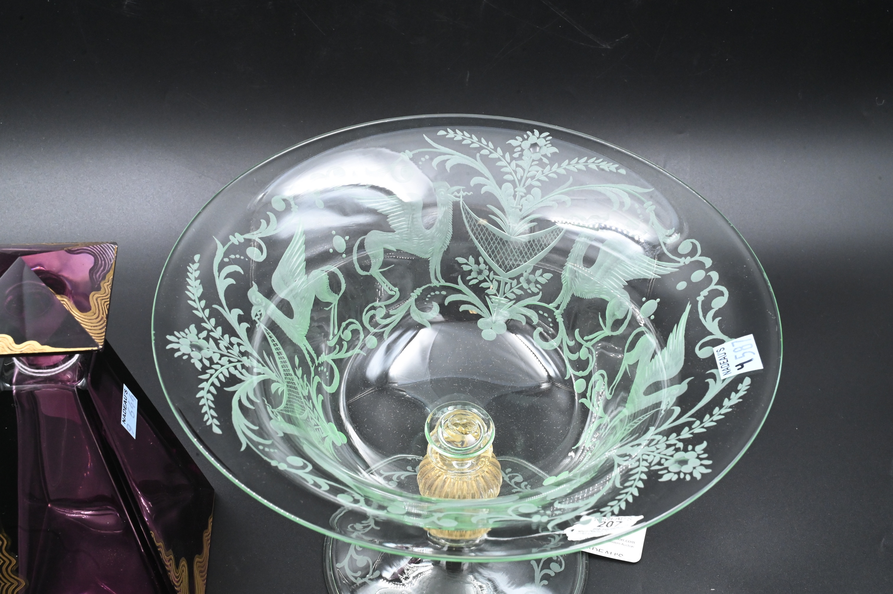 to include amethyst bottle with stopper and gilt highlights attributed to Moser, and a Murano glass pedestal dish having frosted griffin and floral motif