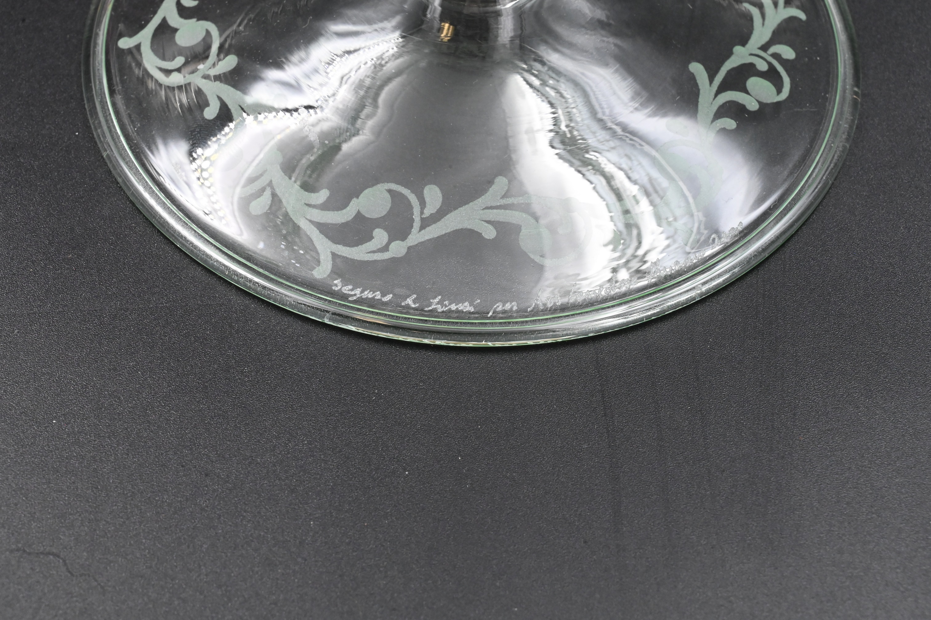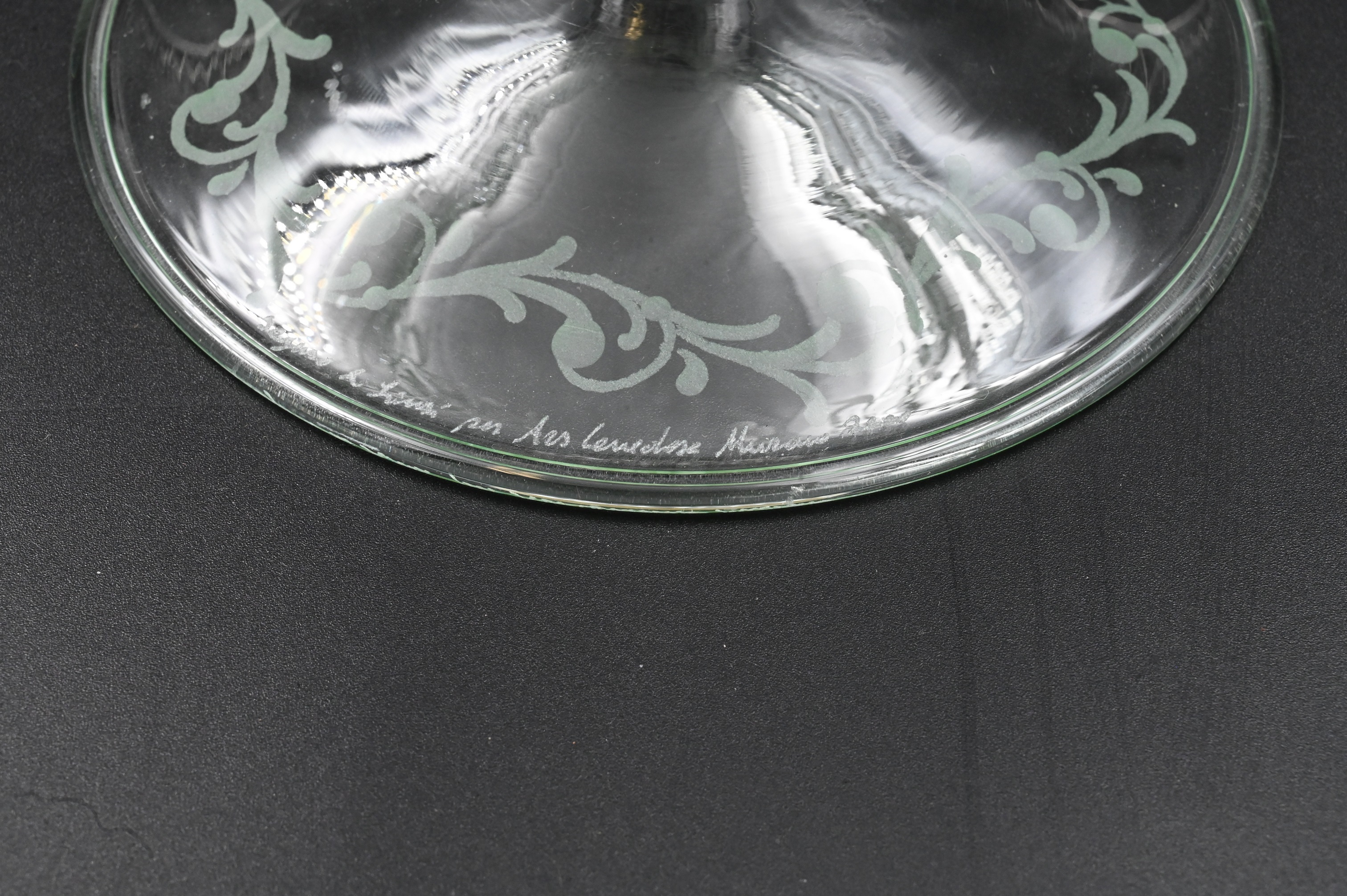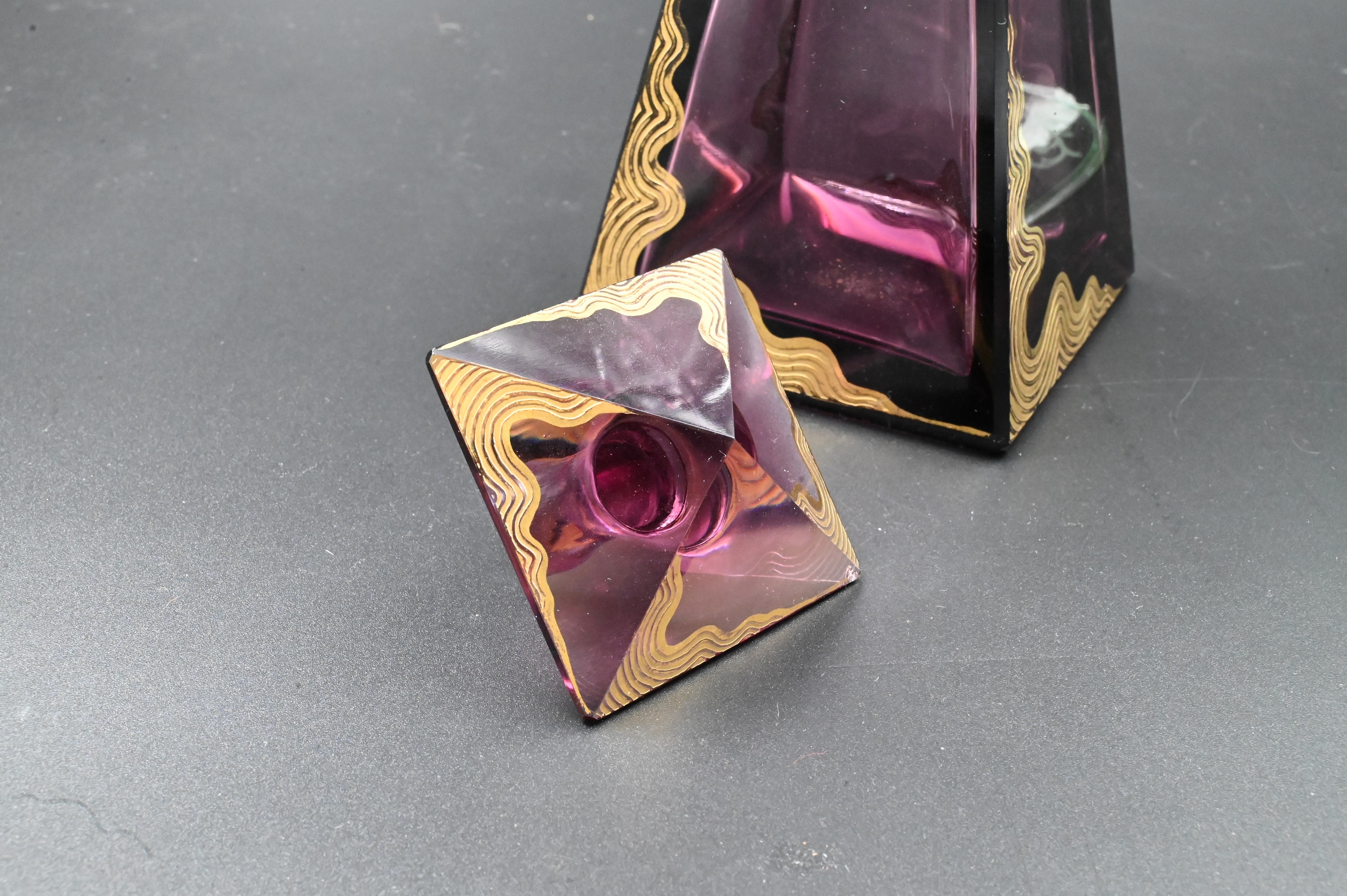 to include amethyst bottle with stopper and gilt highlights attributed to Moser, and a Murano glass pedestal dish having frosted griffin and floral motif