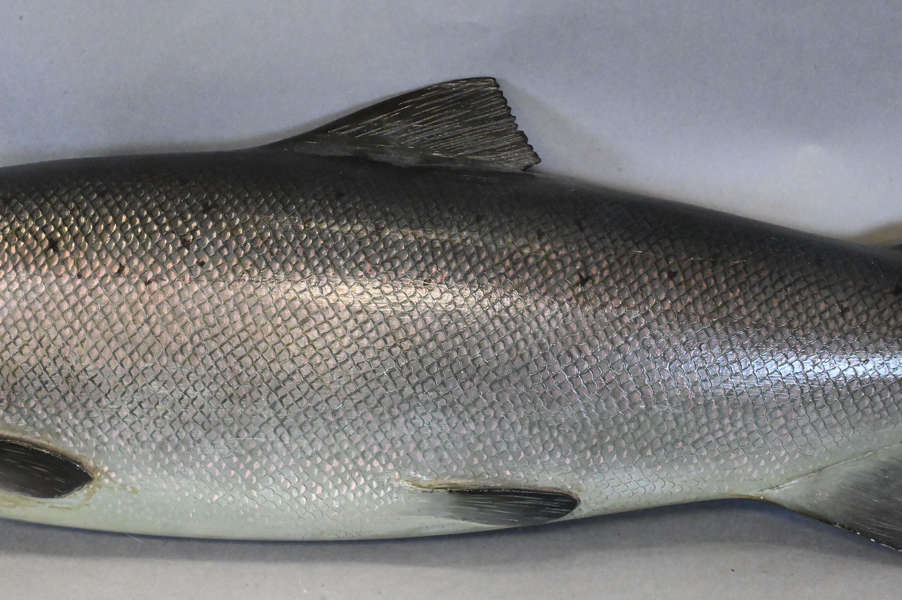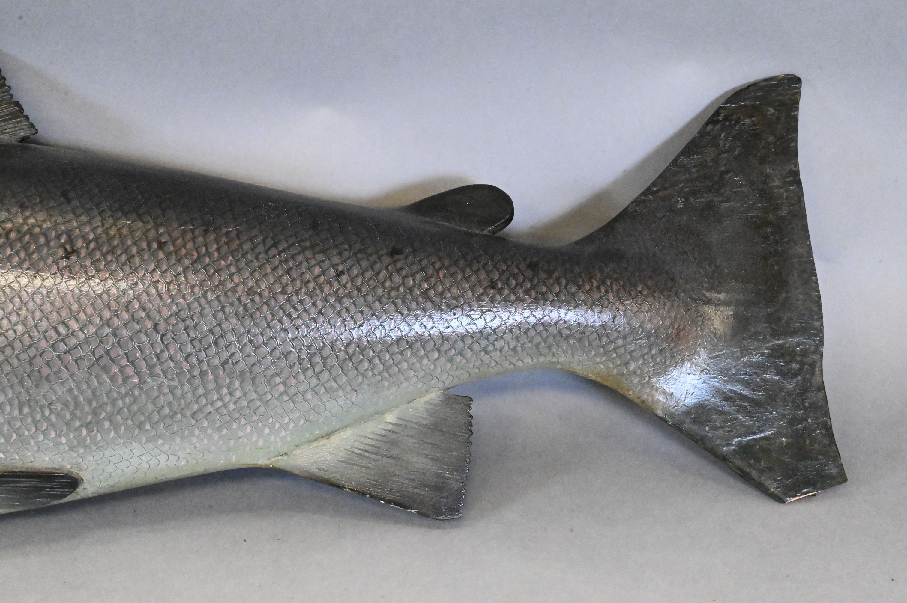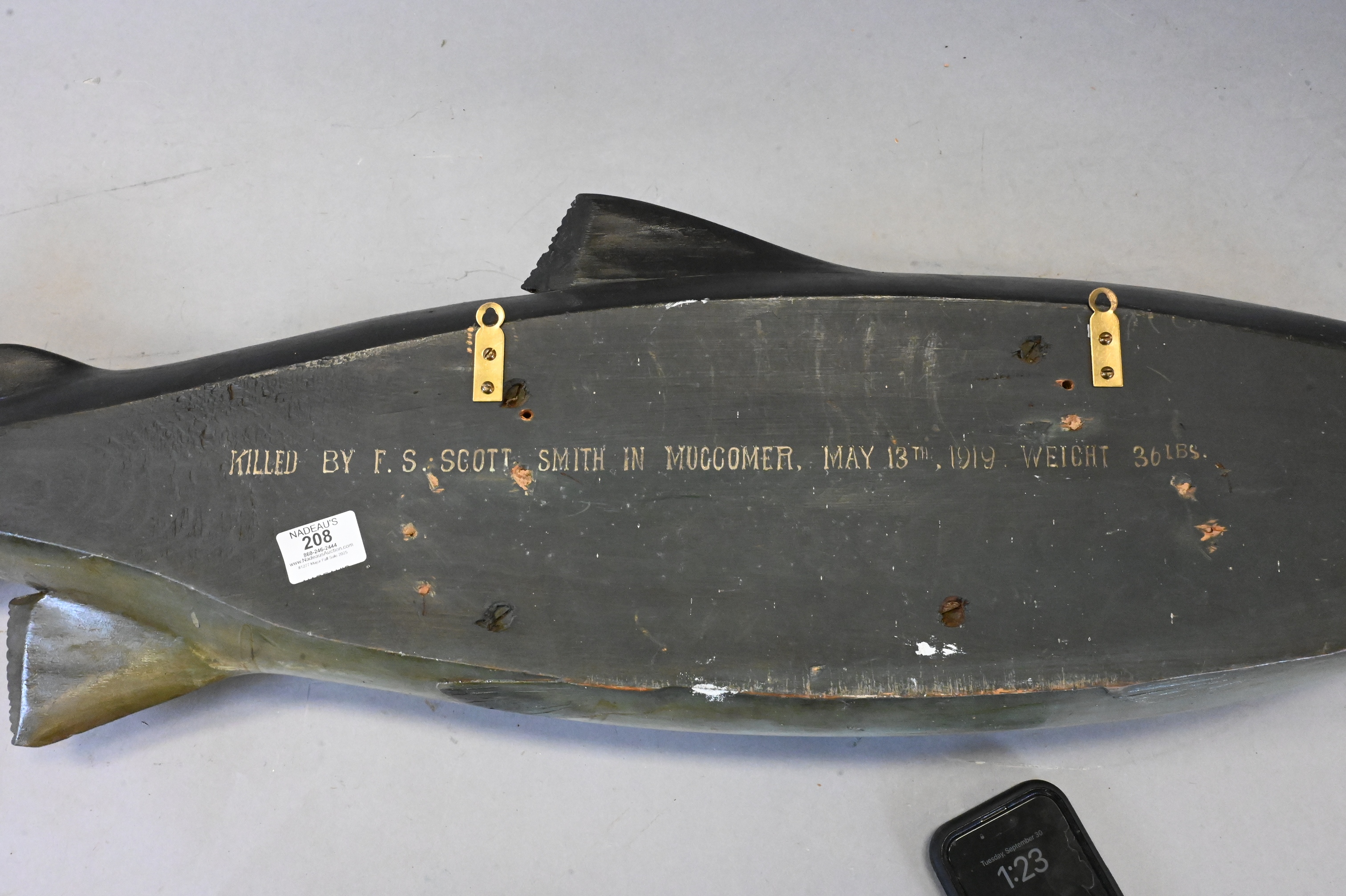 painted on back “killed by F.S. Scott Smith in Maccomer, May 13th, 1919, weight 36 lbs” one tail fin repaired and one tip missing
