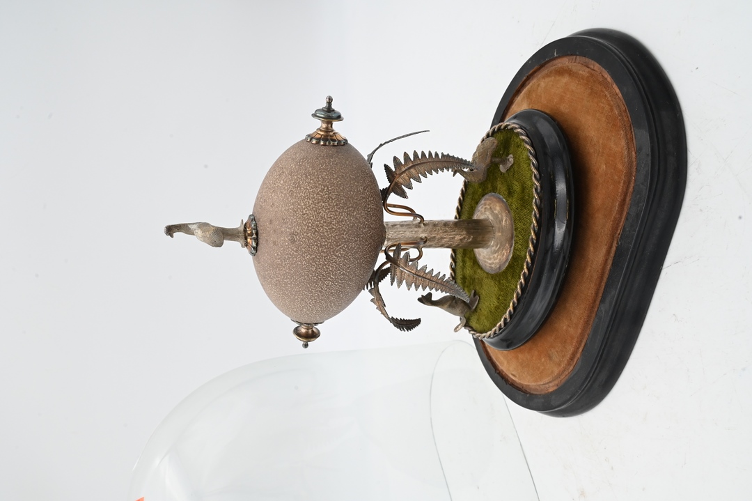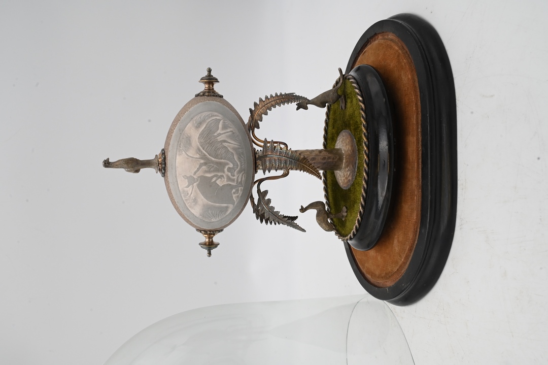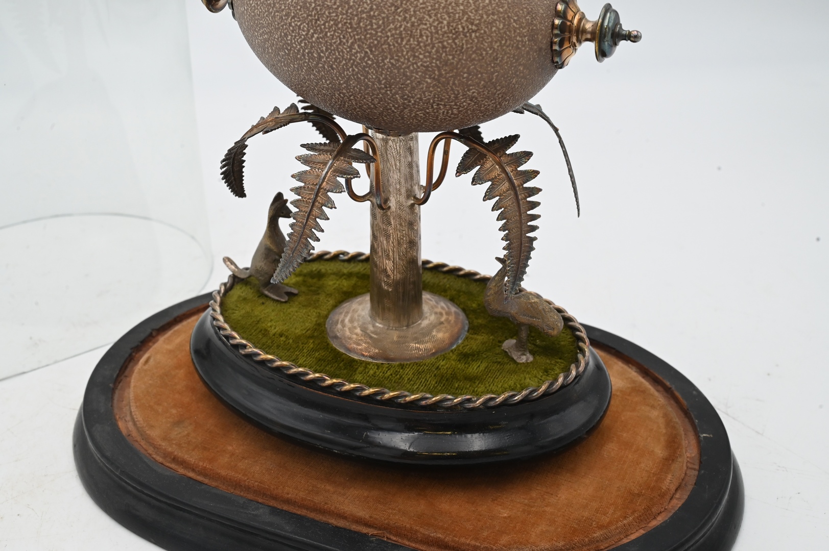 Australian Carved Emu Egg, resting on a silver plated tree, emu and wallaby on oval base, along with glass dome top, height 13 1/2 inches.