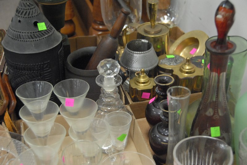 Lot 208: Box lot to include crystal, Bohemian decanter, pitcher, compote, paperweights, pair of hurricane candle lamps, bellows, tole lantern…
