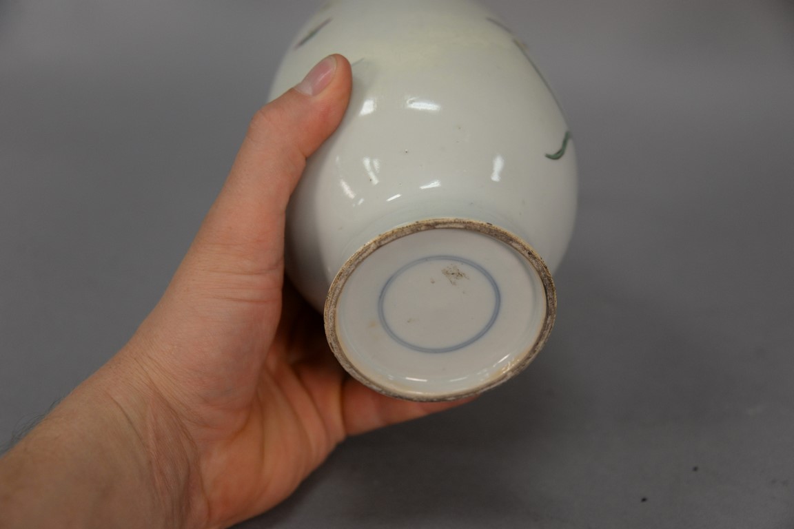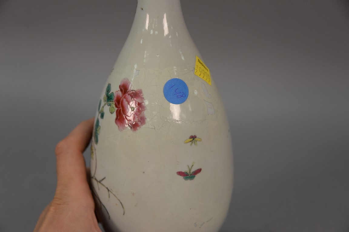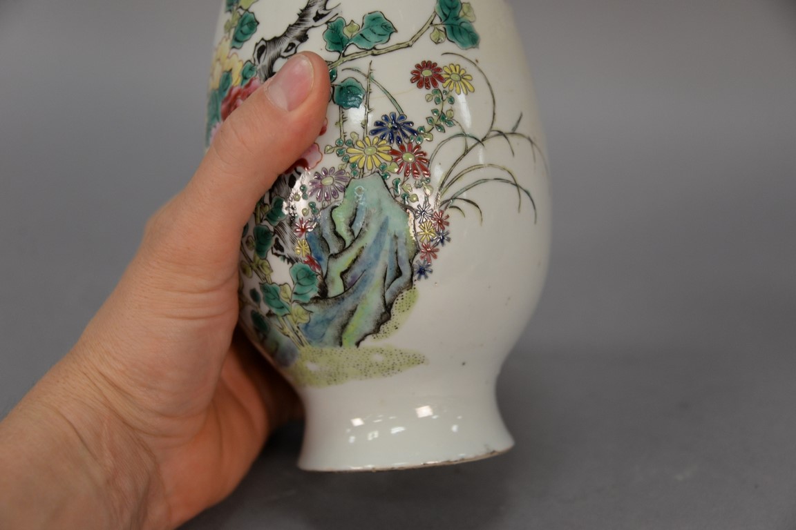 Lot 208: Chinese porcelain famille rose vase with painted wild flowers and birds, possibly Kangxi as is broken and repaired. ht. 12in.