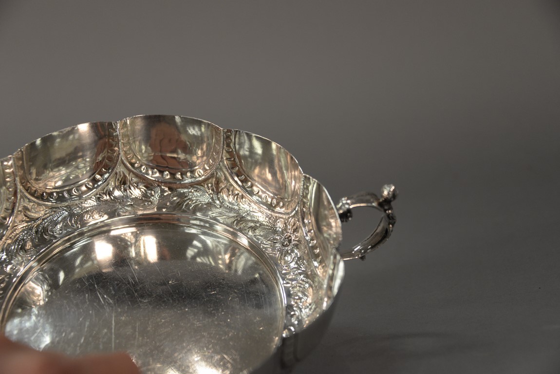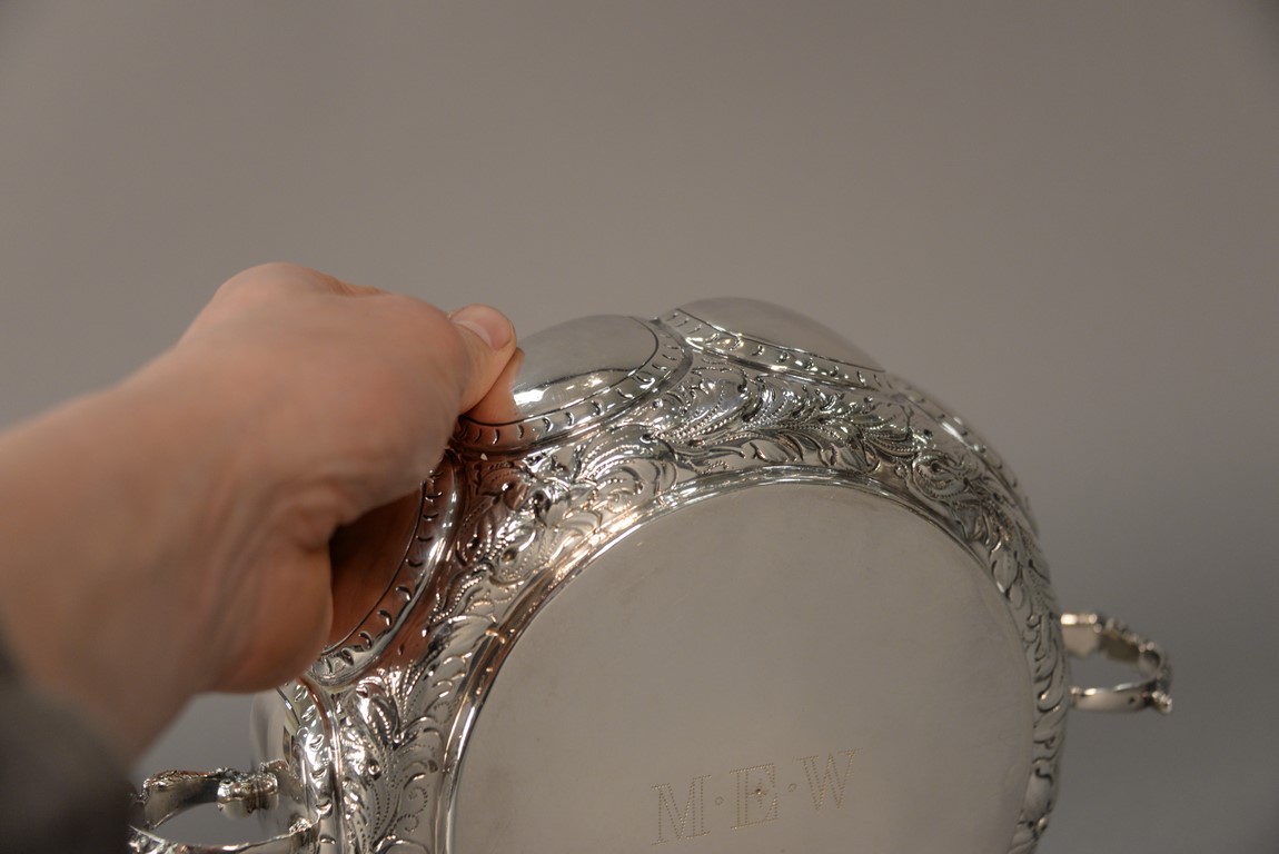 Lot 208: English silver bowl with figural handles. ht. 2 1/2 in. wd. with handles 11 1/2 in. 19.4 t oz.