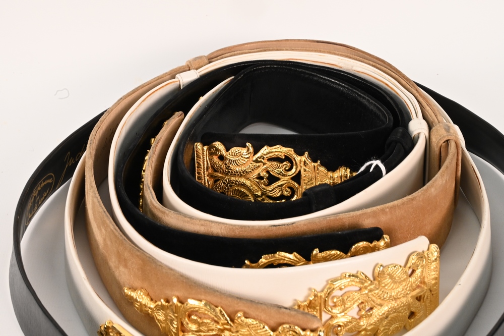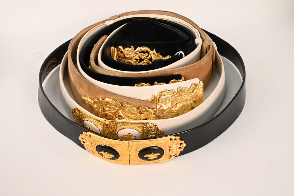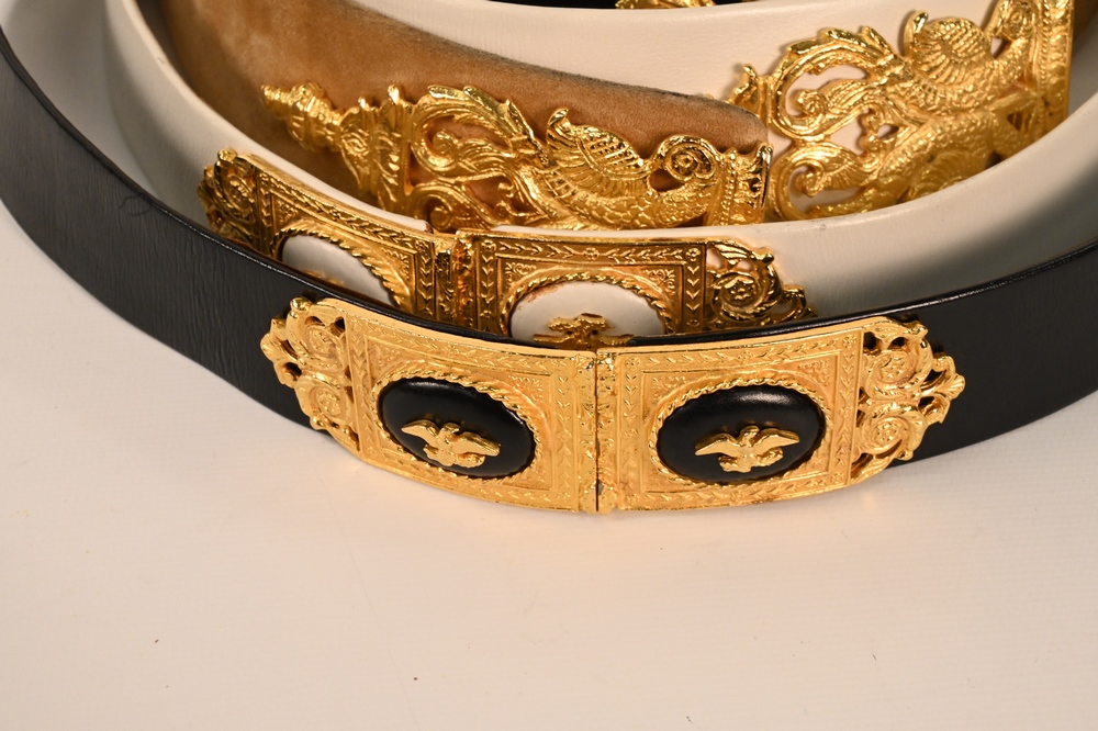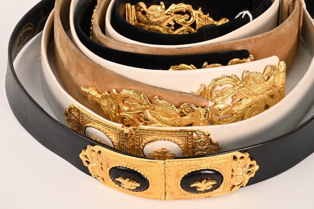 Five Piece Lot, to include two Judith Leiber belts, black, tan and white with matching belt buckles, along with a black and white having matching belt buckles.