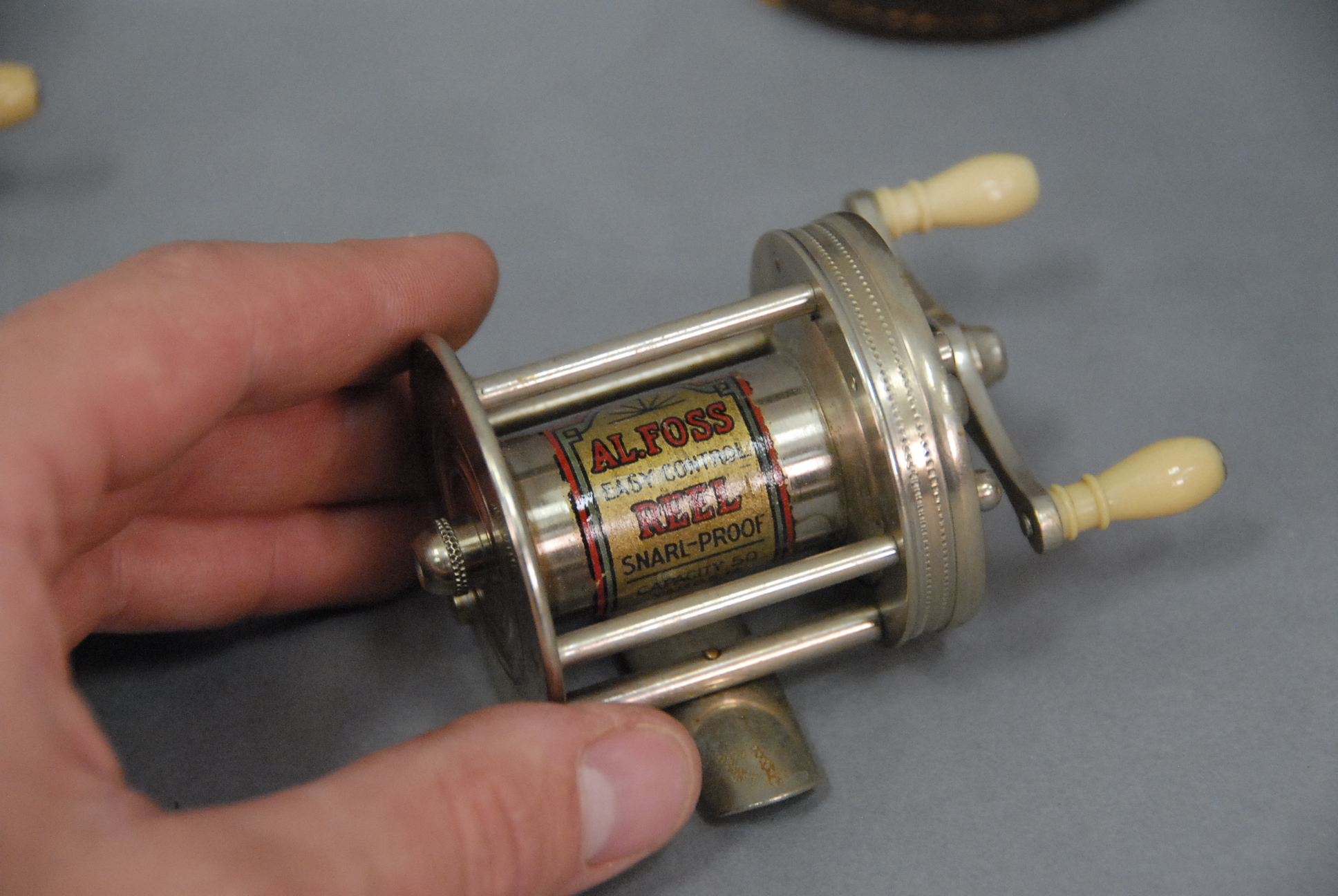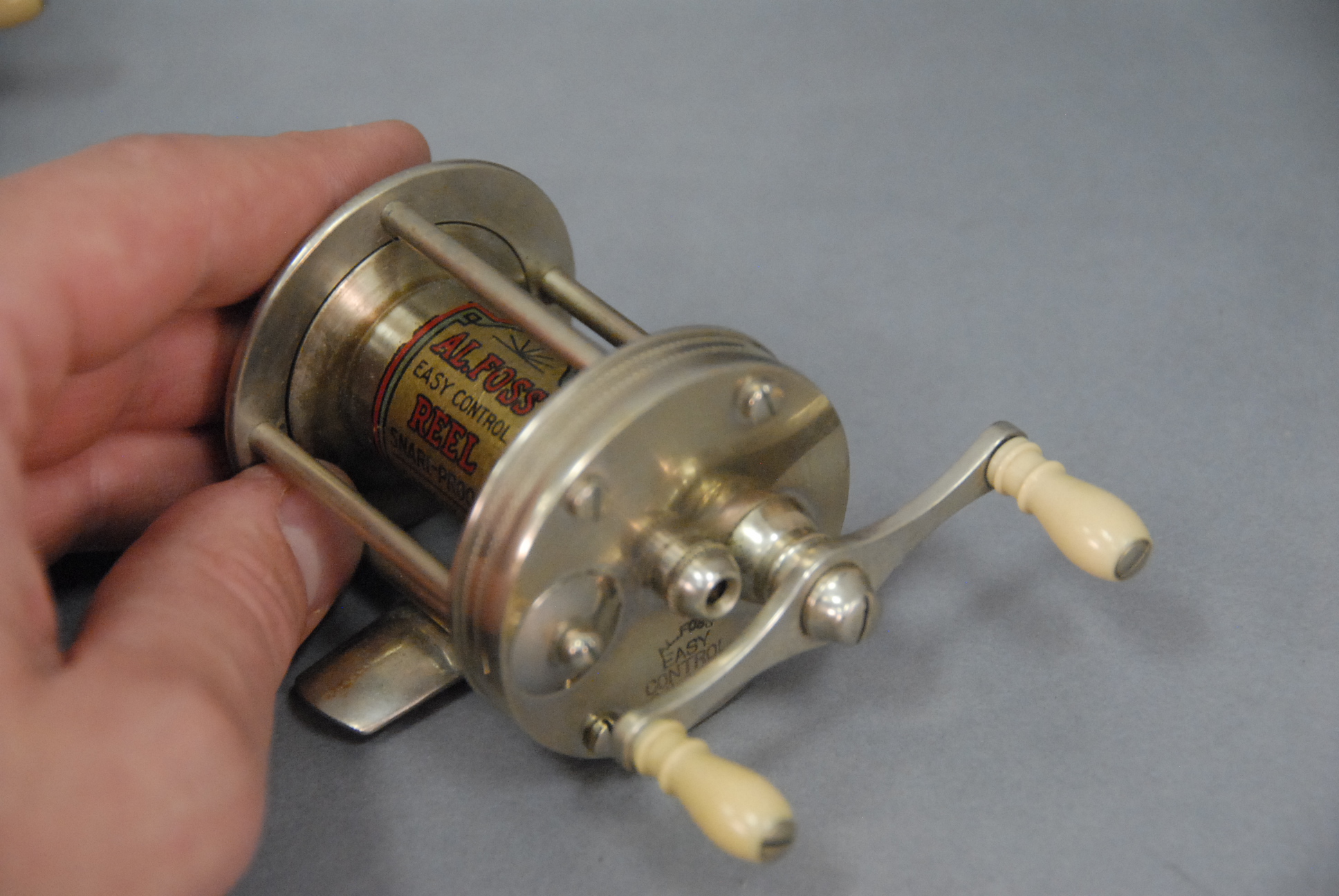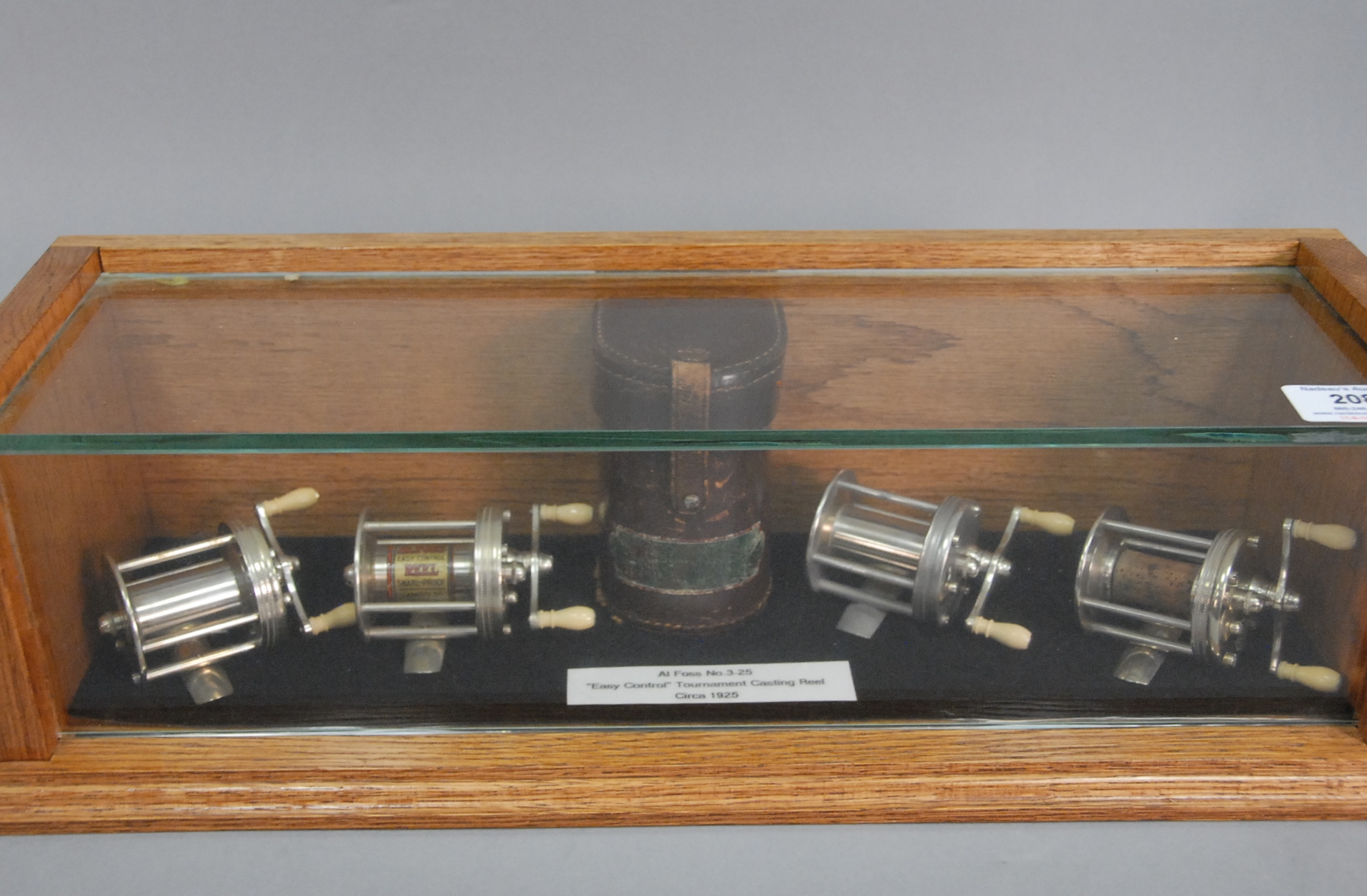 Four Al Foss German silver Easy Control tournament casting reels including one with cork spool, one with original paper label, and other two in excellent condition, one original leather case, all in an oak glass showcase.